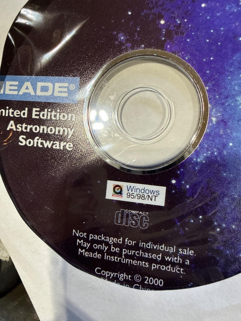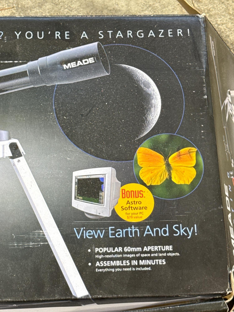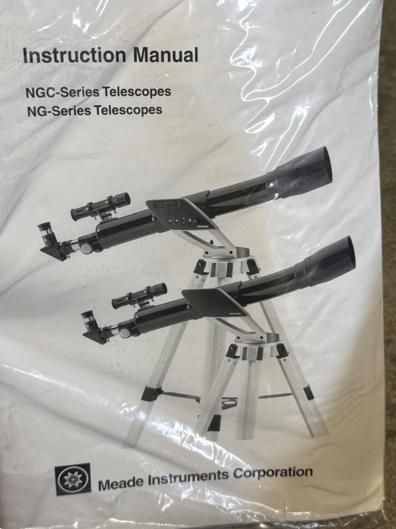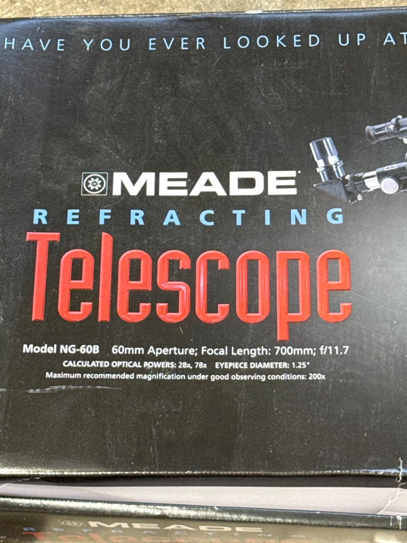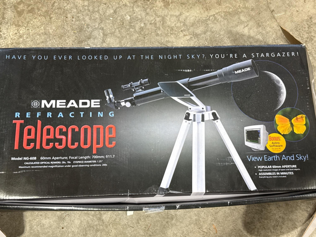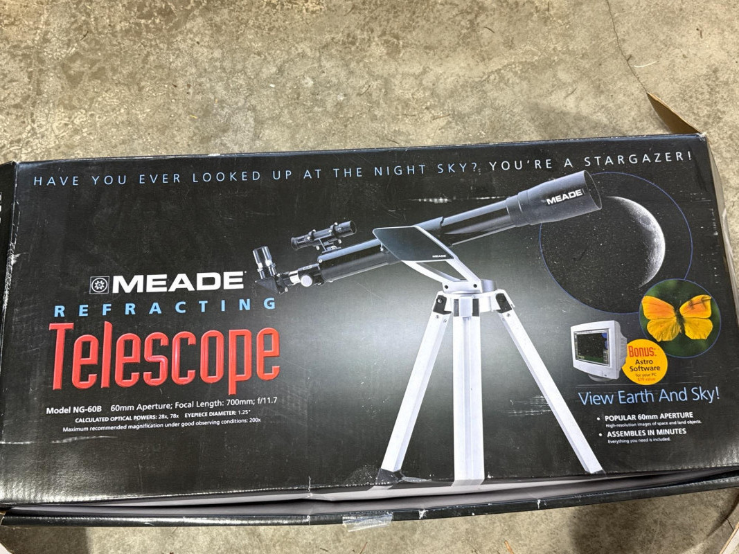 Meade refracting telescope kit (Model NG-60) in new-in-box condition. A quick inventory was performed, and all components appear to be present and in original packaging. Features a 60mm aperture and 700mm focal length, ideal for beginner stargazing and basic terrestrial viewing. Includes eyepieces, tripod, mount, instruction manual, and original bonus astronomy software disc. Telescope optics are coated and made in Taiwan. This item is a Meade Refracting Telescope, presented in its original retail box. The packaging emphasizes its use for both astronomical and terrestrial viewing.