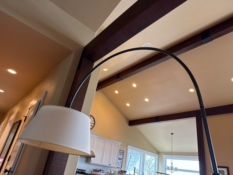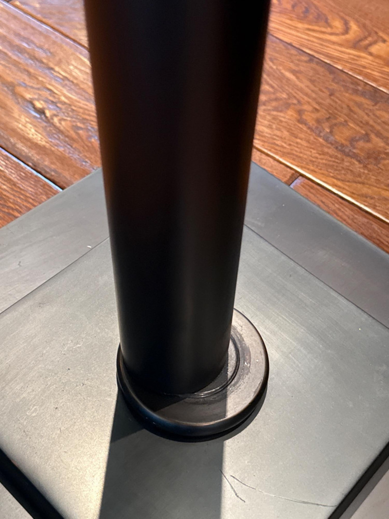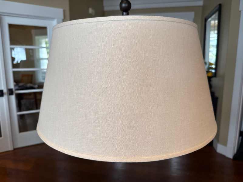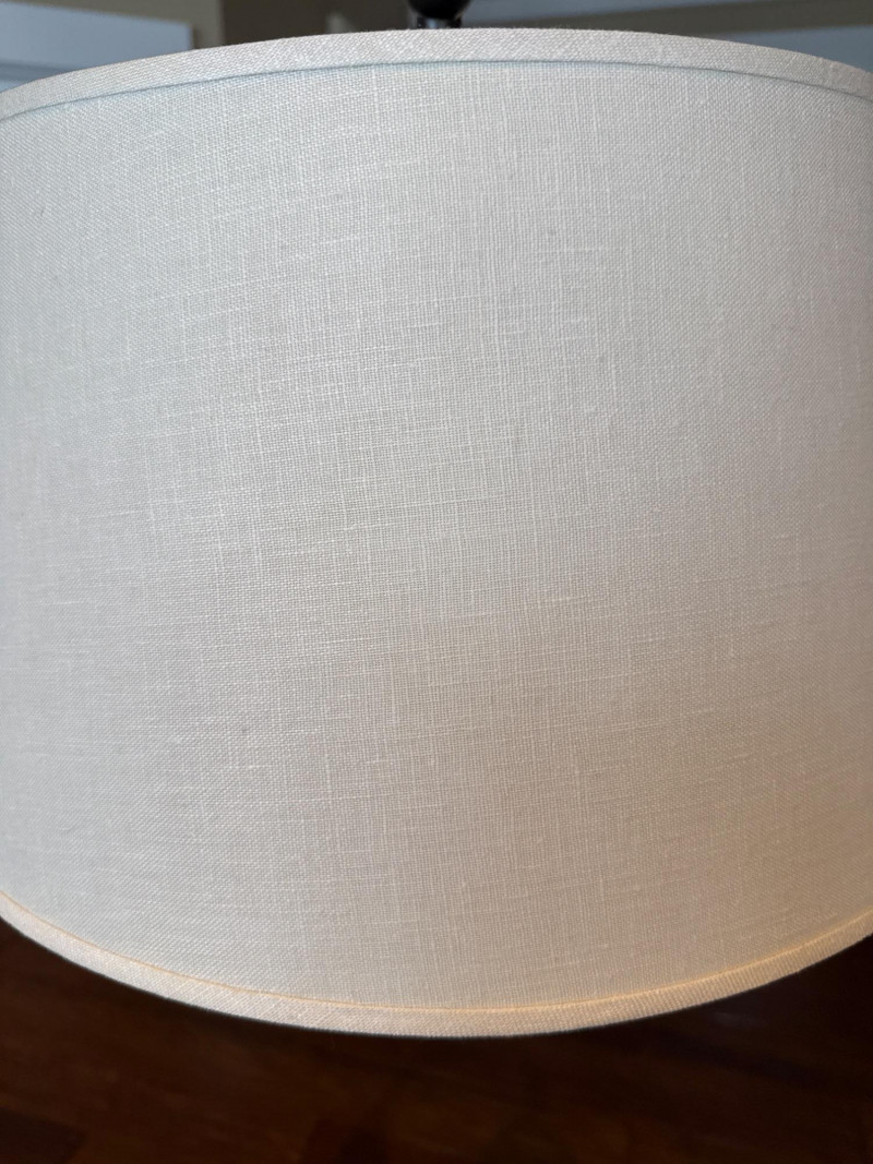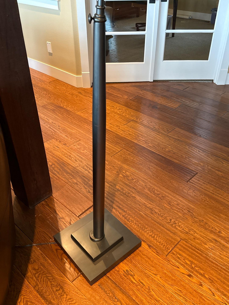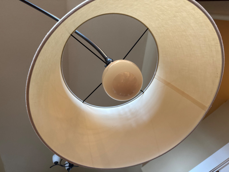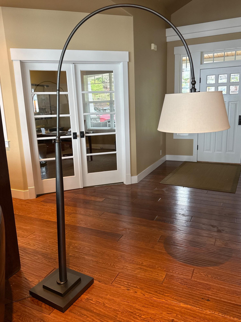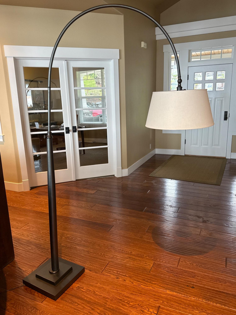 Modern arc floor lamp with a sleek dark metal finish and wide overhead reach, perfect for placing over a sofa, reading chair, or seating area without the need for ceiling lighting. This piece features a sturdy, heavy base for excellent stability and a clean fabric drum shade that provides soft, even lighting. The lamp is in great overall condition with a clean shade and only minor signs of normal use on the base and metal. A stylish and functional statement piece that works well in living rooms, offices, or reading nooks. Dimensions: