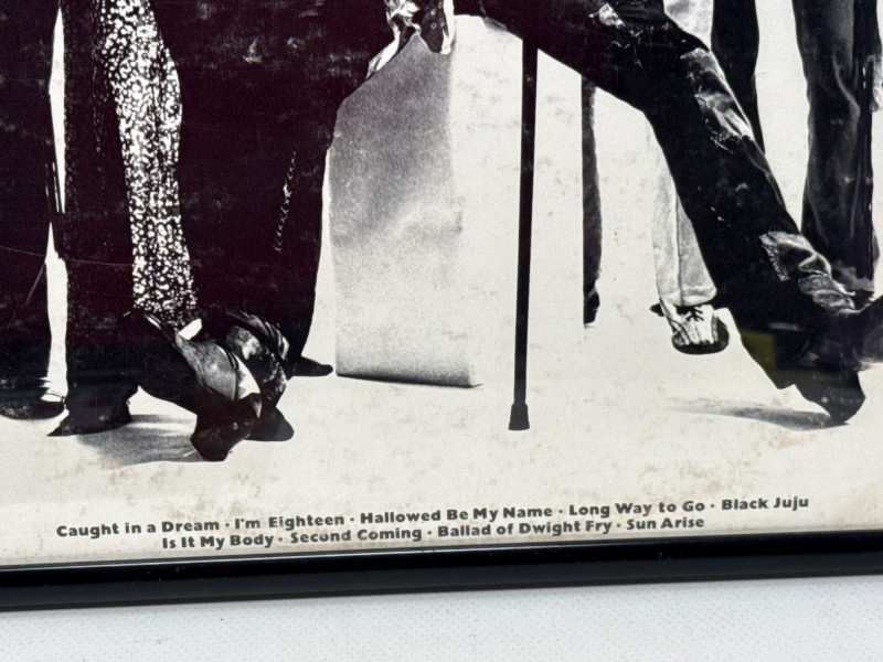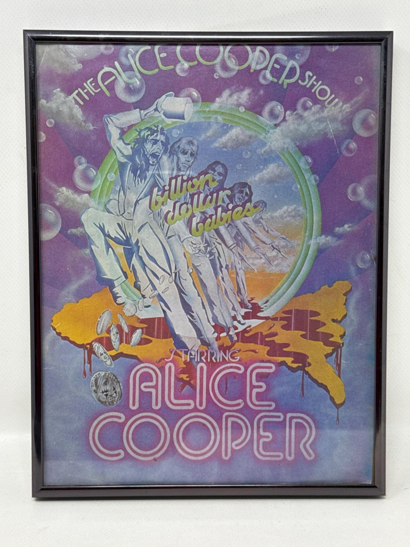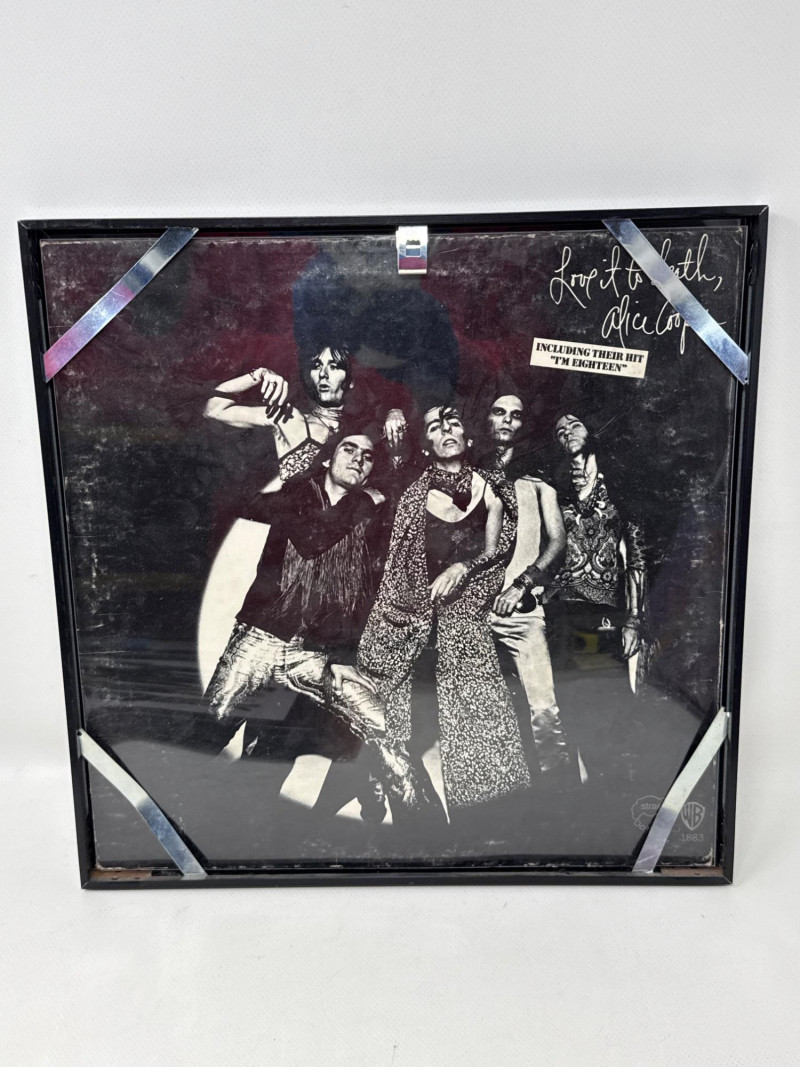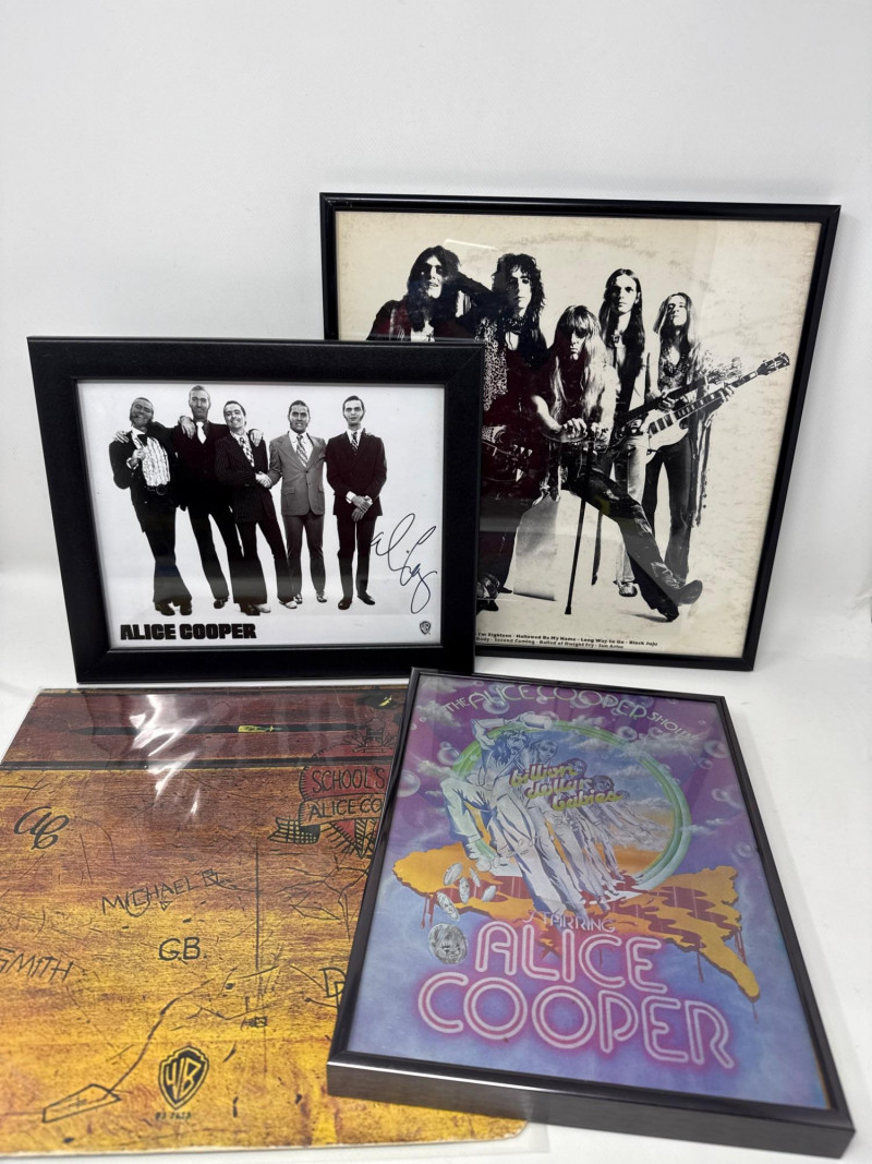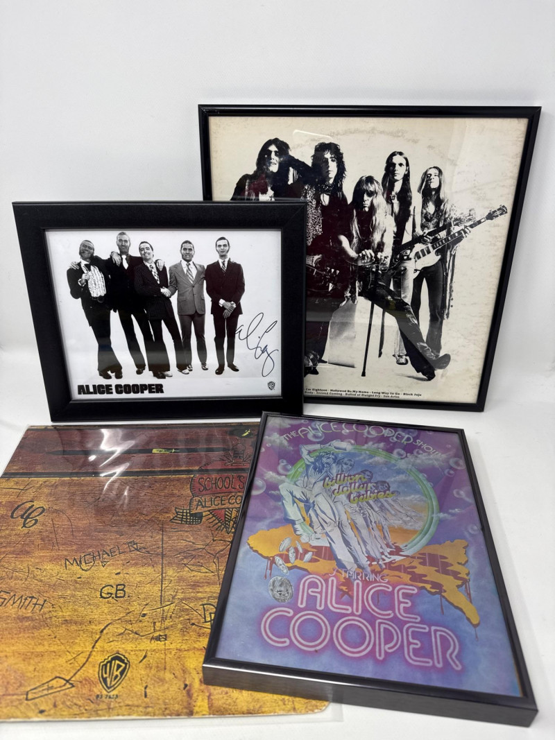 Psychedelic Alice Cooper Poster – A vibrant, colorful framed poster with bold artwork and stylized lettering, reflecting the theatrical and surreal aesthetic associated with Alice Cooper’s legacy. Album Cover or Vinyl Display – A protective sleeved "Schools out" album resembling a wood school desk‑themed album cover or record art, adding depth and variety to the collection. Framed album "Love it to Death". Together, these pieces create a visually compelling tribute to Alice Cooper’s influence on rock music and stage performance. Ideal for display in a music room, studio, or themed collection. Framed album measures approximately 13” x 13”. Signed photo frame is about 11.5” x 9.75”. Poster frame measures 8.75” x 11.25”.