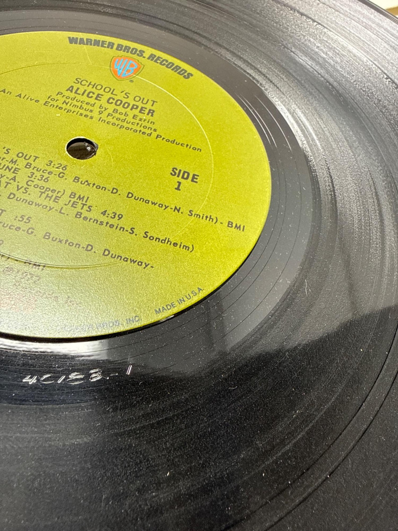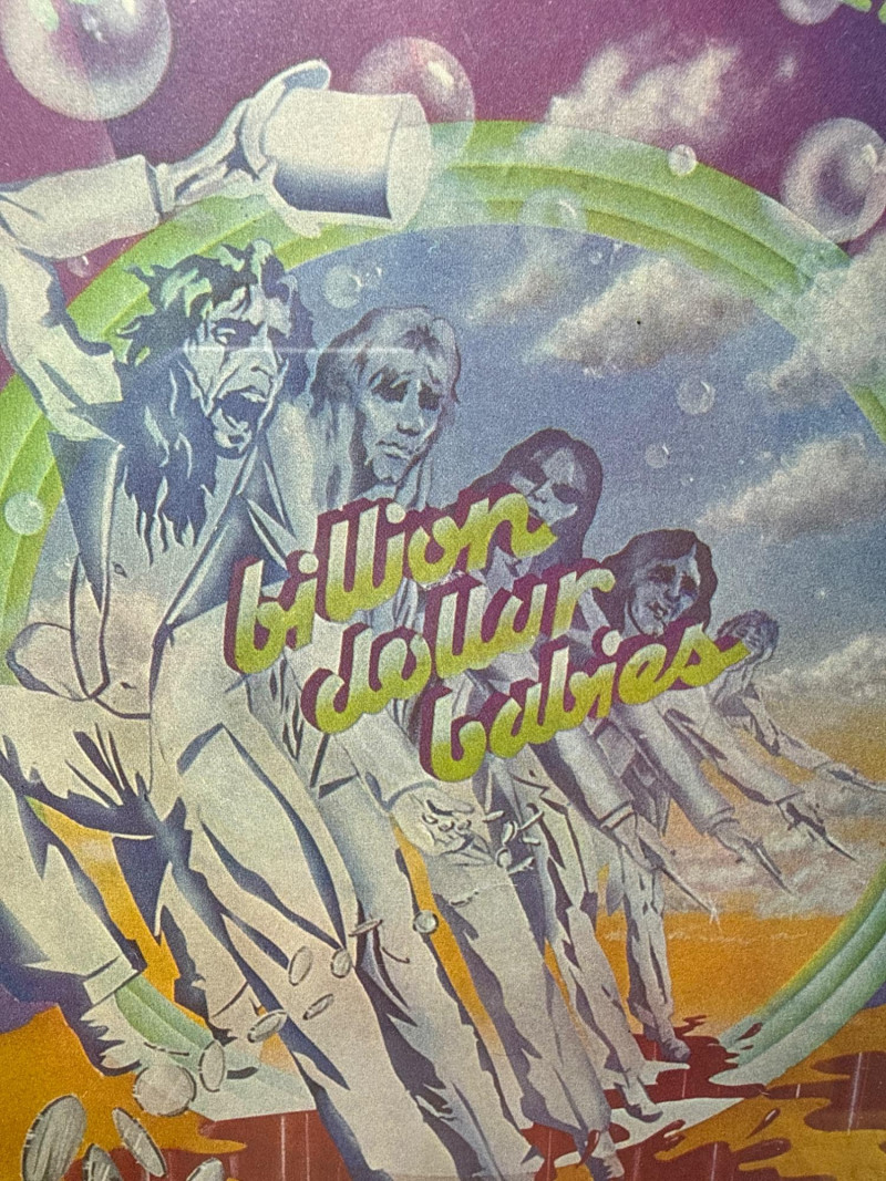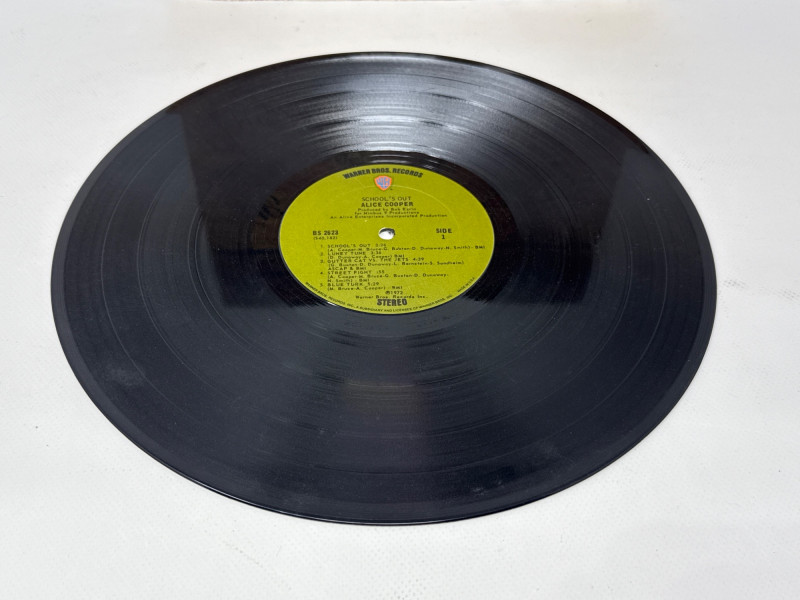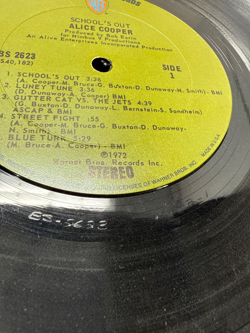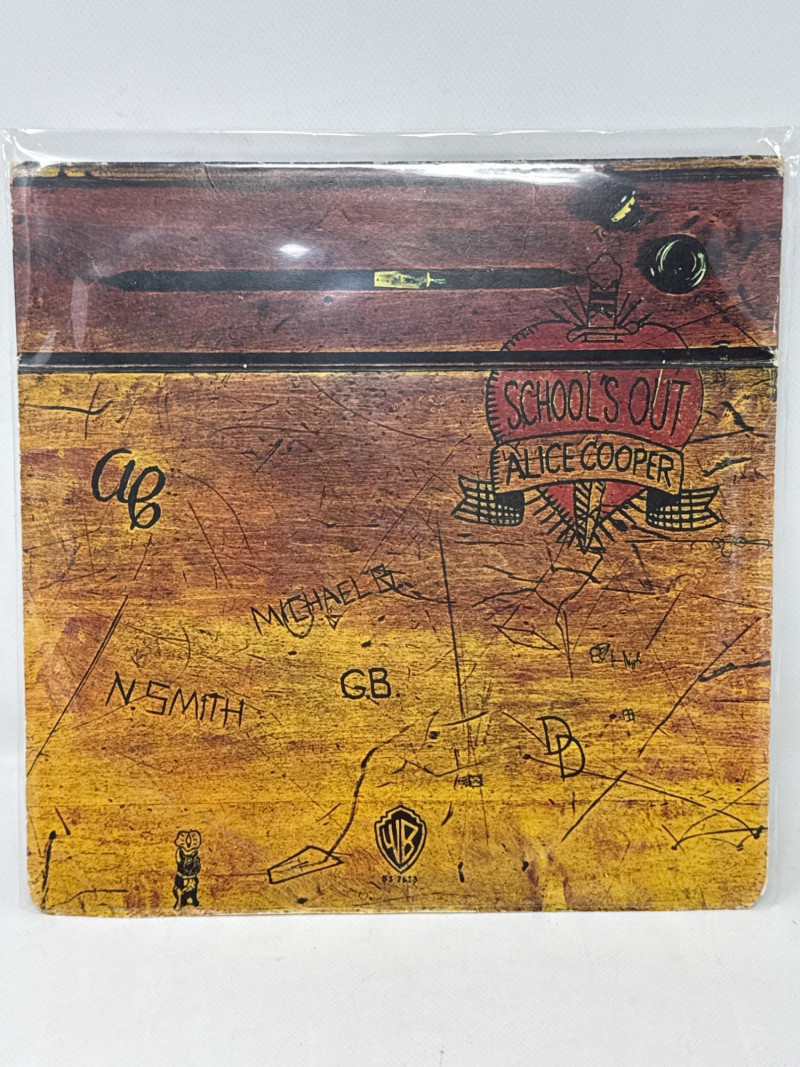 Psychedelic Alice Cooper Poster – A vibrant, colorful framed poster with bold artwork and stylized lettering, reflecting the theatrical and surreal aesthetic associated with Alice Cooper’s legacy. Album Cover or Vinyl Display – A protective sleeved "Schools out" album resembling a wood school desk‑themed album cover or record art, adding depth and variety to the collection. Framed album "Love it to Death". Together, these pieces create a visually compelling tribute to Alice Cooper’s influence on rock music and stage performance. Ideal for display in a music room, studio, or themed collection. Framed album measures approximately 13” x 13”. Signed photo frame is about 11.5” x 9.75”. Poster frame measures 8.75” x 11.25”.