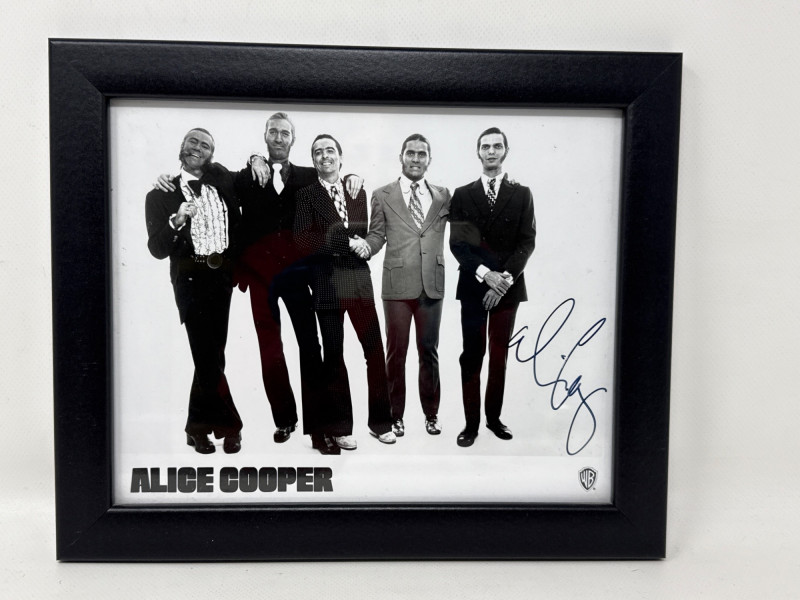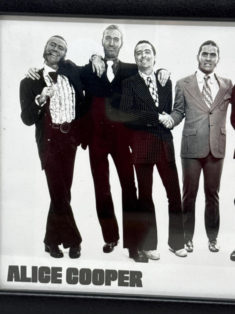 Autographed Black‑and‑White Band Photo – A framed image of Alice Cooper with band members, featuring a visible signature that adds authenticity and collector appeal.