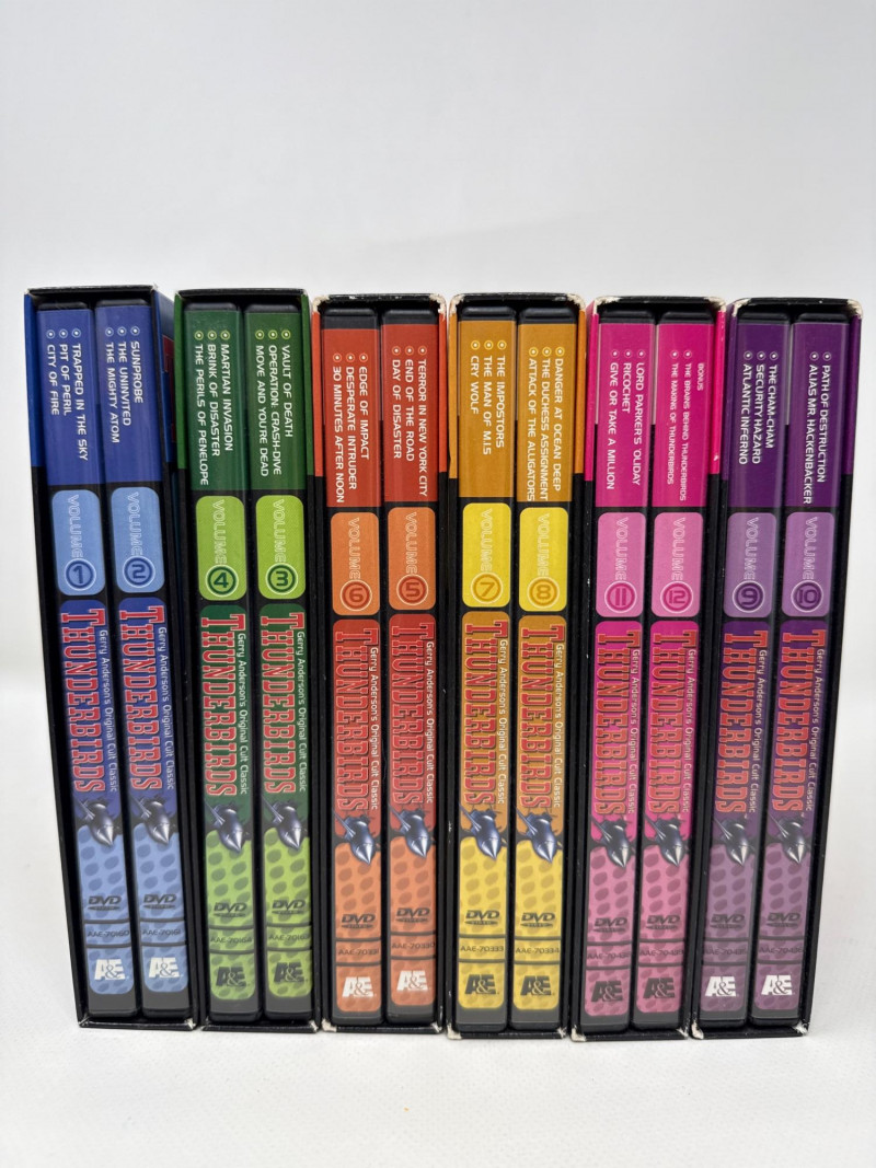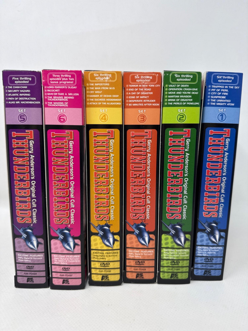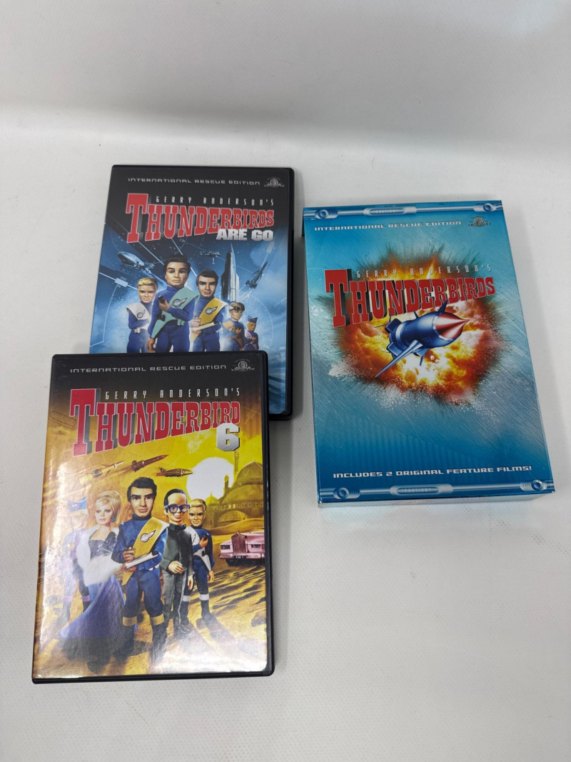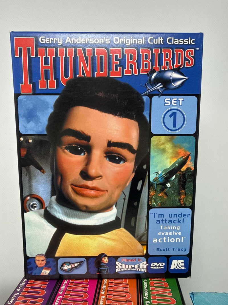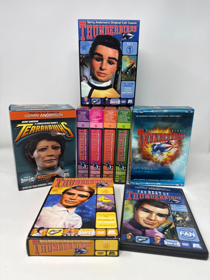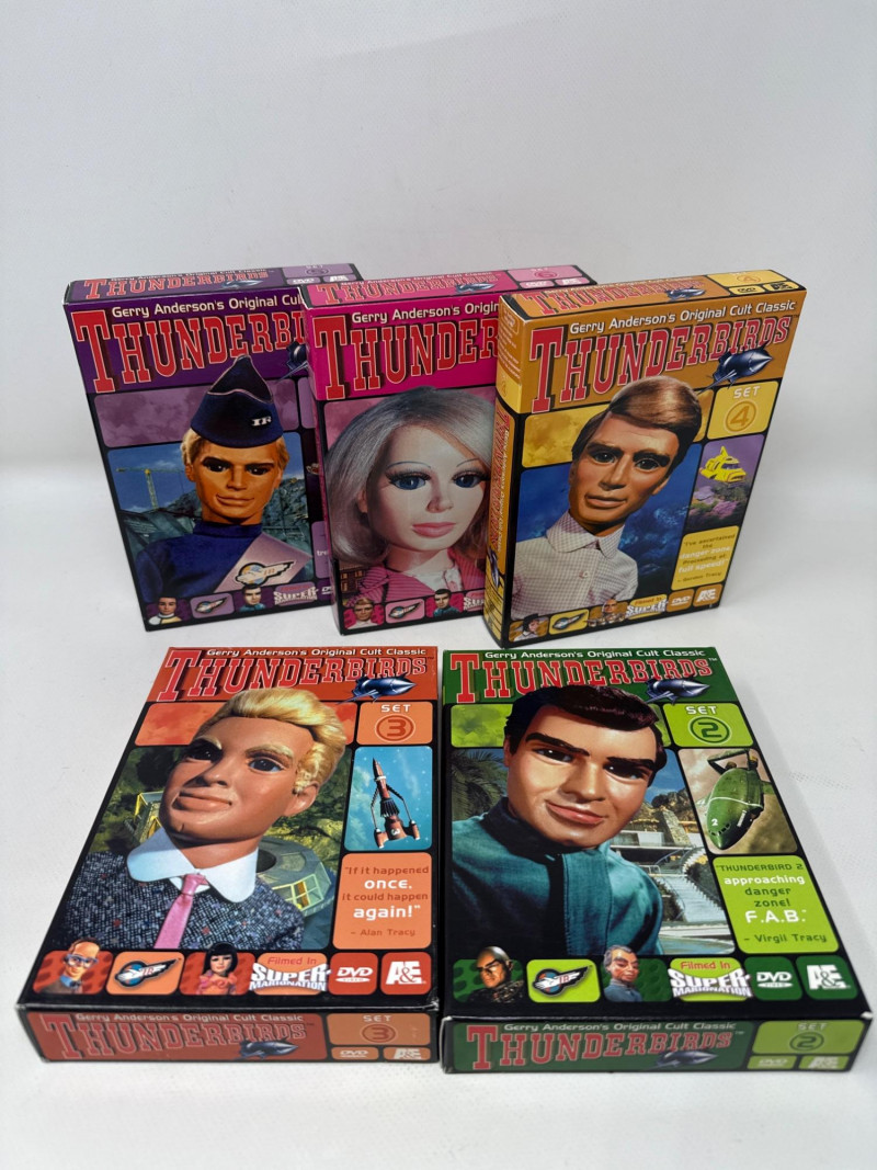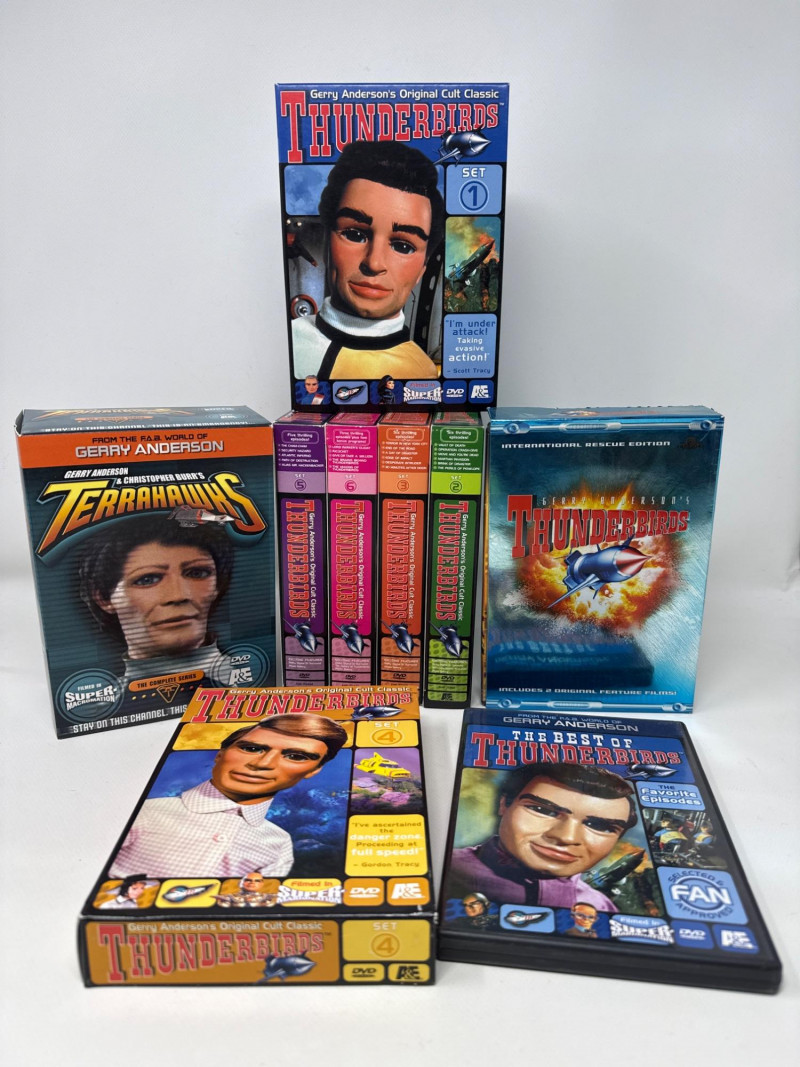 Large Gerry Anderson sci-fi DVD collection featuring classic Supermarionation series. This lot includes multiple Thunderbirds DVD box sets (Sets 1–6), along with additional releases including: In total, 8 box sets plus 1 additional single DVD