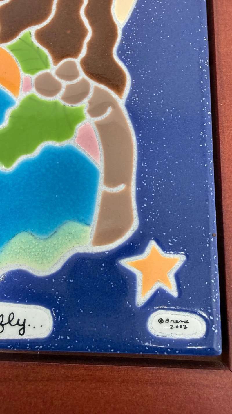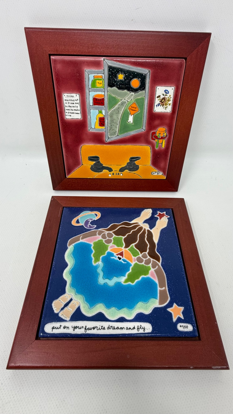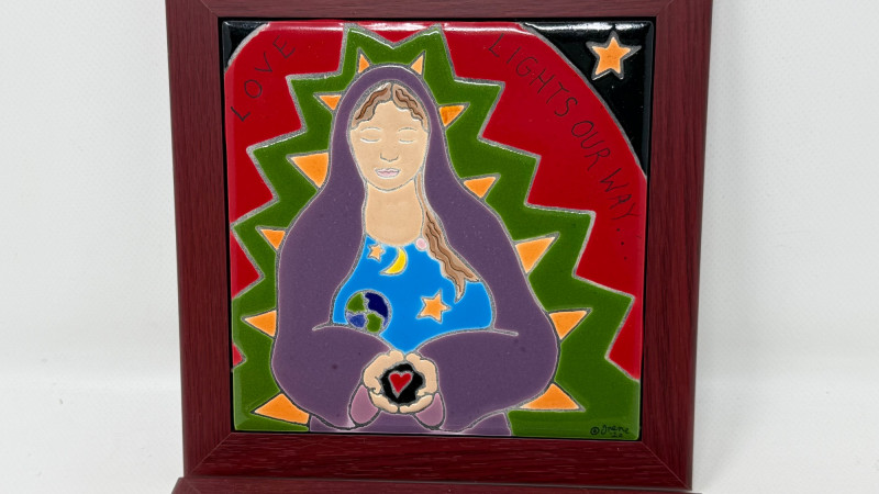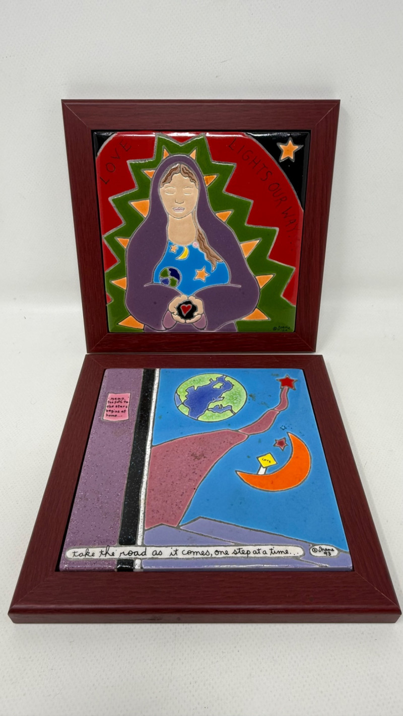 Six handmade, individually framed ceramic tile artworks. Each piece is set in a simple wooden frame that emphasizes the vivid, expressive artwork inside. Artist is "Irene" The tiles share a stylistic family: bold outlines, saturated colors, symbolic figures, and occasional integrated text. The aesthetic blends folk‑art influences with spiritual, whimsical, and narrative themes.