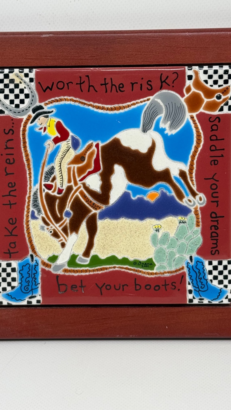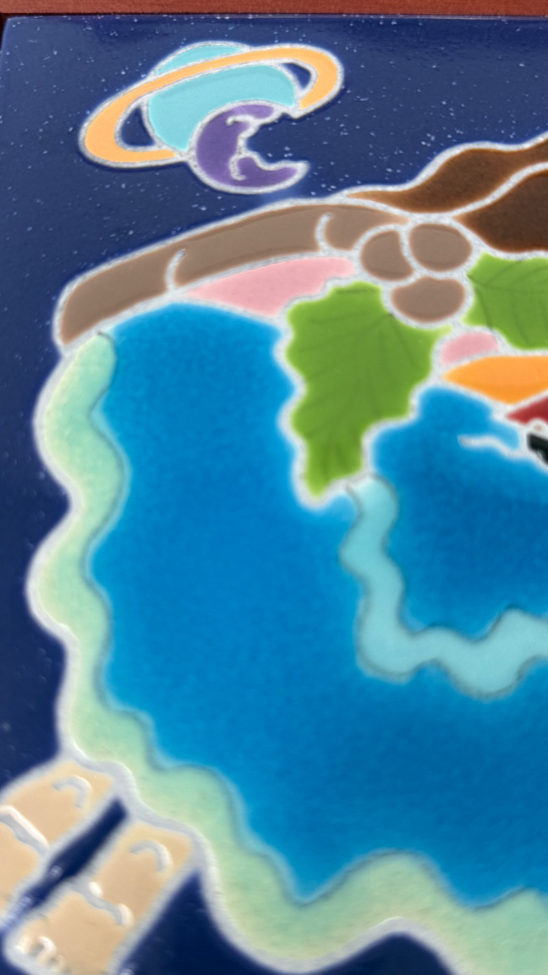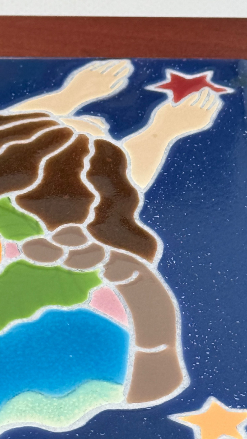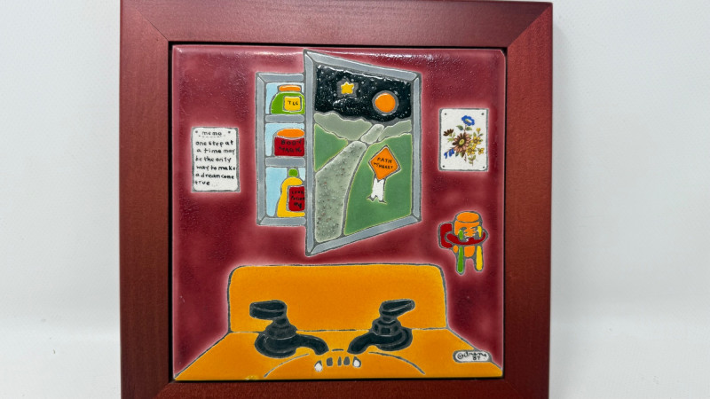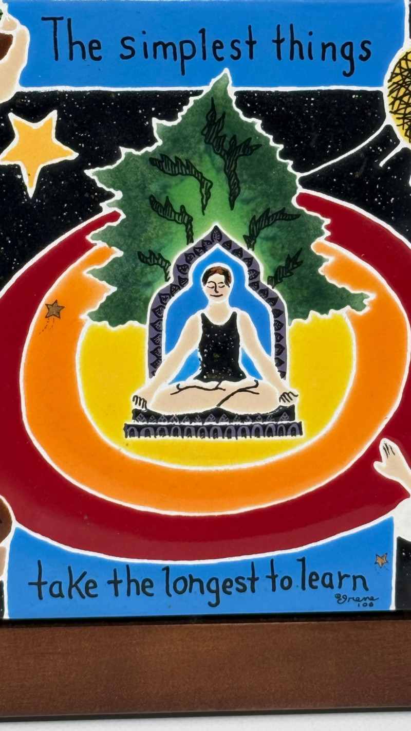 Six handmade, individually framed ceramic tile artworks. Each piece is set in a simple wooden frame that emphasizes the vivid, expressive artwork inside. Artist is "Irene" The tiles share a stylistic family: bold outlines, saturated colors, symbolic figures, and occasional integrated text. The aesthetic blends folk‑art influences with spiritual, whimsical, and narrative themes.