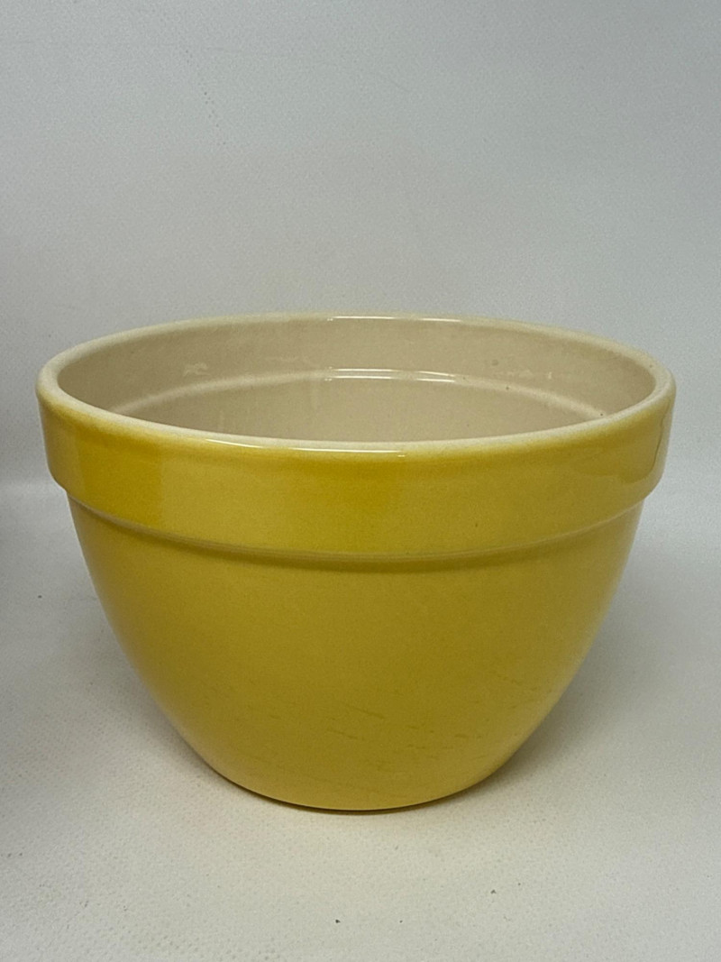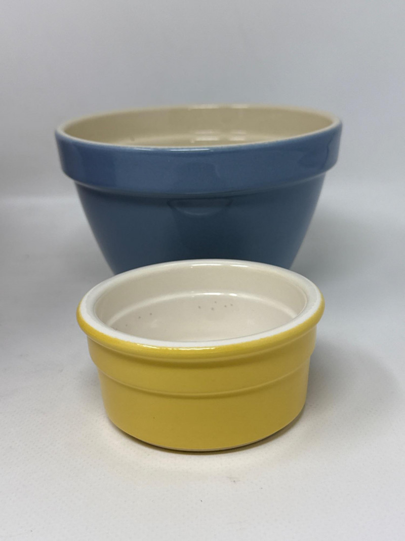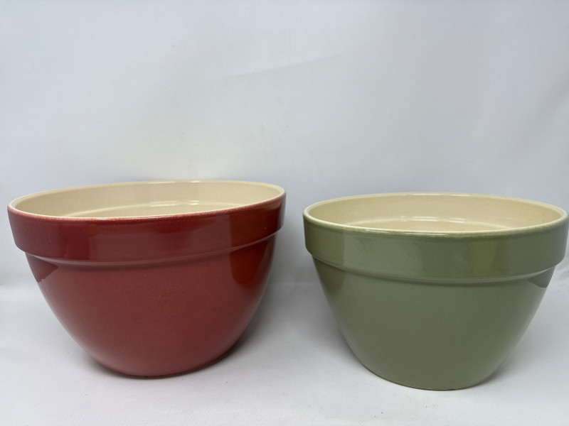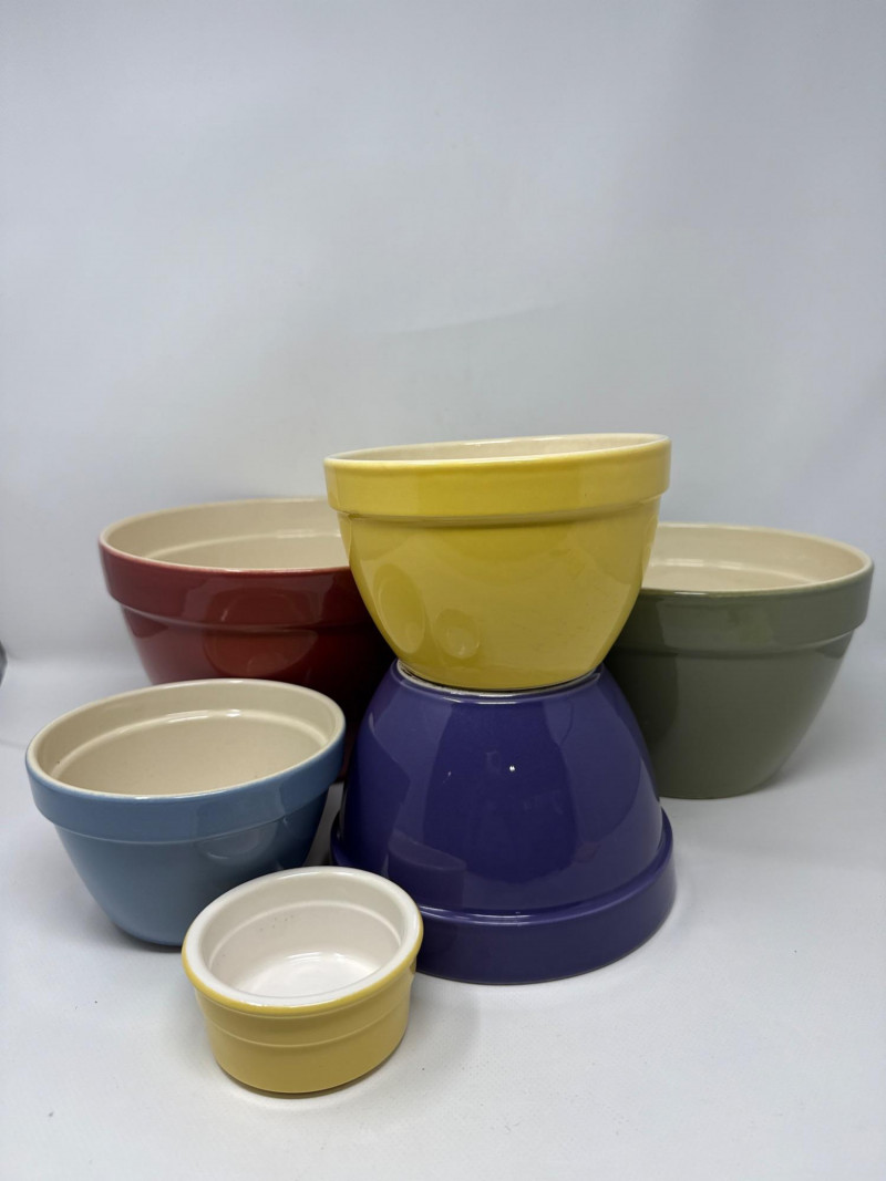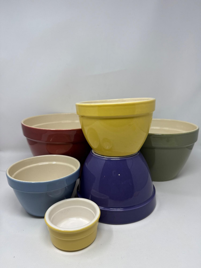 Set of 6 ceramic mixing and serving bowls from Crate & Barrel’s Addison collection, featuring vibrant, multicolor glazed finishes. These bowls are made of durable stoneware and designed to nest neatly for easy storage. Perfect for food prep, serving, or display. Includes a range of sizes, ideal for everything from small ingredients to large mixing tasks. The largest bowl measures approximately 9.5 inches wide and 6 inches deep. One small yellow bowl is not Crate & Barrel but closely matches in material and style.