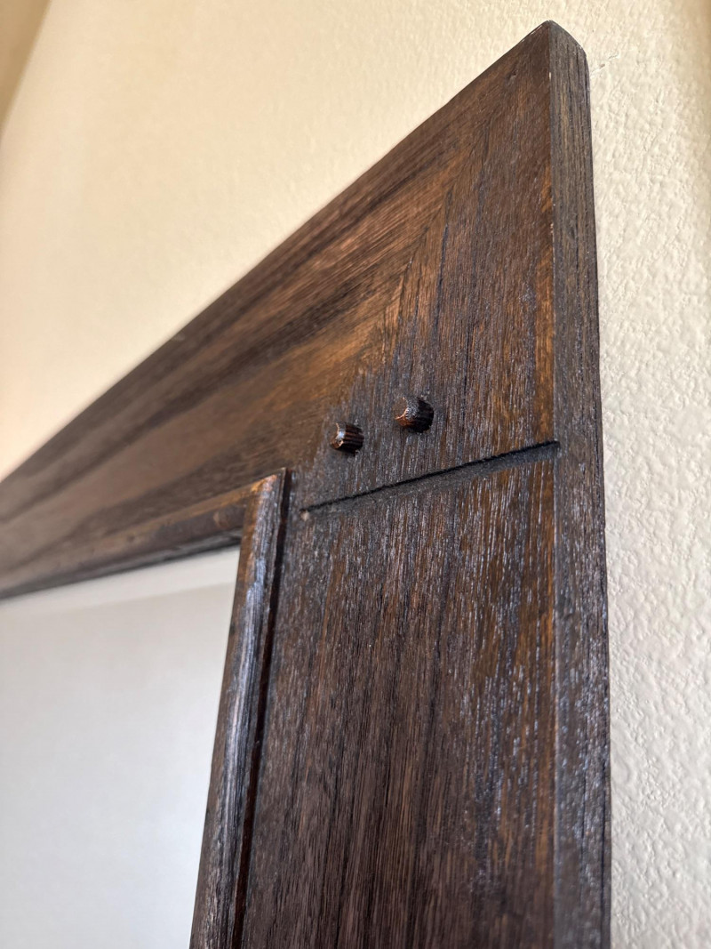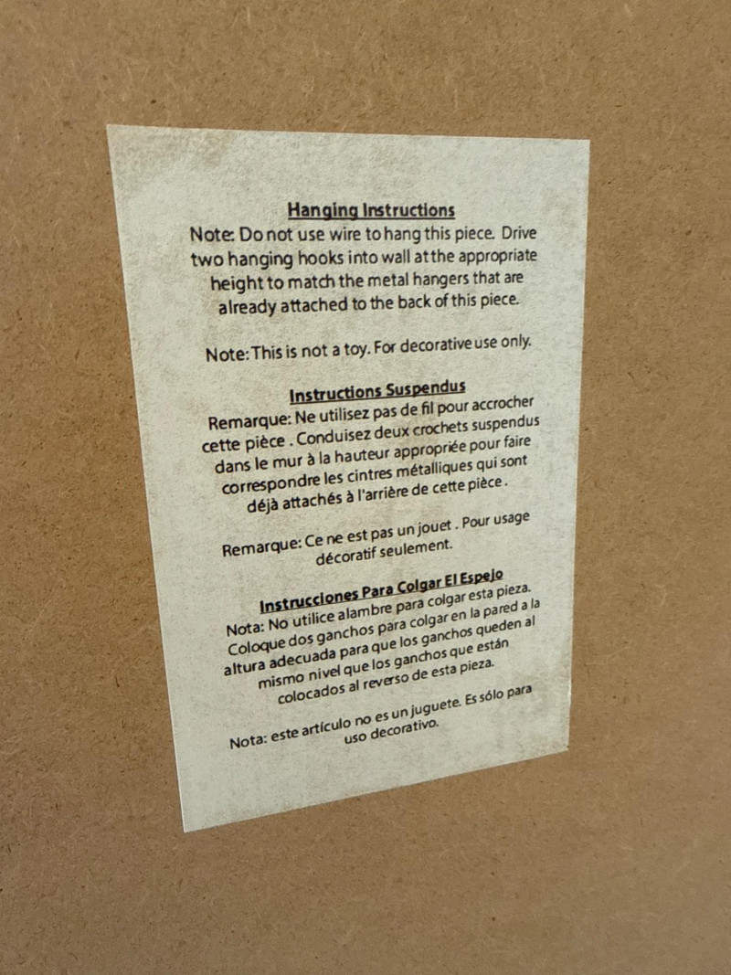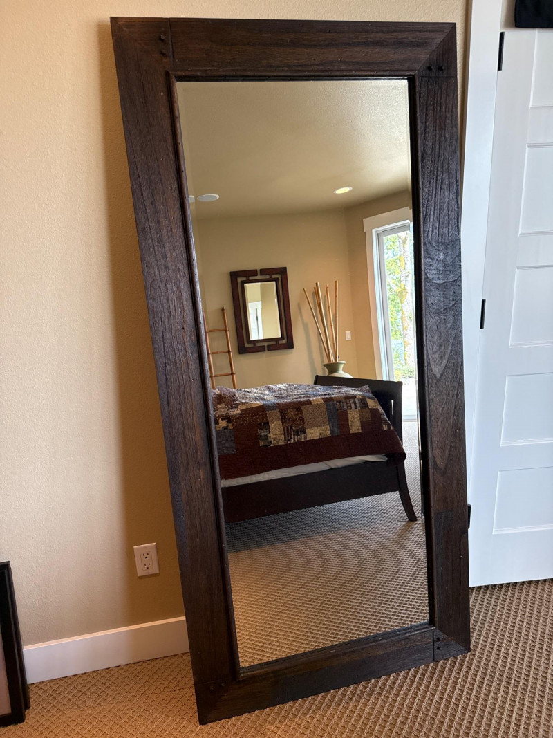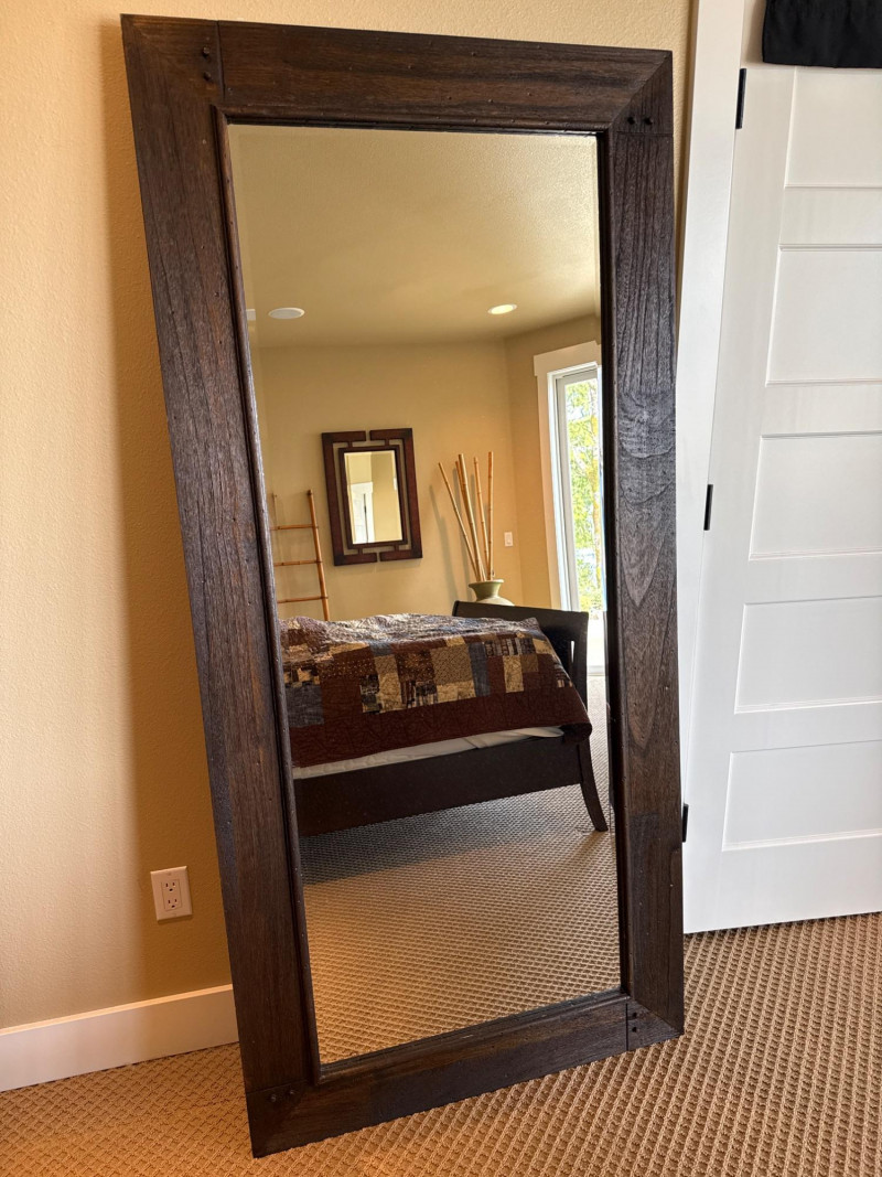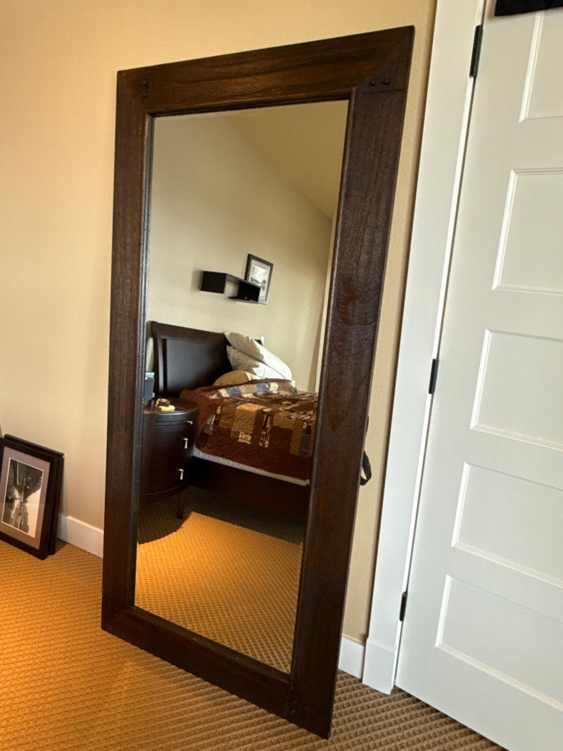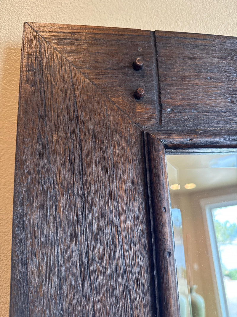 Trendy, large, dark wooden-framed mirror. Has subtle details at the corners and a textured frame. Unique joinery details on the back. Includes a strap and mounting hooks. Must bring help to load. Not overly heavy, but long and awkward.