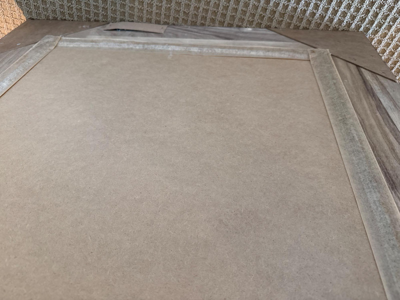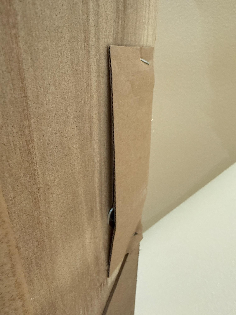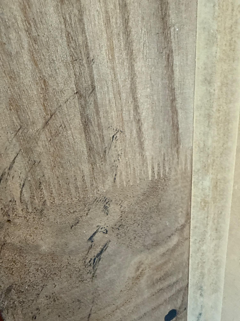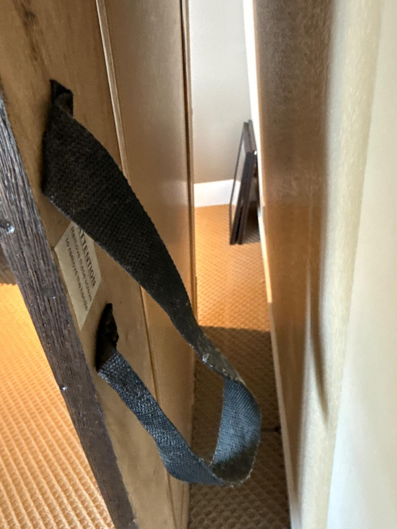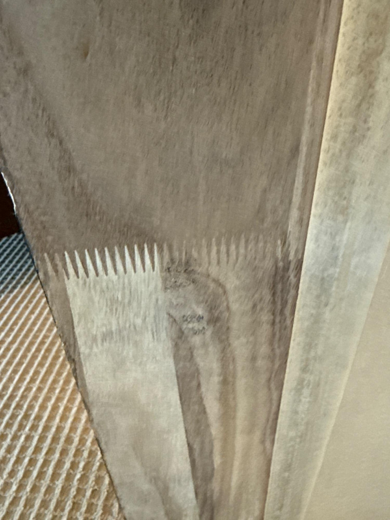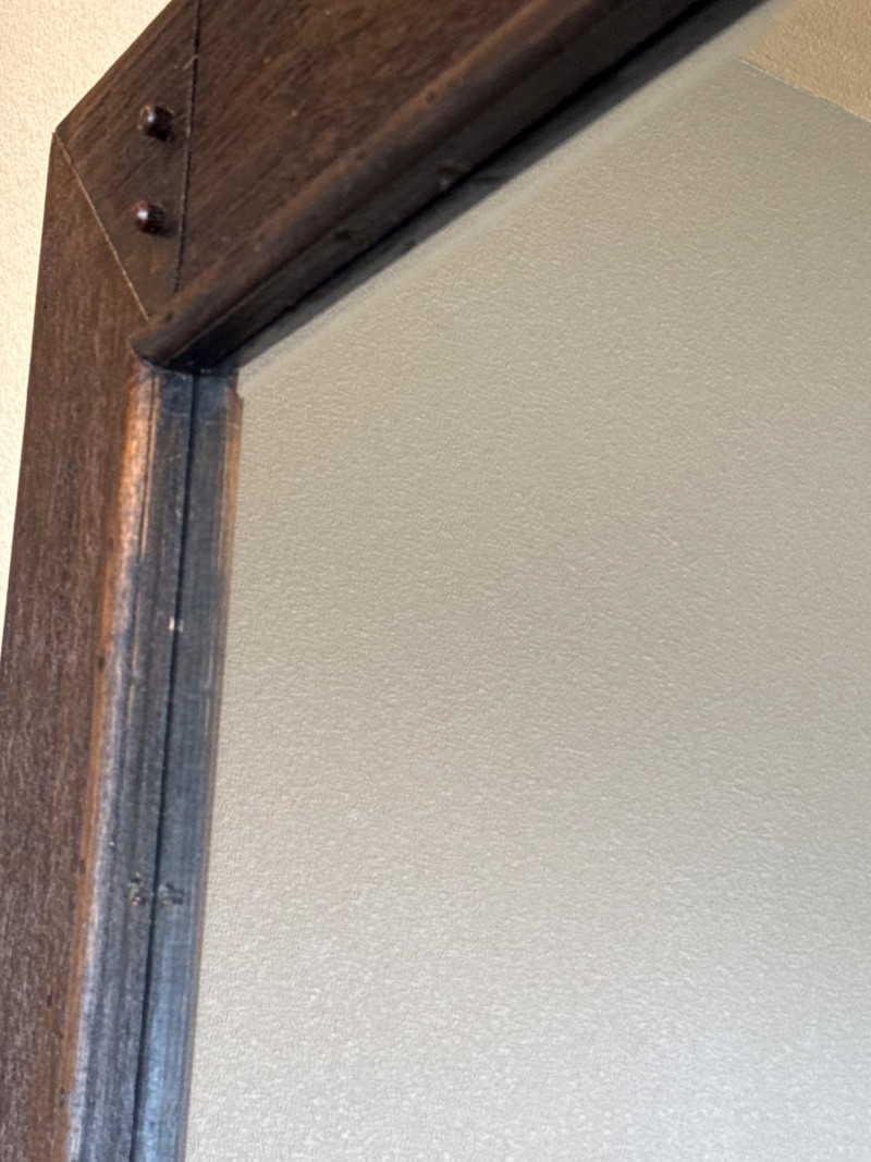 Trendy, large, dark wooden-framed mirror. Has subtle details at the corners and a textured frame. Unique joinery details on the back. Includes a strap and mounting hooks. Must bring help to load. Not overly heavy, but long and awkward.