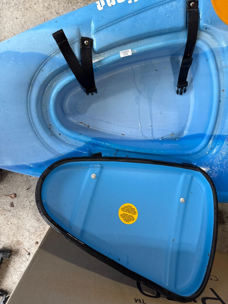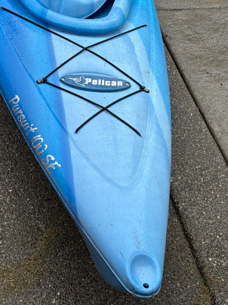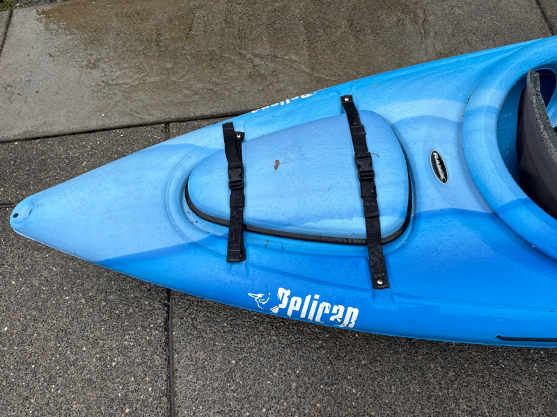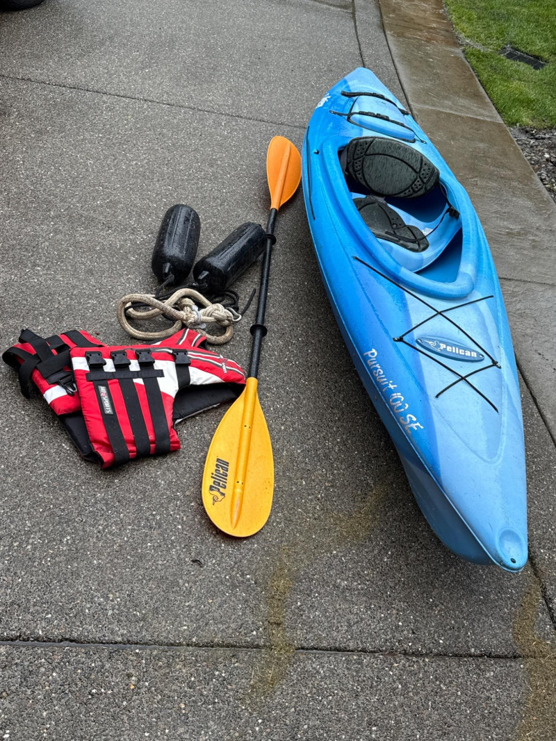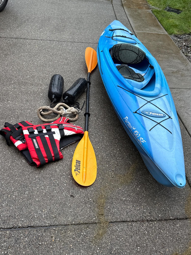 A bright blue sit‑inside kayak, The kayak features a molded plastic body with a shallow V‑shaped hull and a cockpit opening large enough for a single paddler. Inside the cockpit, a black padded seat with a backrest is visible, designed to provide support during paddling. In front of the cockpit, a set of black elastic bungee cords is stretched across the deck, forming a crisscross pattern for securing small gear. Storage compartment behind seat that is watertight. Yellow double‑bladed paddle. The blades are wide and slightly curved, with the brand name “Pelican” printed in black on one of them. The paddle shaft appears to be made of lightweight metal or composite material. There is a bend on one end. See pics. Red and black life jacket. The jacket has multiple adjustable straps and buckles, with black shoulder sections and red front panels. It looks like a standard personal flotation device designed for recreational kayaking.
