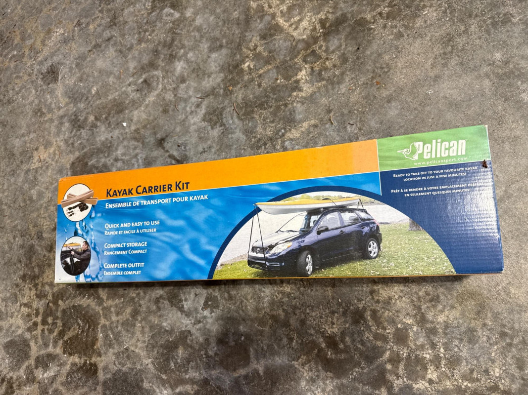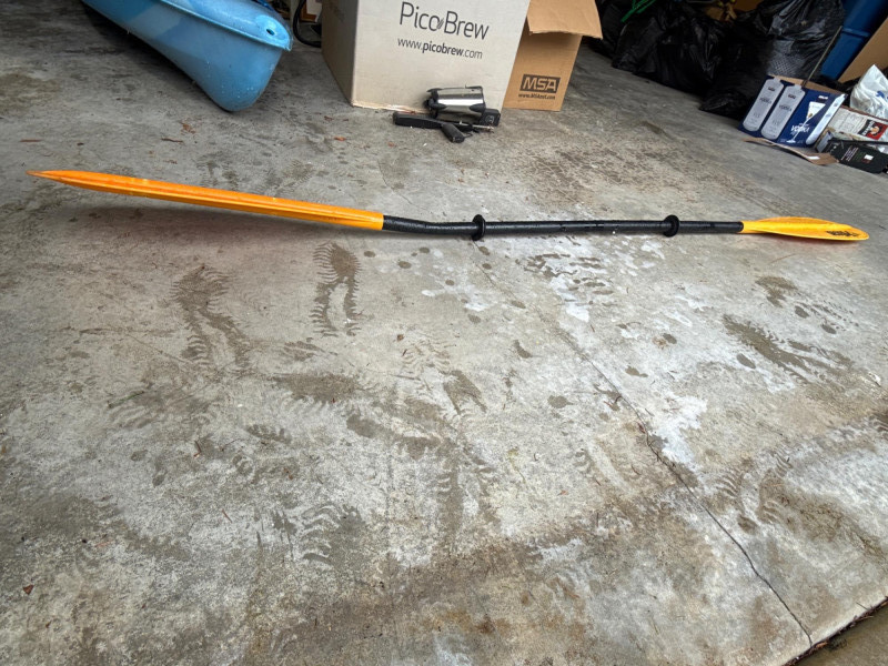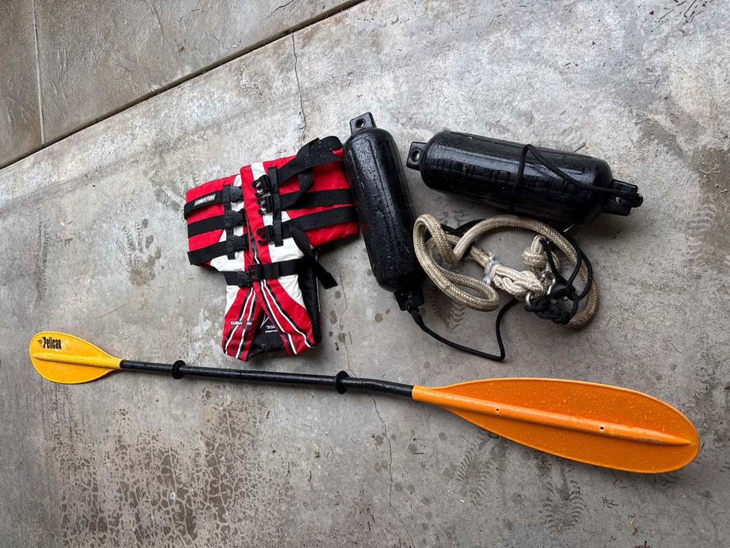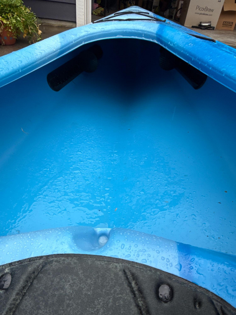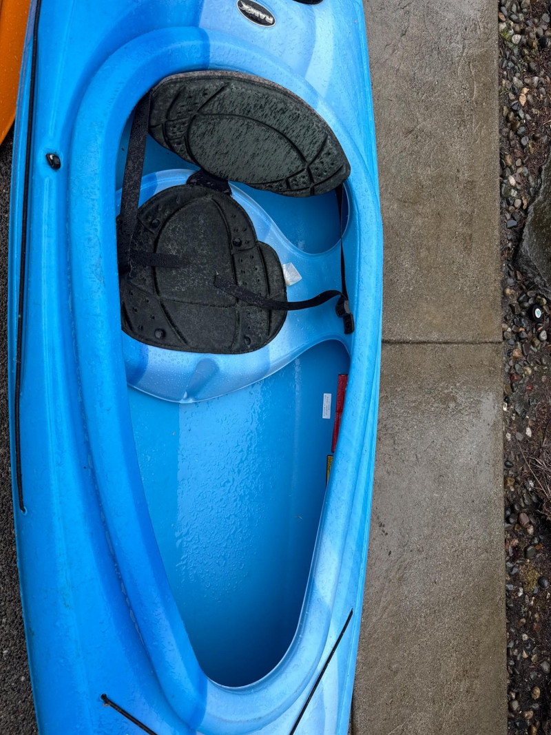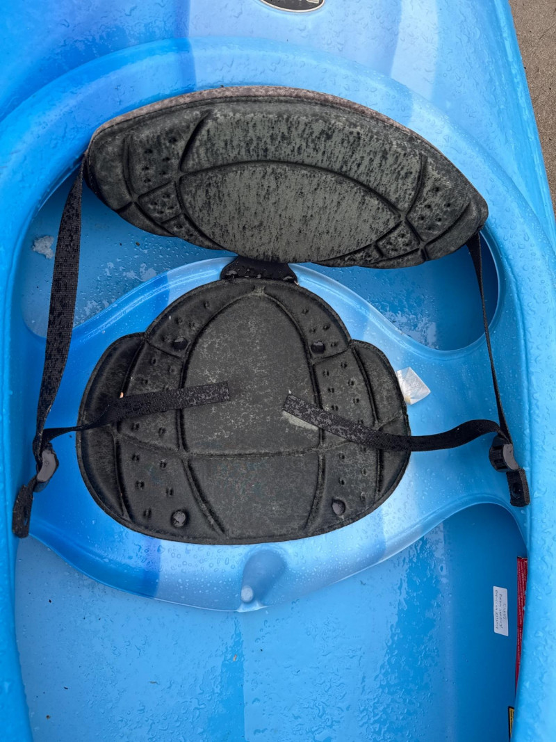 A bright blue sit‑inside kayak, The kayak features a molded plastic body with a shallow V‑shaped hull and a cockpit opening large enough for a single paddler. Inside the cockpit, a black padded seat with a backrest is visible, designed to provide support during paddling. In front of the cockpit, a set of black elastic bungee cords is stretched across the deck, forming a crisscross pattern for securing small gear. Storage compartment behind seat that is watertight. Yellow double‑bladed paddle. The blades are wide and slightly curved, with the brand name “Pelican” printed in black on one of them. The paddle shaft appears to be made of lightweight metal or composite material. There is a bend on one end. See pics. Red and black life jacket. The jacket has multiple adjustable straps and buckles, with black shoulder sections and red front panels. It looks like a standard personal flotation device designed for recreational kayaking.