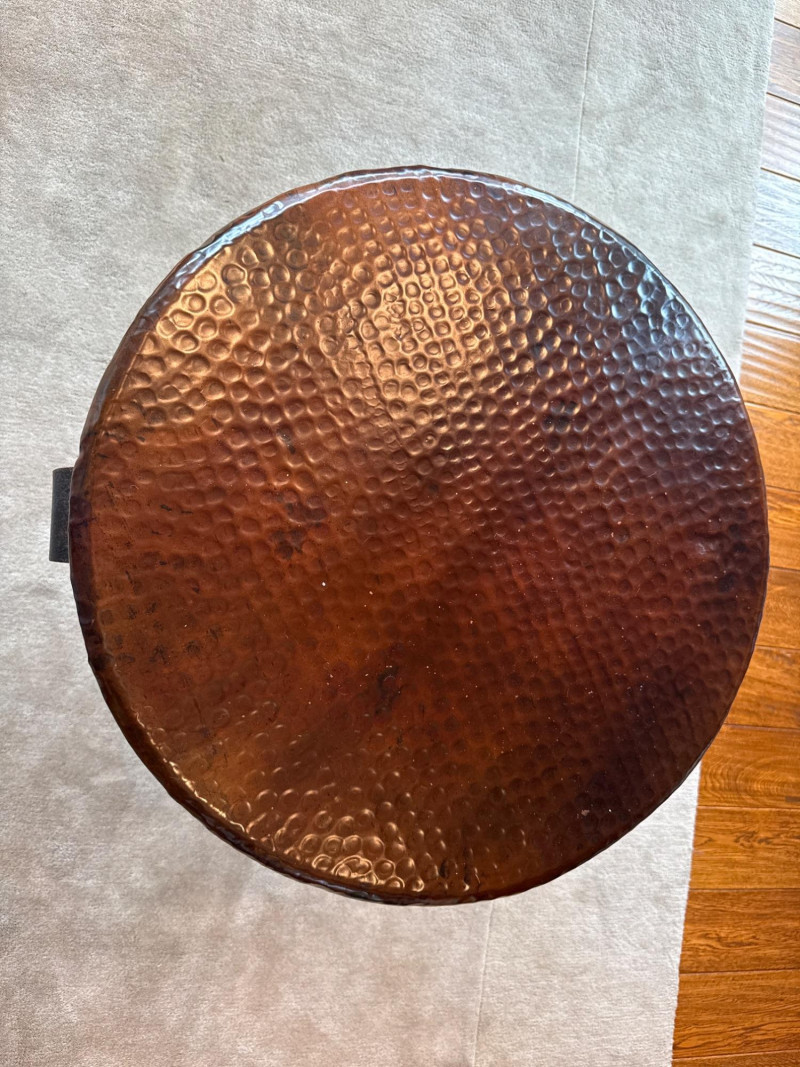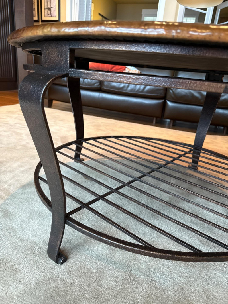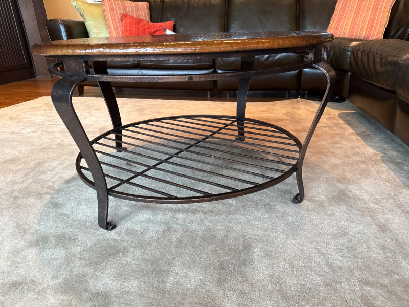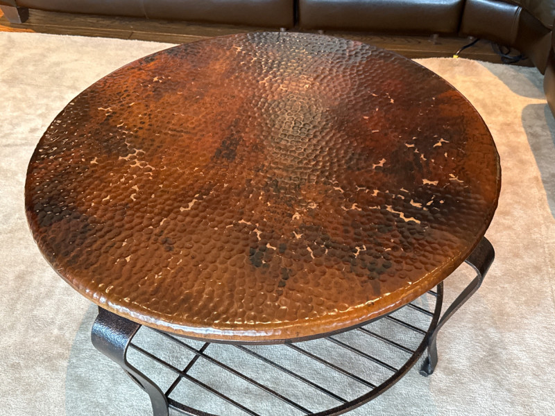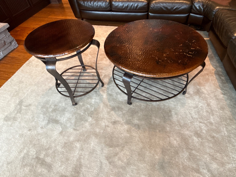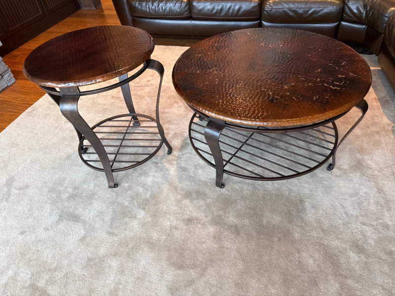Stylish 2-piece living room table set featuring hammered copper tops and sturdy iron bases. Includes one large coffee table and one matching side/end table. The textured copper surfaces give a warm, rustic look, while the curved iron legs and lower shelf add both durability and function. Details: Dimensions: