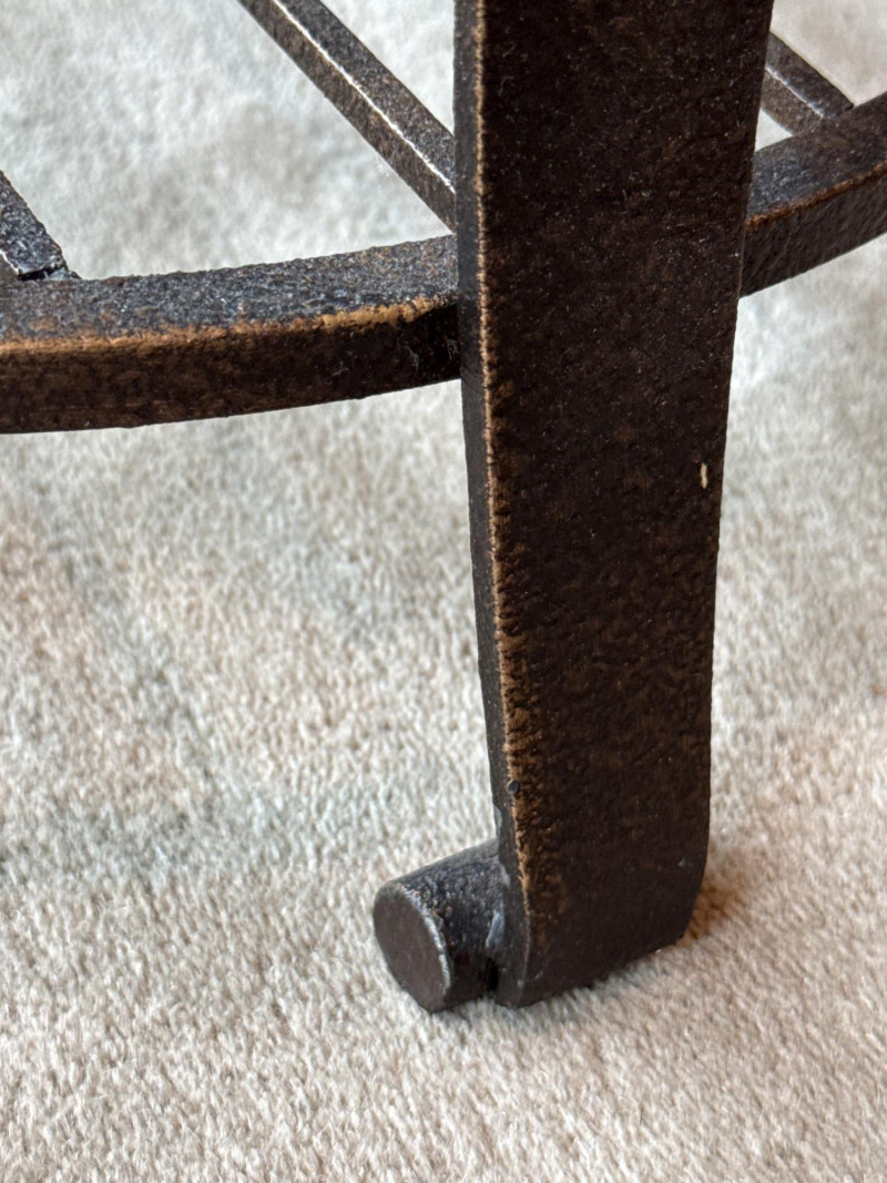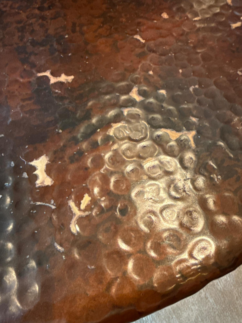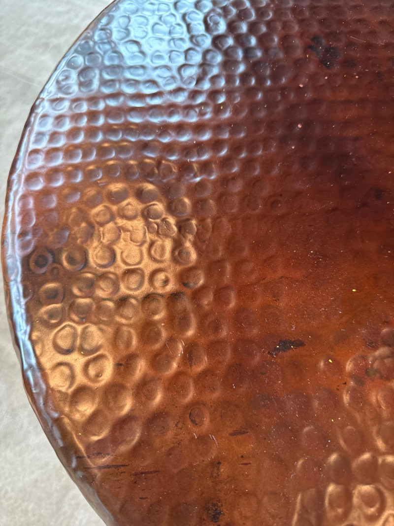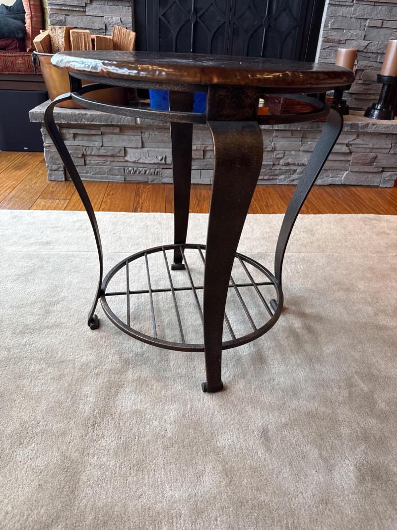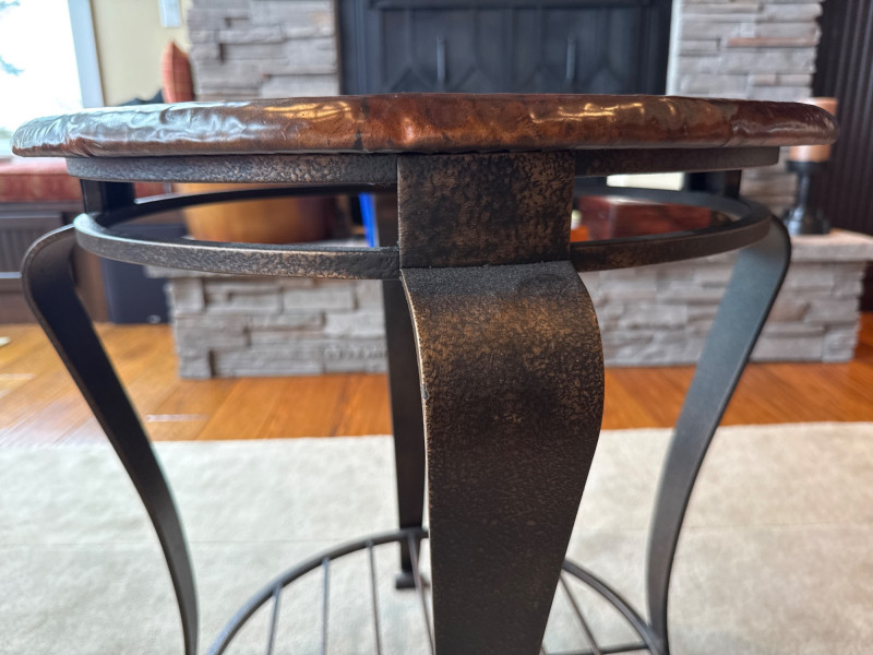 Stylish 2-piece living room table set featuring hammered copper tops and sturdy iron bases. Includes one large coffee table and one matching side/end table. The textured copper surfaces give a warm, rustic look, while the curved iron legs and lower shelf add both durability and function. Details: Dimensions: