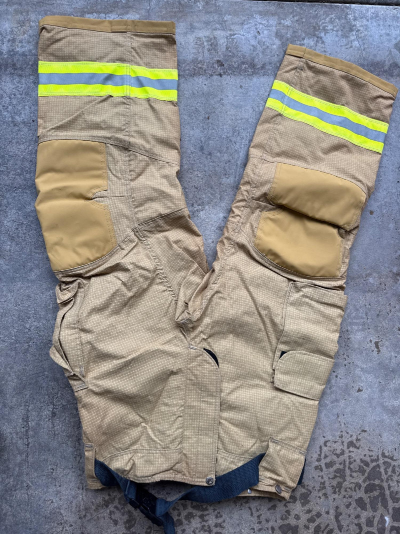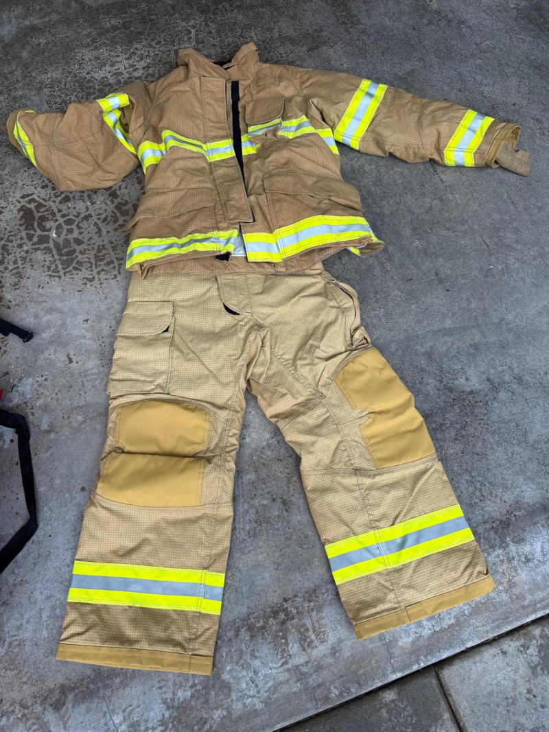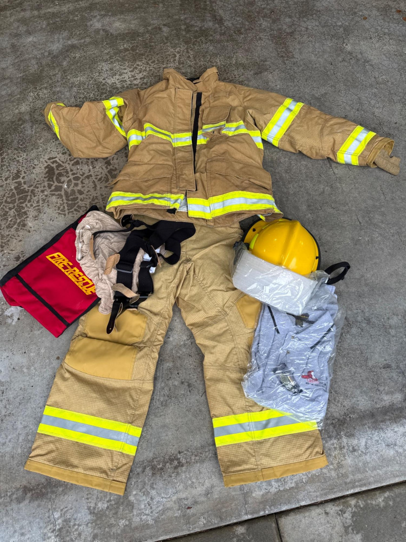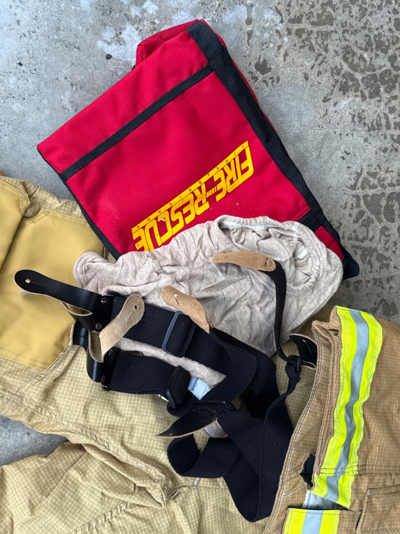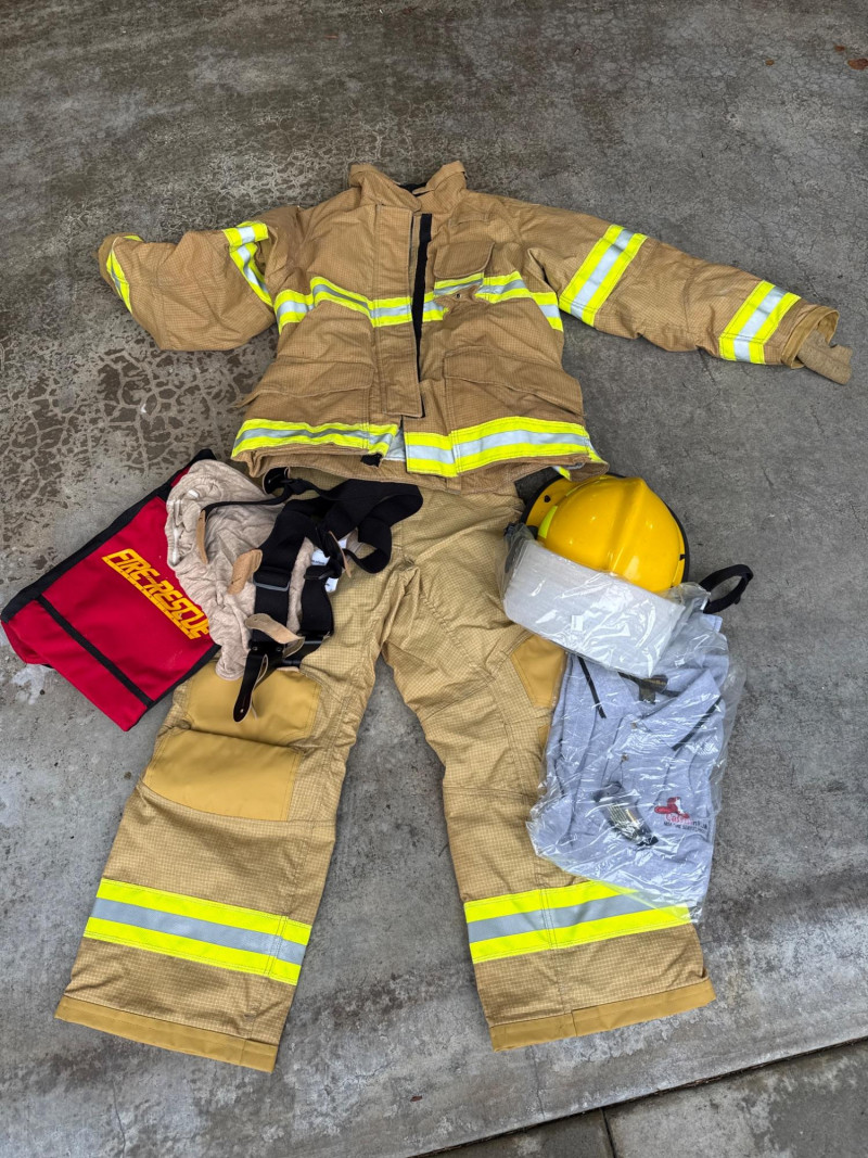 Complete personal Firefighter turn out safety gear set. This kit includes a turnout coat, pants, helmet, and additional accessories as shown. New or like new condition Important: This set does NOT meet current safety/code standards for active firefighting use. Sold strictly for collectible, training, costume, or personal purposes. The ensemble includes- Protective Jacket and Pants: Both pieces are tan, made from fire‑resistant material, and feature bright yellow reflective striping for visibility in hazardous conditions. Yellow Fire Helmet: Designed to protect against falling debris and heat. Suspender System: Black and like new. Red Equipment Bag: Clearly labeled “FIRE”, used for carrying essential tools or protective accessories.