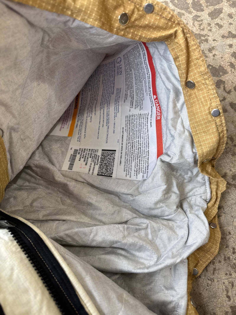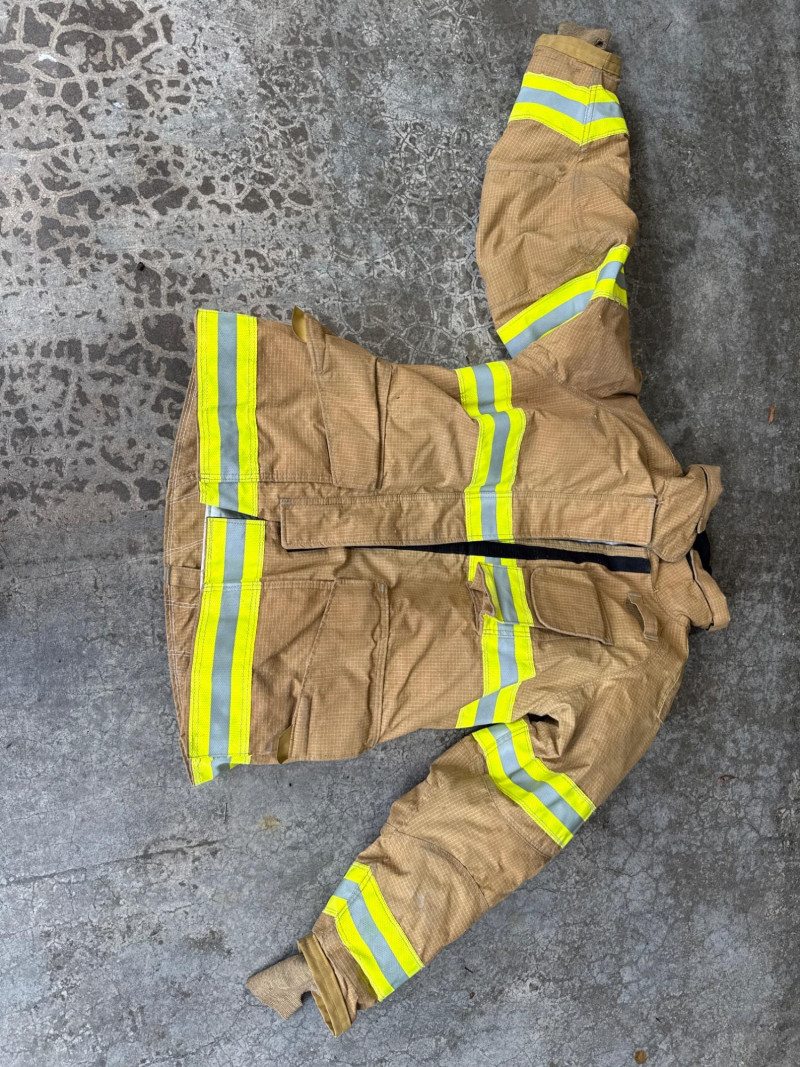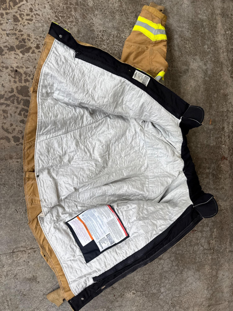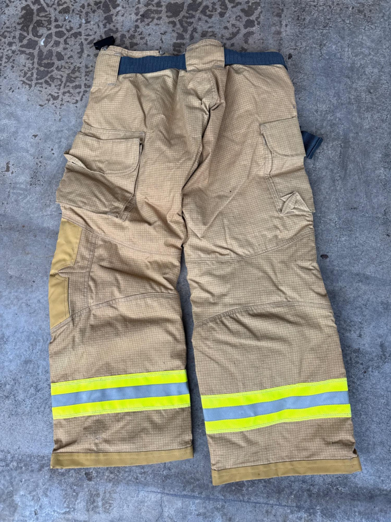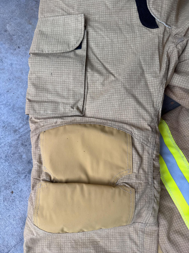 Complete personal Firefighter turn out safety gear set. This kit includes a turnout coat, pants, helmet, and additional accessories as shown. New or like new condition Important: This set does NOT meet current safety/code standards for active firefighting use. Sold strictly for collectible, training, costume, or personal purposes. The ensemble includes- Protective Jacket and Pants: Both pieces are tan, made from fire‑resistant material, and feature bright yellow reflective striping for visibility in hazardous conditions. Yellow Fire Helmet: Designed to protect against falling debris and heat. Suspender System: Black and like new. Red Equipment Bag: Clearly labeled “FIRE”, used for carrying essential tools or protective accessories.