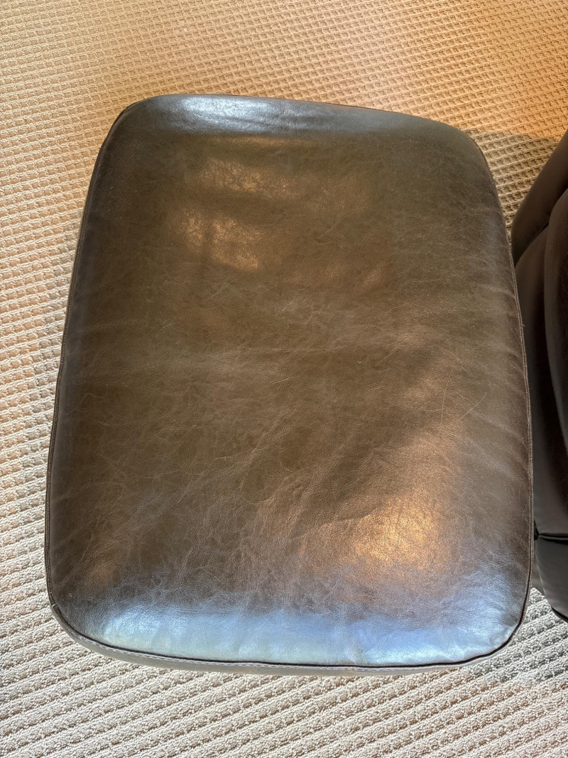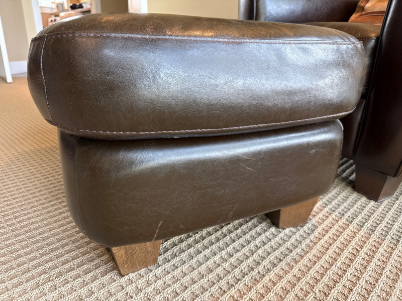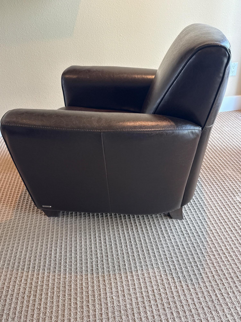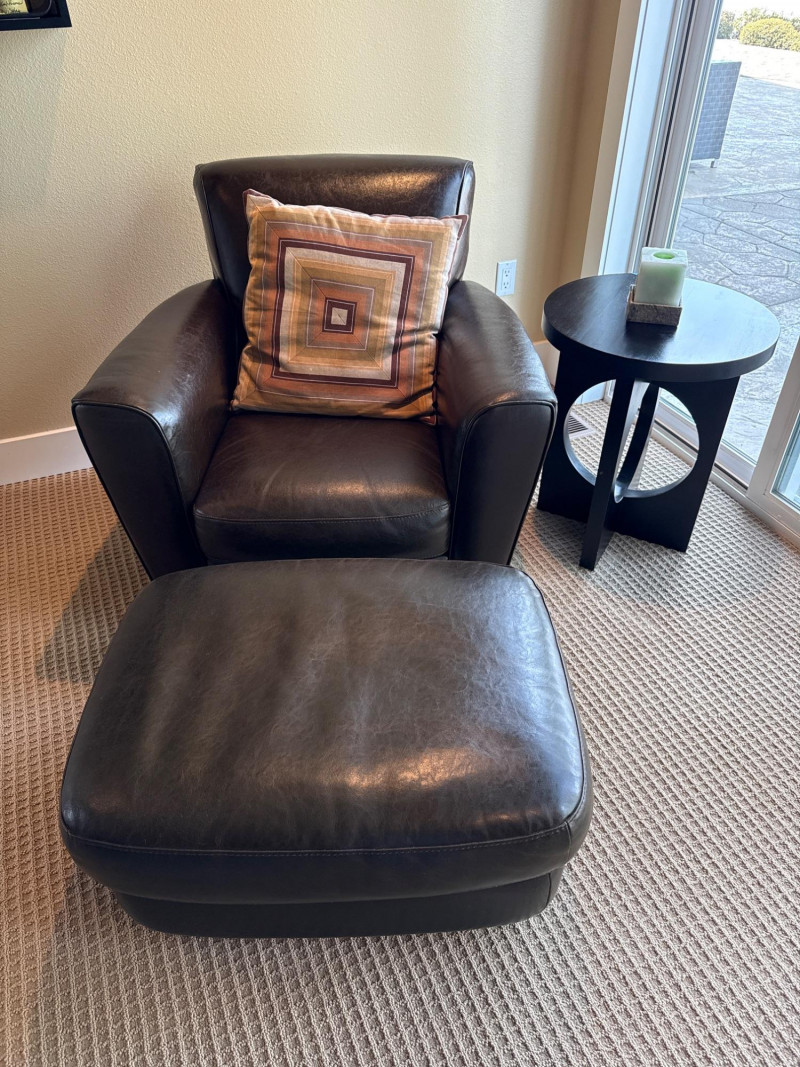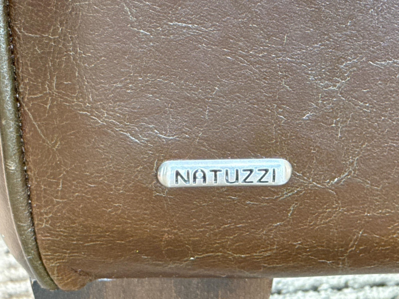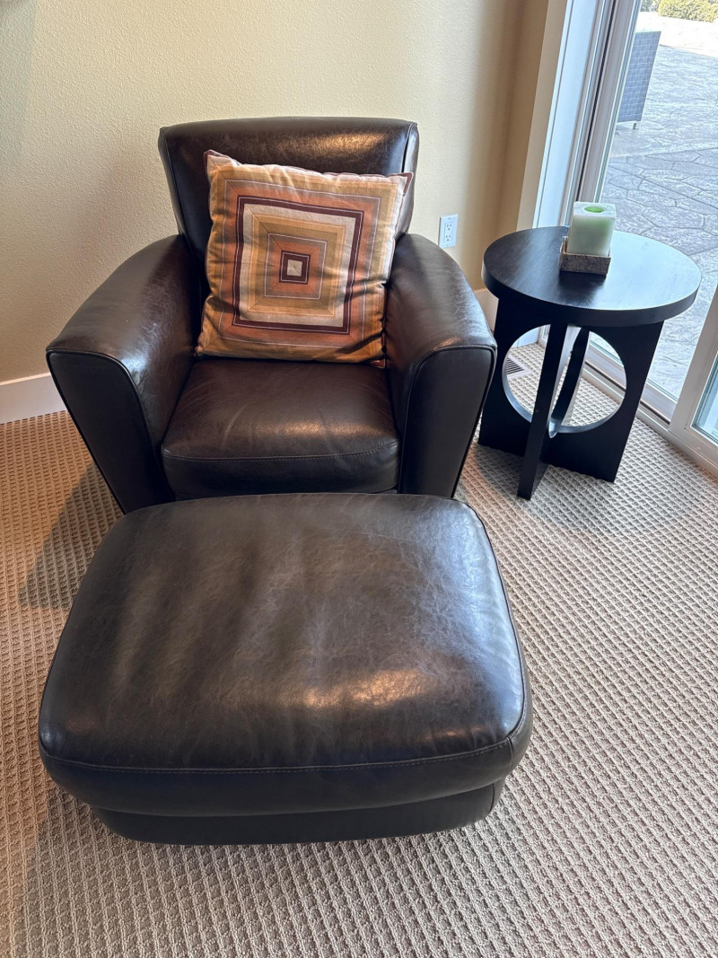 Elevate your space with this stylish and comfortable seating set featuring a genuine Natuzzi leather chair, matching ottoman, and modern side table. Pillow and candle included. This set showcases a sleek, contemporary design with rich brown leather upholstery and smooth, rounded arms for a cozy yet sophisticated look. The leather has developed a natural patina, adding character while still maintaining a clean, well-kept appearance. Like new appearance. Side Table is 20in wide, 24.5in tall Chair is 35in tall, 36in wide, 30in long approximately Ottoman is 15in tall, 36in wide, 17in long approximately