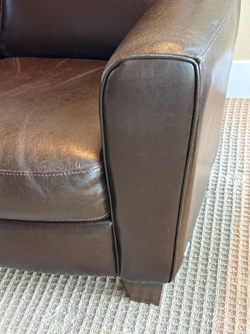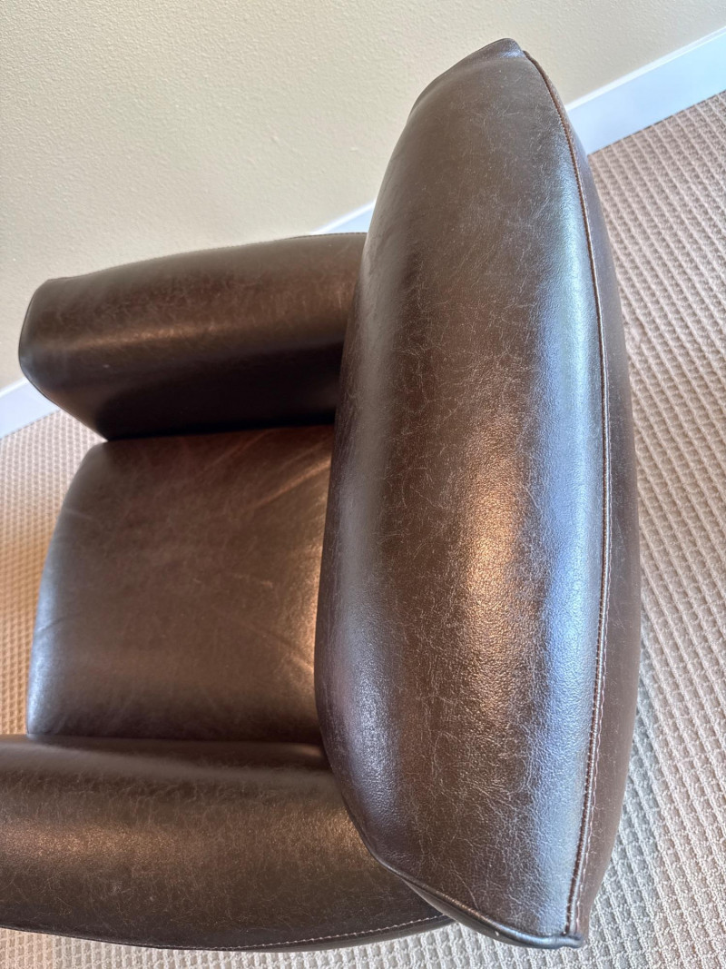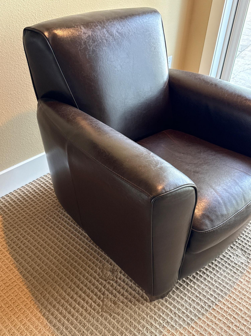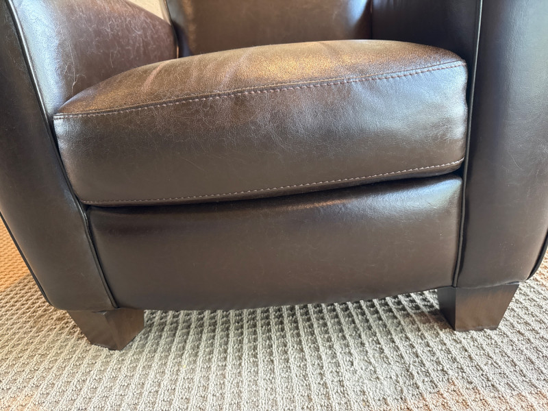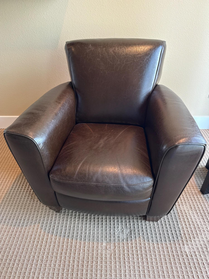 Elevate your space with this stylish and comfortable seating set featuring a genuine Natuzzi leather chair, matching ottoman, and modern side table. Pillow and candle included. This set showcases a sleek, contemporary design with rich brown leather upholstery and smooth, rounded arms for a cozy yet sophisticated look. The leather has developed a natural patina, adding character while still maintaining a clean, well-kept appearance. Like new appearance. Side Table is 20in wide, 24.5in tall Chair is 35in tall, 36in wide, 30in long approximately Ottoman is 15in tall, 36in wide, 17in long approximately
