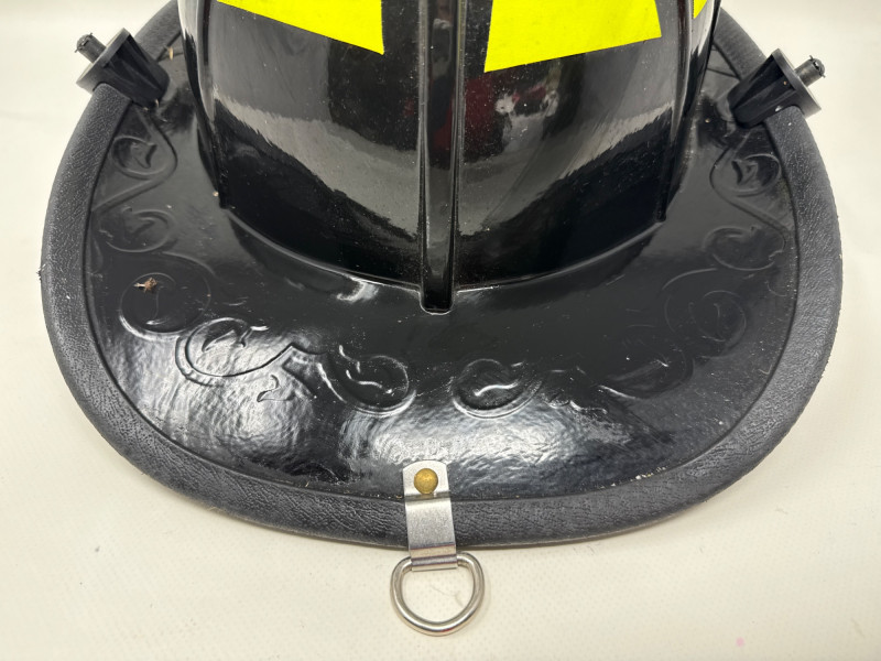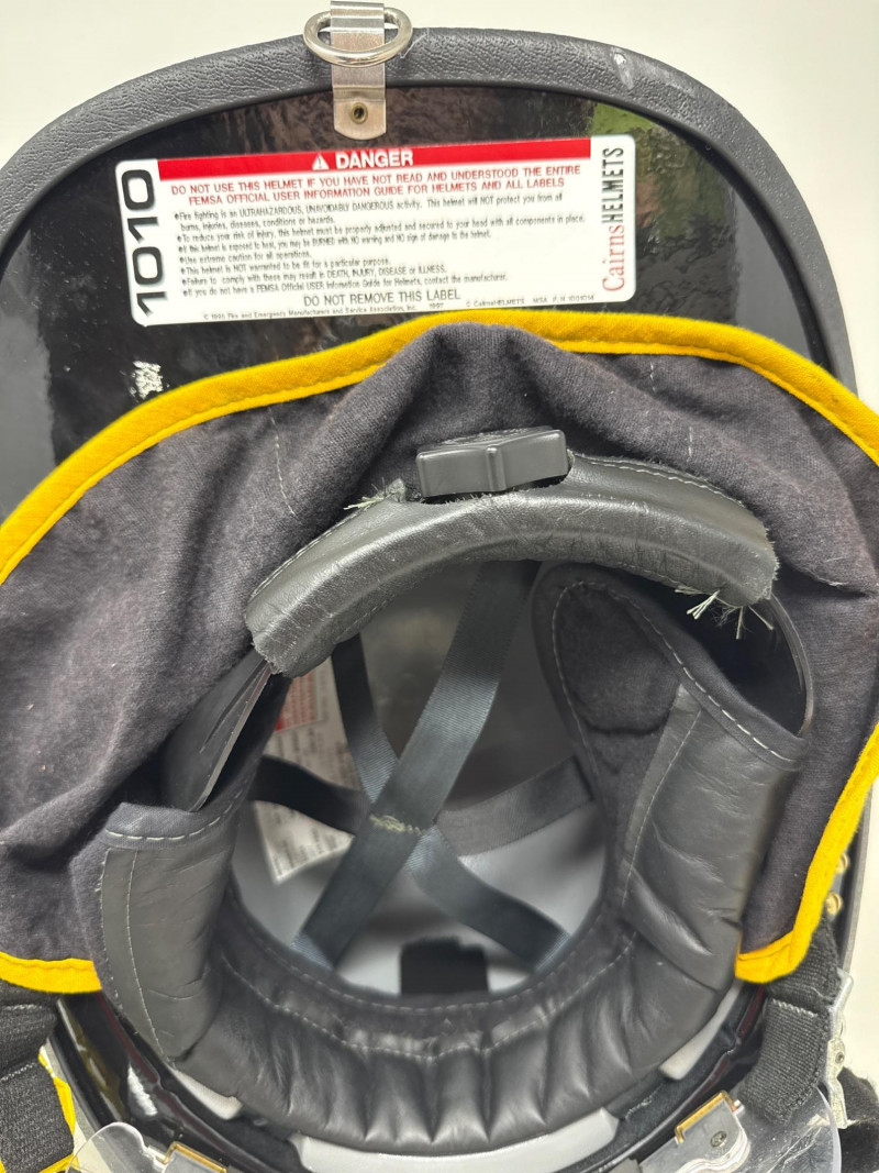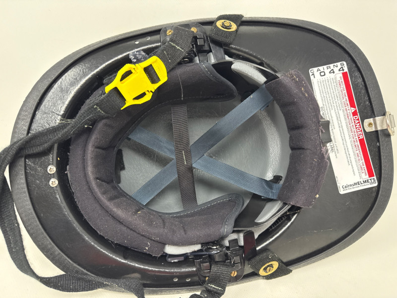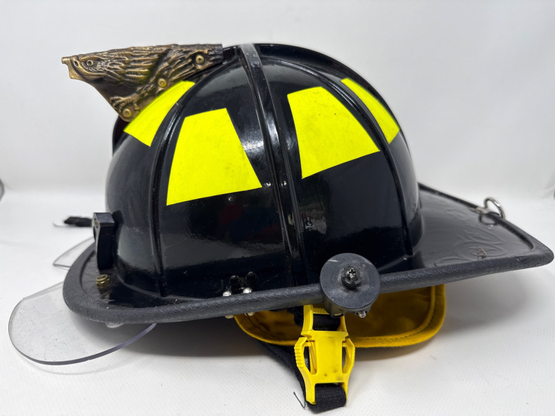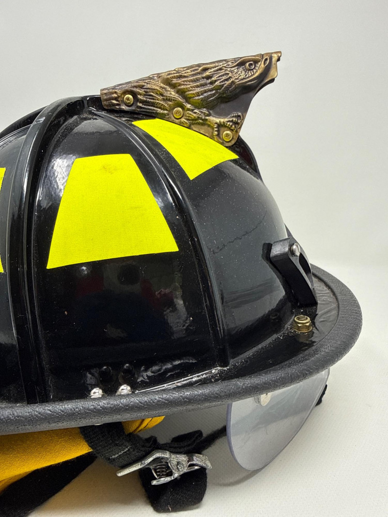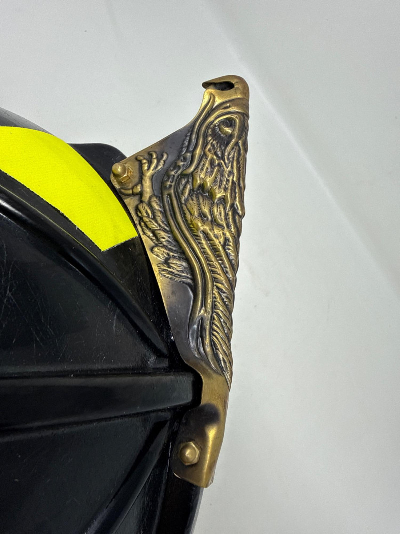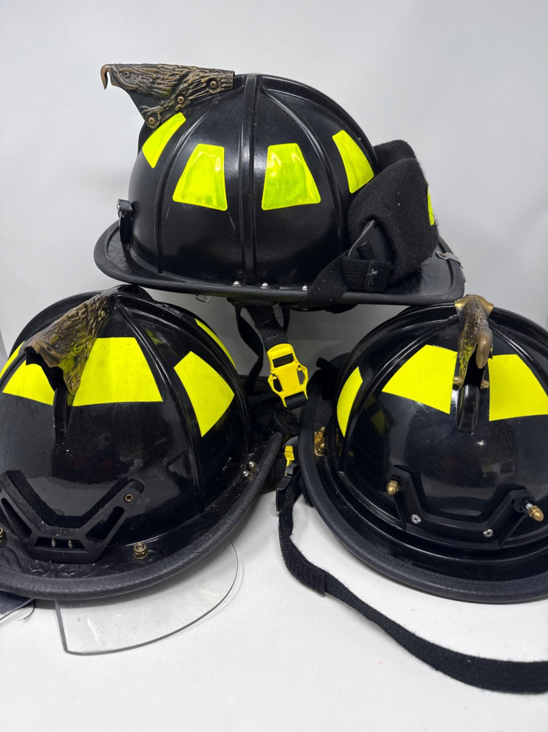 Lot of three vintage firefighter helmets featuring classic brass eagle finials and traditional black leather construction. Includes Cairns helmets with visible interior tags and components, showing authentic wear consistent with use such as scuffs and aging to liners and straps. A great collectible set for firefighting memorabilia enthusiasts, display, or restoration. Made in USA One has a broken beak.