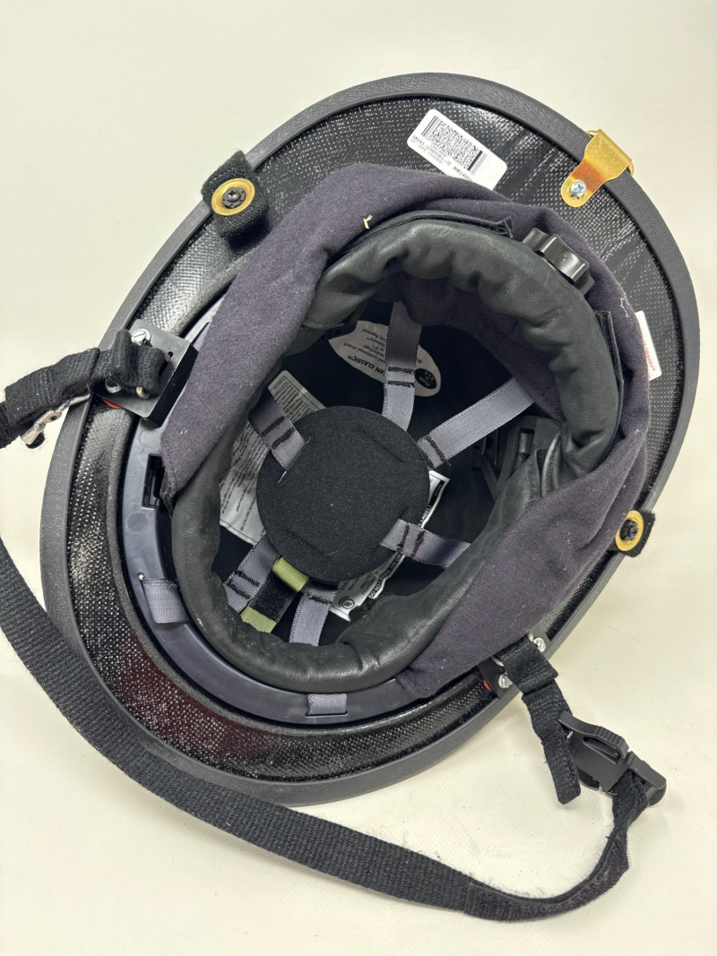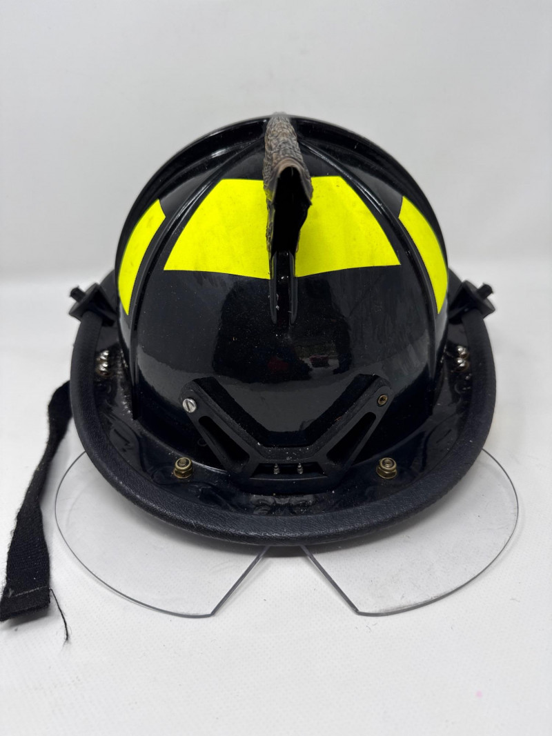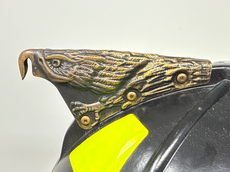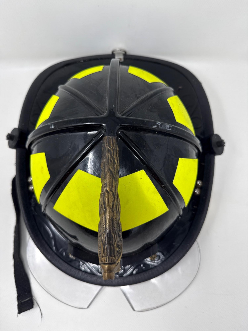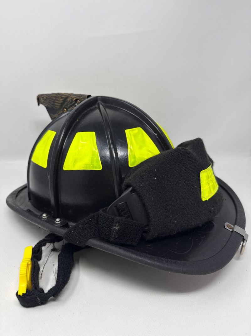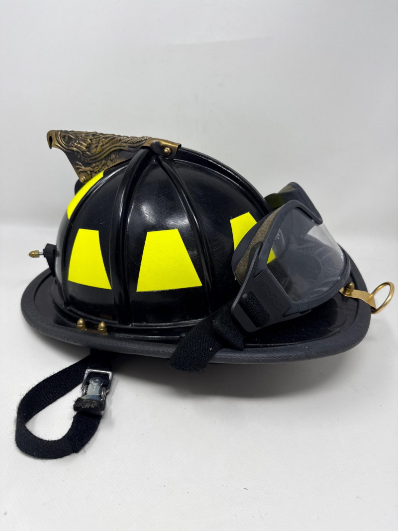 Lot of three vintage firefighter helmets featuring classic brass eagle finials and traditional black leather construction. Includes Cairns helmets with visible interior tags and components, showing authentic wear consistent with use such as scuffs and aging to liners and straps. A great collectible set for firefighting memorabilia enthusiasts, display, or restoration. Made in USA One has a broken beak.