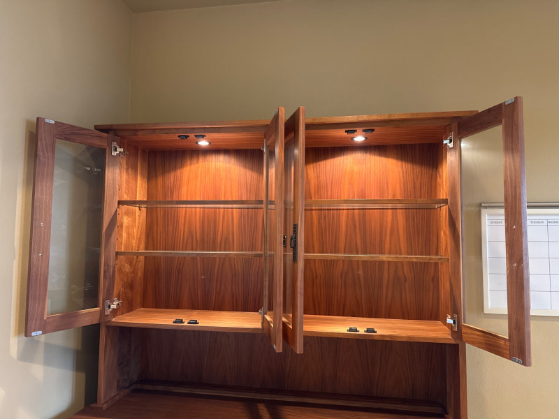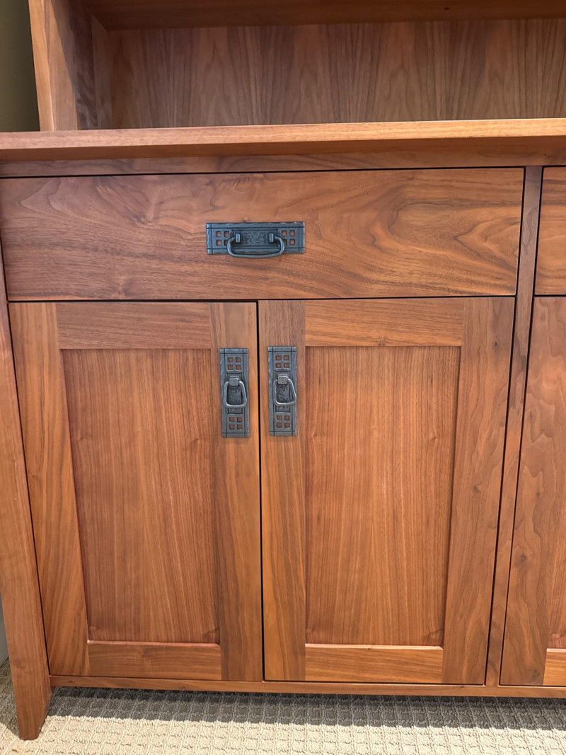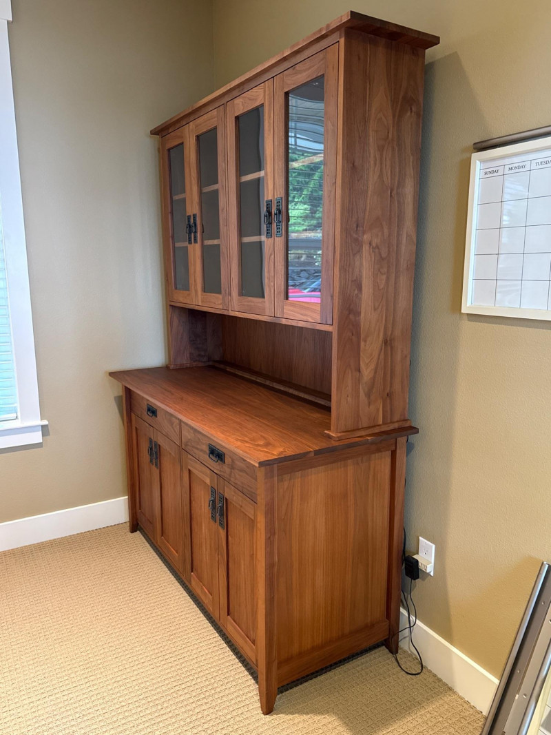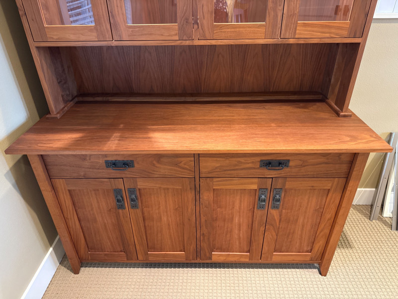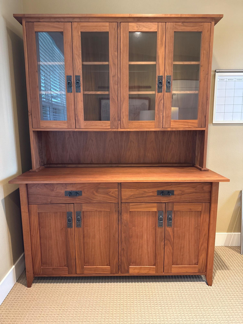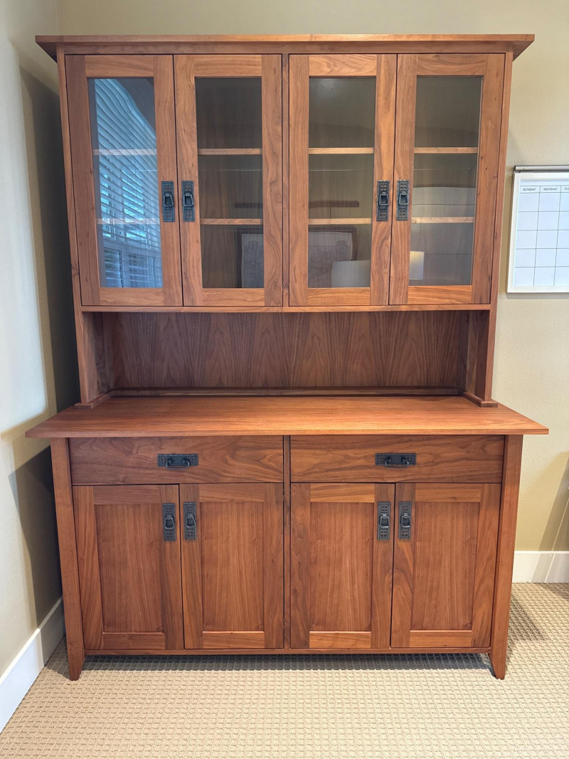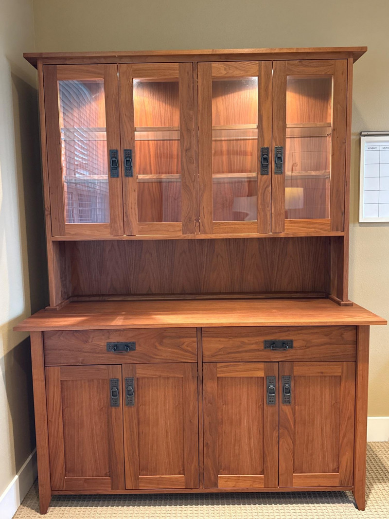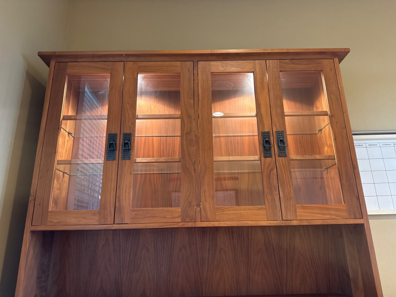 Solid wood Mission-style hutch featuring a two-piece design with a spacious lower buffet and upper display cabinet. The top section includes glass-paneled doors, adjustable glass shelves, and built-in interior lighting—perfect for showcasing dishes, décor, or collectibles. The base offers ample storage with two drawers and four cabinet doors, all accented with classic dark metal hardware. Finished in a warm wood tone with beautiful grain throughout, this Arts & Crafts–inspired piece combines functionality with timeless style. **MUST BRING TOOLS AND SUPPORT TO HELP LOAD. EASY LOAD LOCATION. ONE STAIR.**