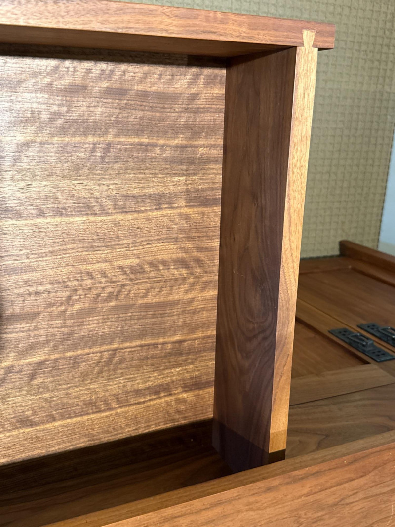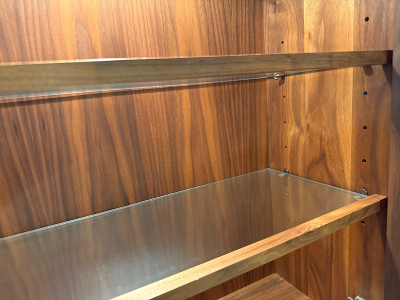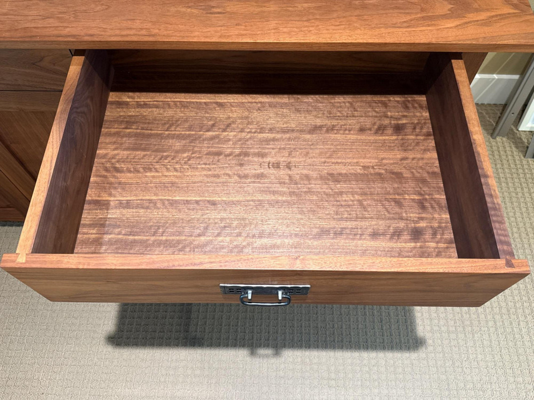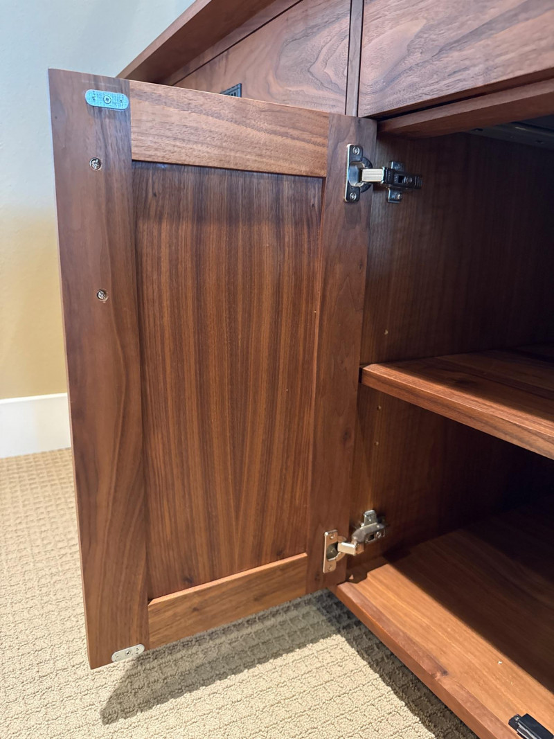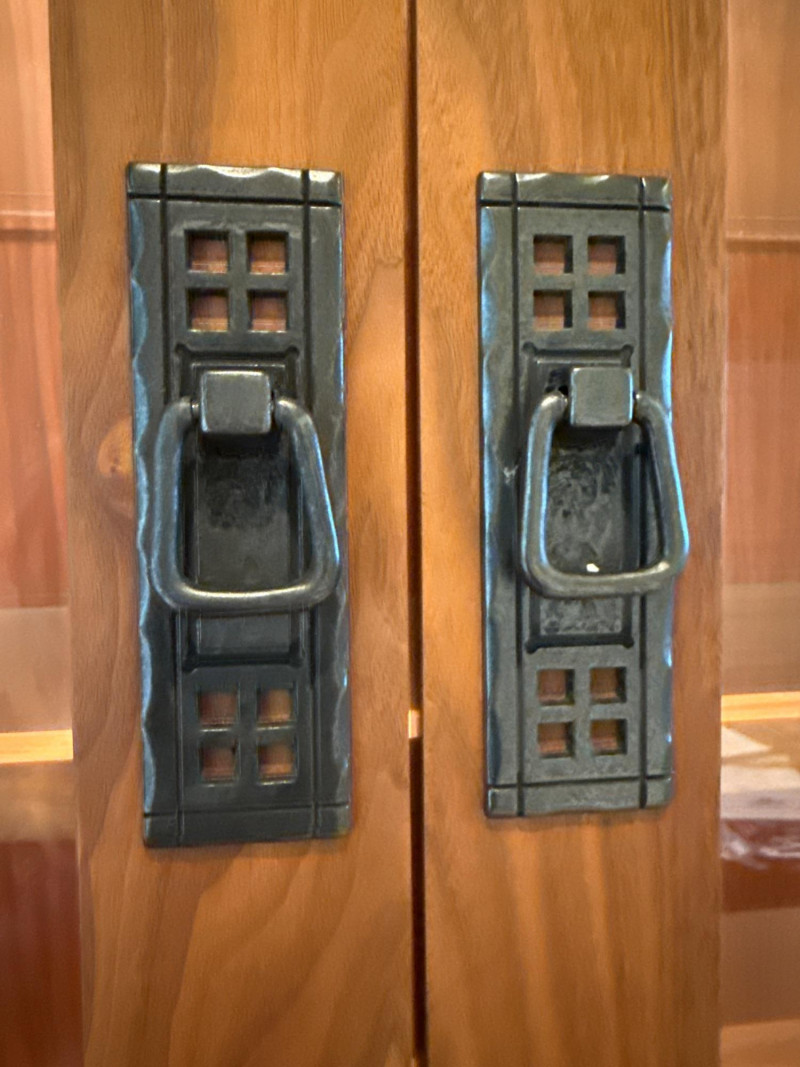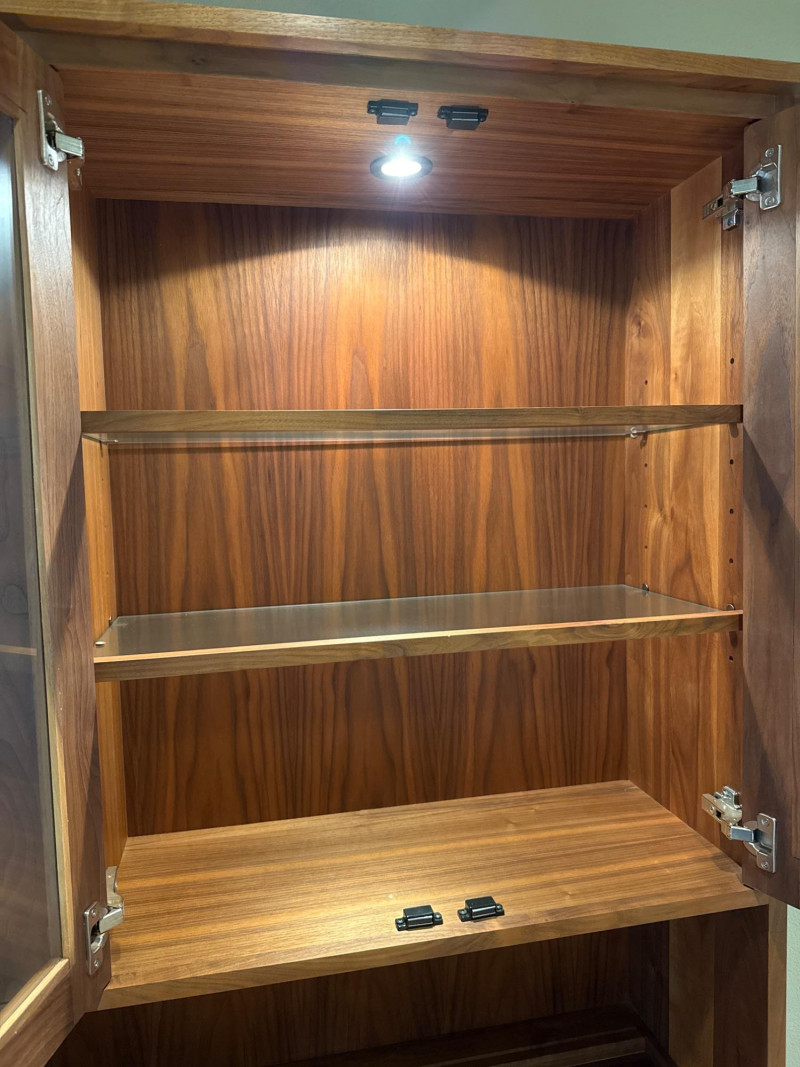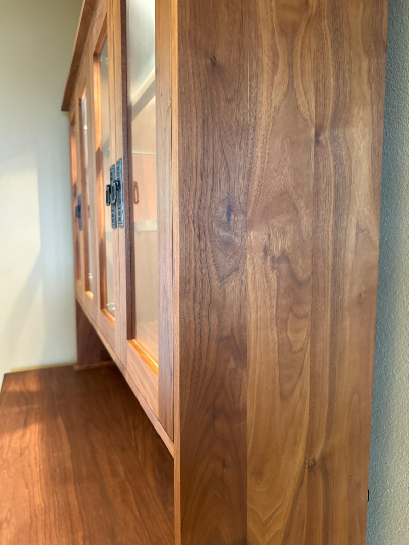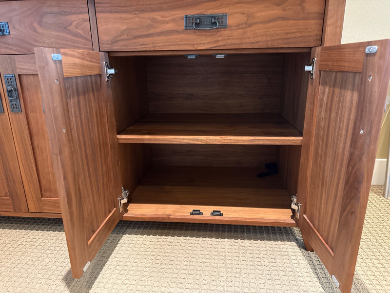 Solid wood Mission-style hutch featuring a two-piece design with a spacious lower buffet and upper display cabinet. The top section includes glass-paneled doors, adjustable glass shelves, and built-in interior lighting—perfect for showcasing dishes, décor, or collectibles. The base offers ample storage with two drawers and four cabinet doors, all accented with classic dark metal hardware. Finished in a warm wood tone with beautiful grain throughout, this Arts & Crafts–inspired piece combines functionality with timeless style. **MUST BRING TOOLS AND SUPPORT TO HELP LOAD. EASY LOAD LOCATION. ONE STAIR.**