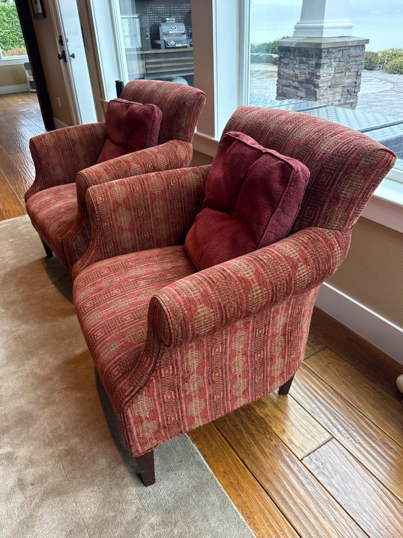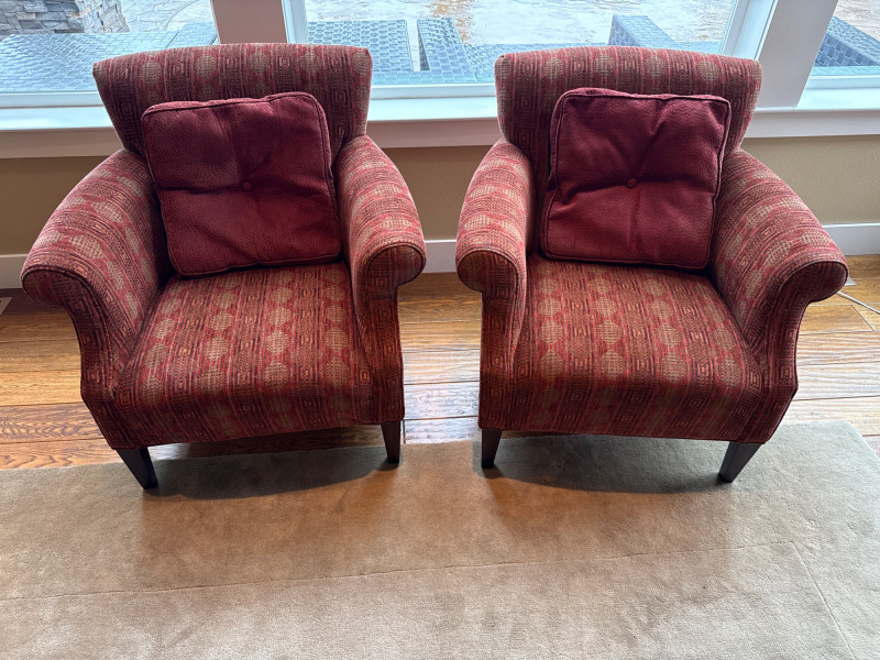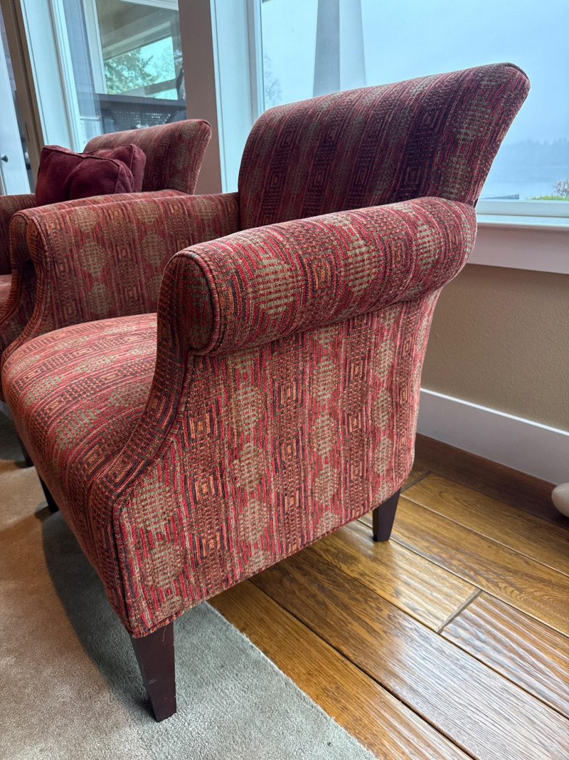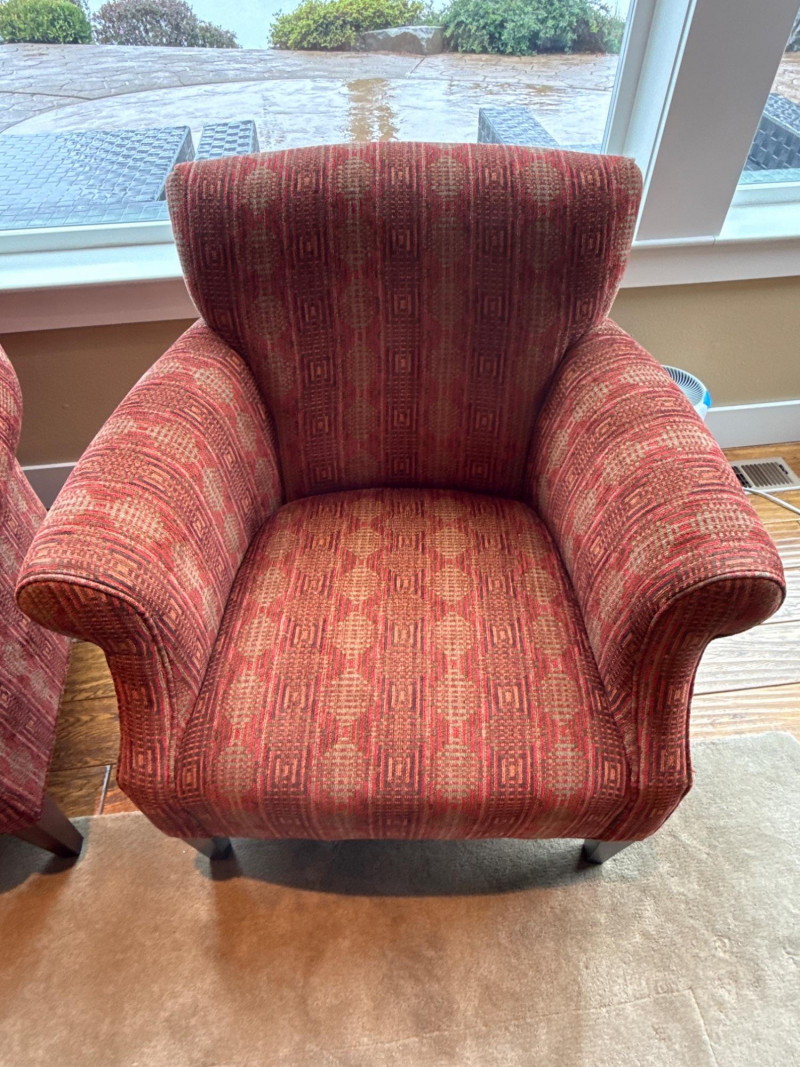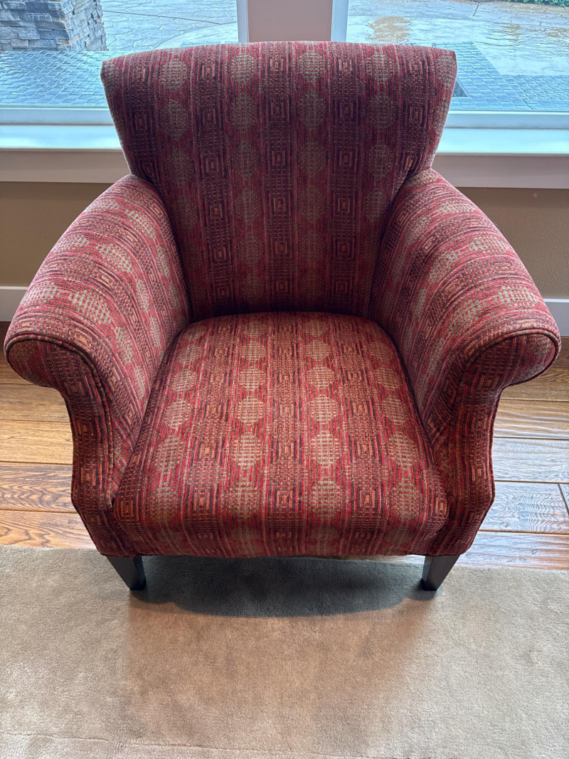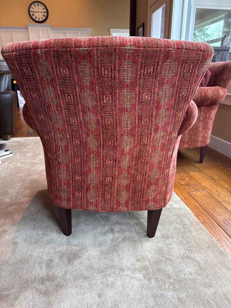 Stylish and comfortable pair of upholstered accent chairs by McCreary Modern. These chairs feature a rich red geometric patterned fabric, rolled arms, and a slightly flared back design that adds a classic yet contemporary touch to any space. Each chair includes a matching loose back cushion for added comfort and visual appeal. Built with a sturdy wood frame and dark tapered legs, they are both durable and elegant **MUST BRING TOOLS AND SUPPORT TO HELP LOAD. EASY LOAD LOCATION. ONE STEP**
