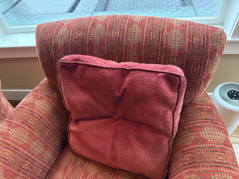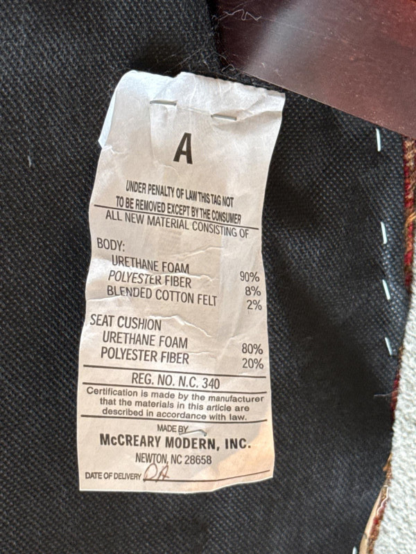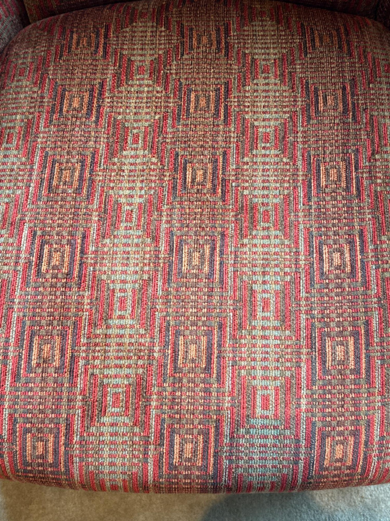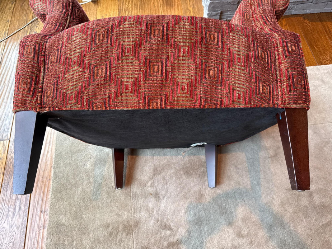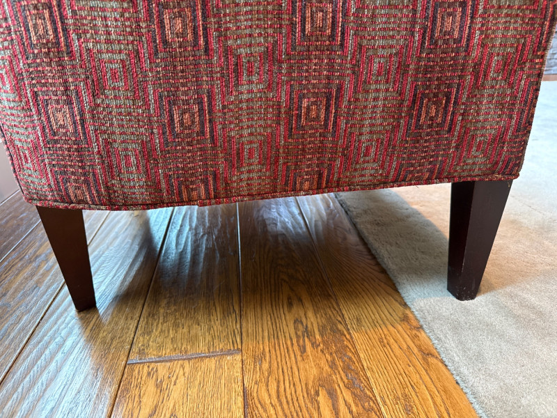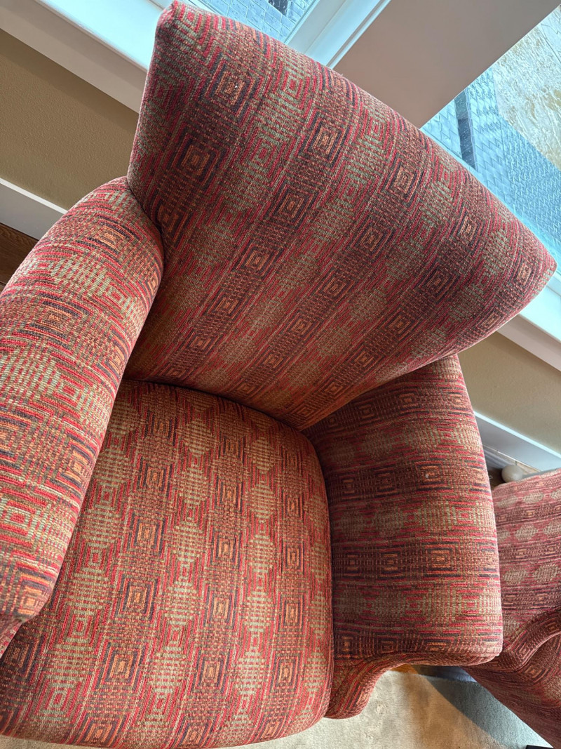 Stylish and comfortable pair of upholstered accent chairs by McCreary Modern. These chairs feature a rich red geometric patterned fabric, rolled arms, and a slightly flared back design that adds a classic yet contemporary touch to any space. Each chair includes a matching loose back cushion for added comfort and visual appeal. Built with a sturdy wood frame and dark tapered legs, they are both durable and elegant **MUST BRING TOOLS AND SUPPORT TO HELP LOAD. EASY LOAD LOCATION. ONE STEP**