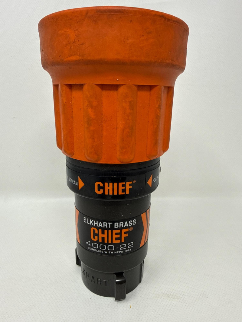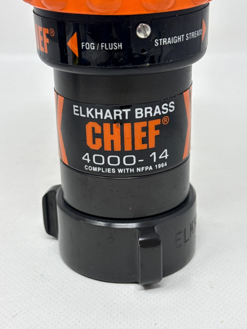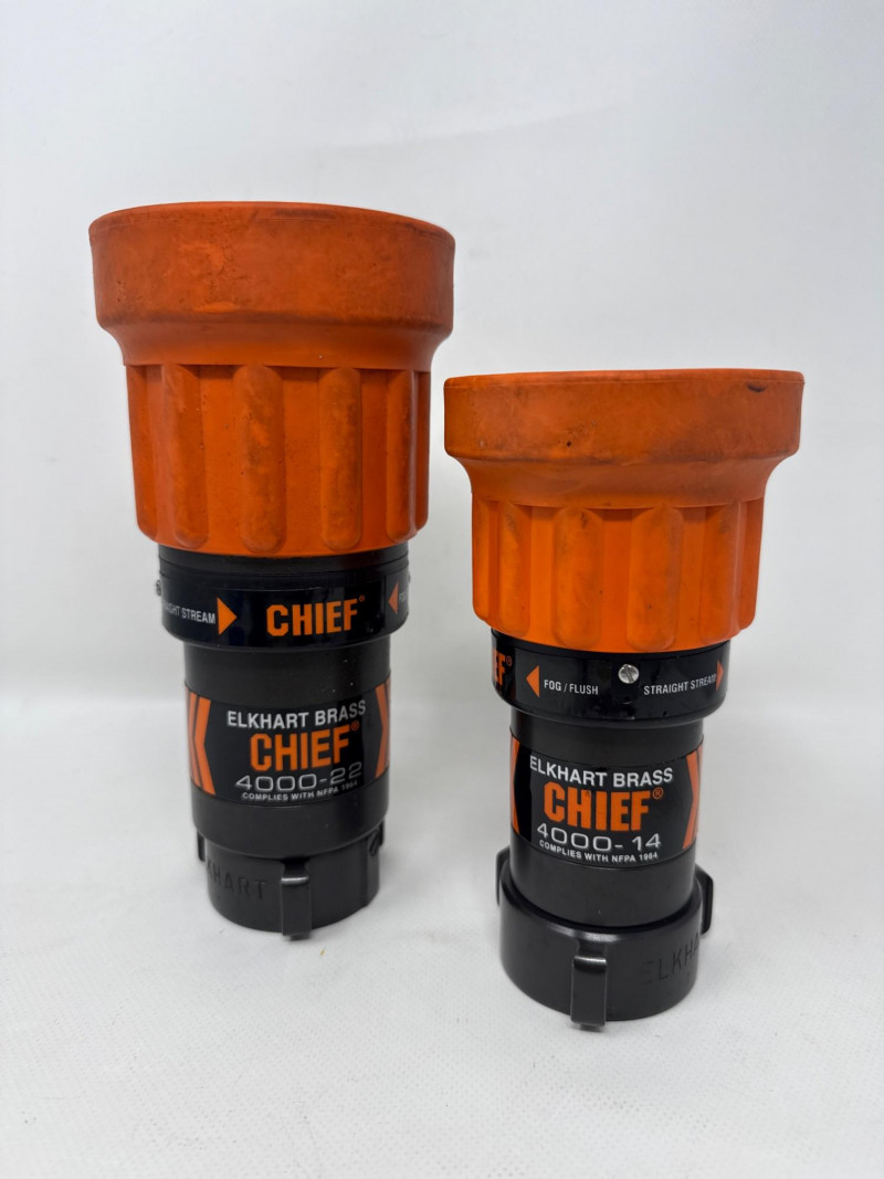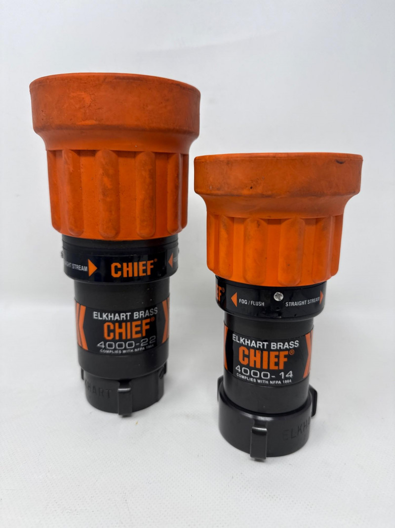Lot of two Elkhart Brass Chief fire hose nozzles, models 4000-22 and 4000-14. These are professional-grade firefighting nozzles designed for fixed gallonage flow, capable of switching from straight stream to fog/flush patterns. Both units feature durable construction with orange rubber bumpers and adjustable pattern rings. Ideal for collectors, training use, or fire equipment applications. Included: Approx. Dimensions: