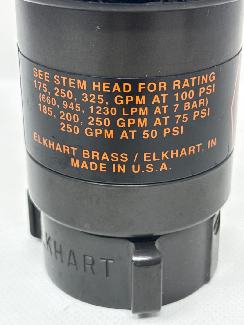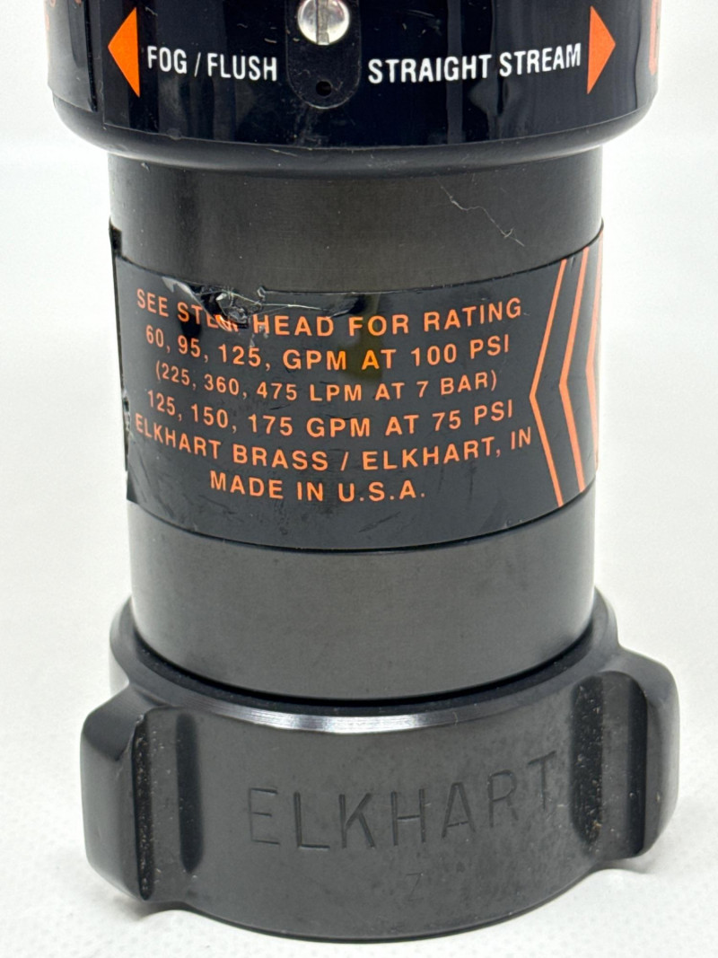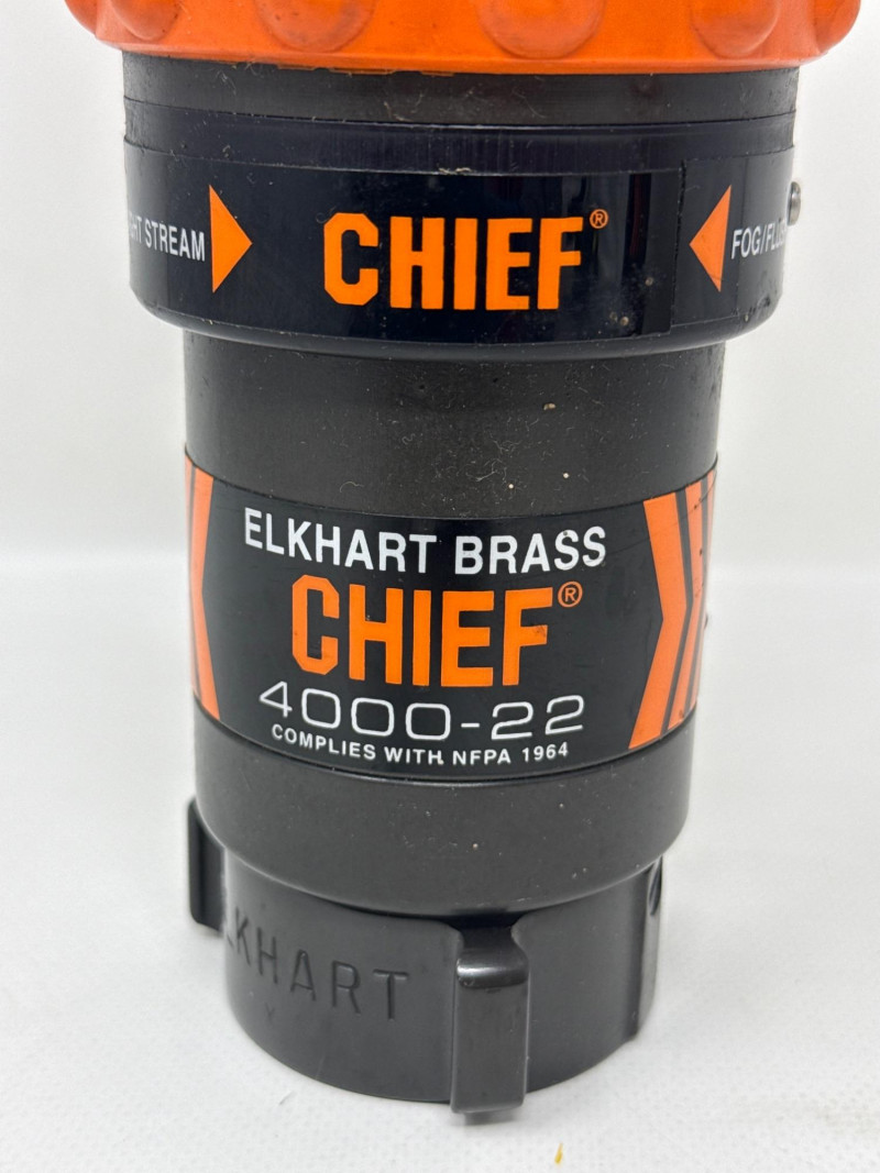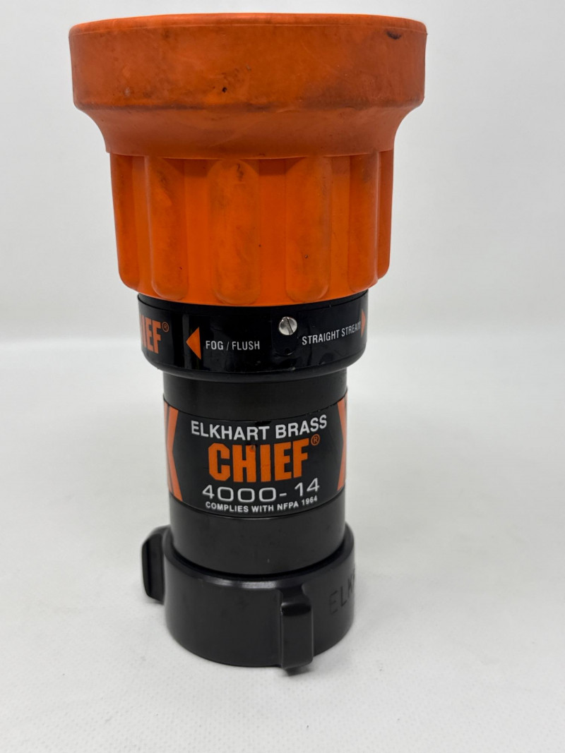 Lot of two Elkhart Brass Chief fire hose nozzles, models 4000-22 and 4000-14. These are professional-grade firefighting nozzles designed for fixed gallonage flow, capable of switching from straight stream to fog/flush patterns. Both units feature durable construction with orange rubber bumpers and adjustable pattern rings. Ideal for collectors, training use, or fire equipment applications. Included: Approx. Dimensions: