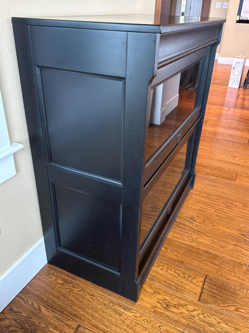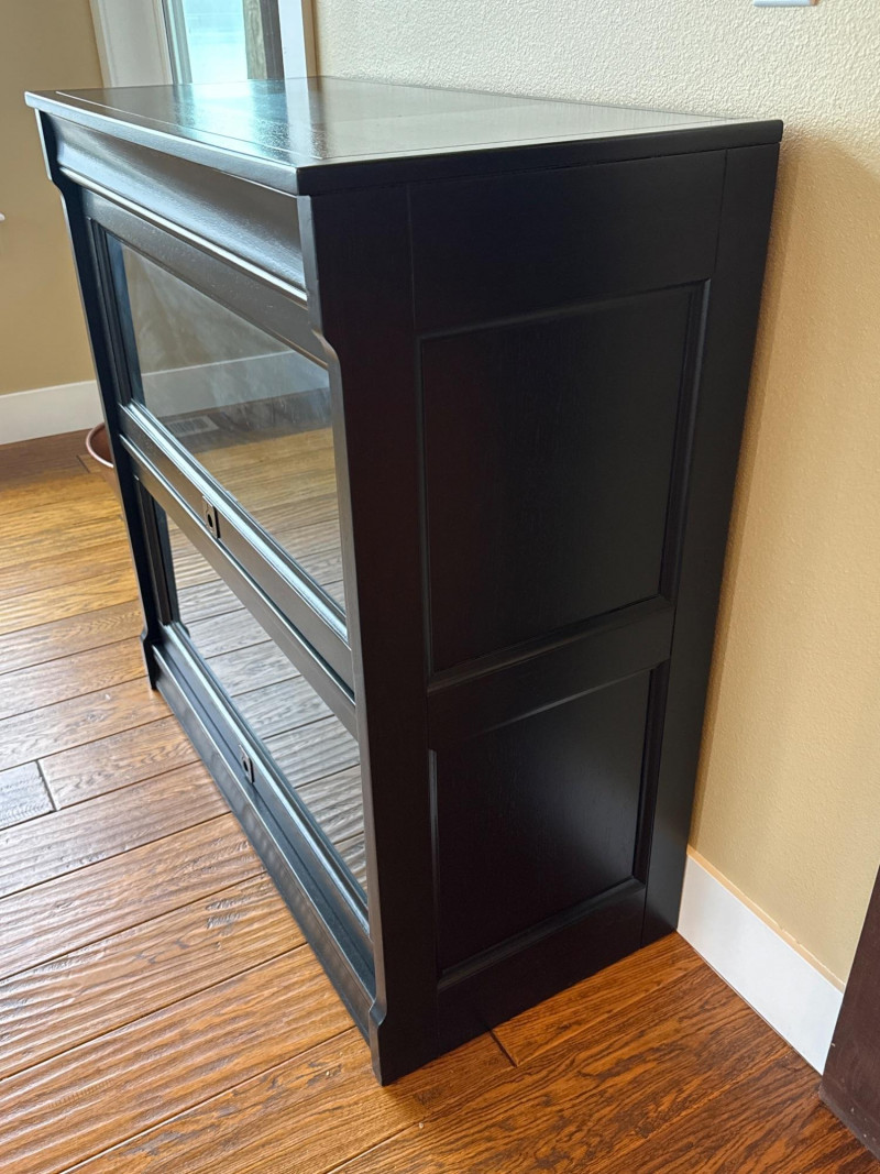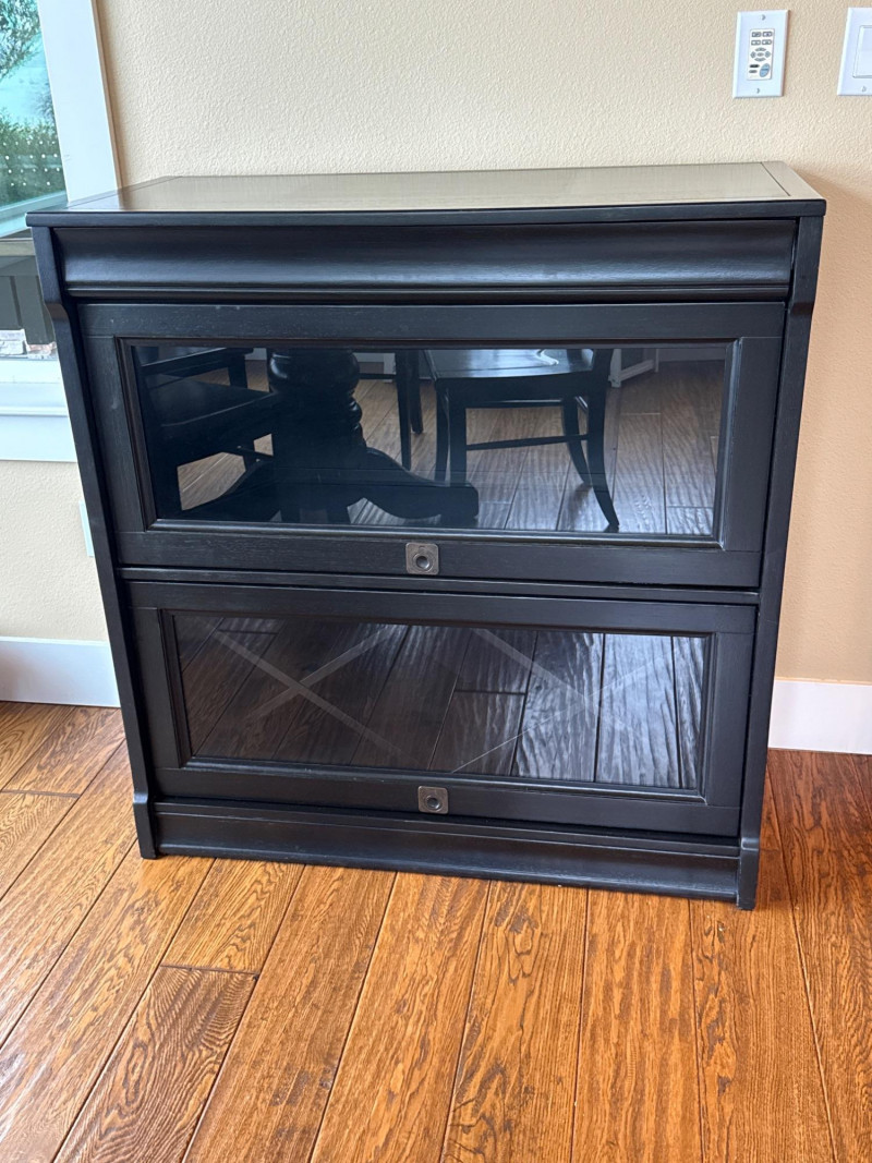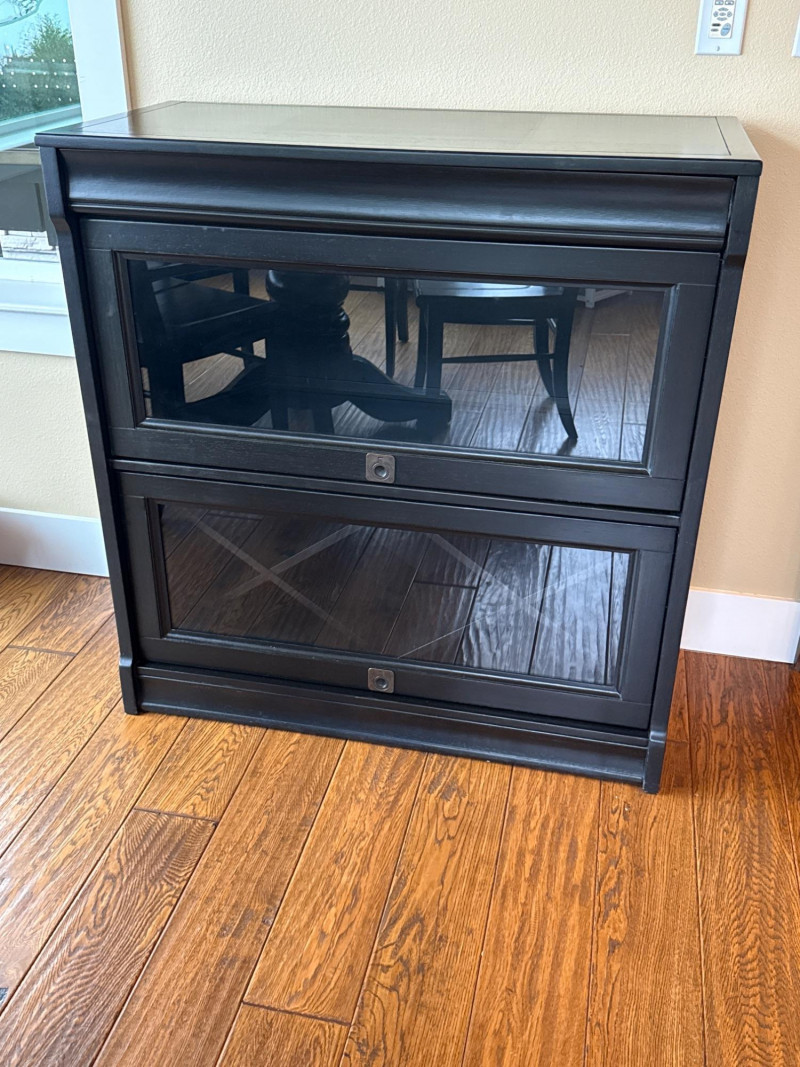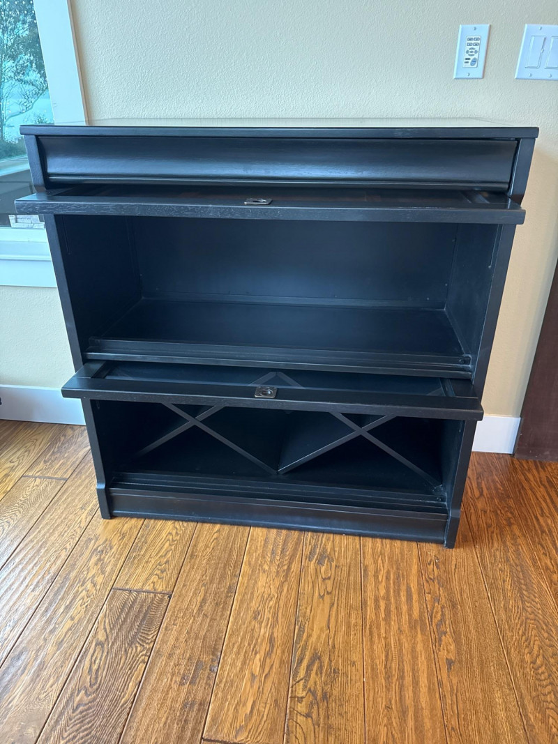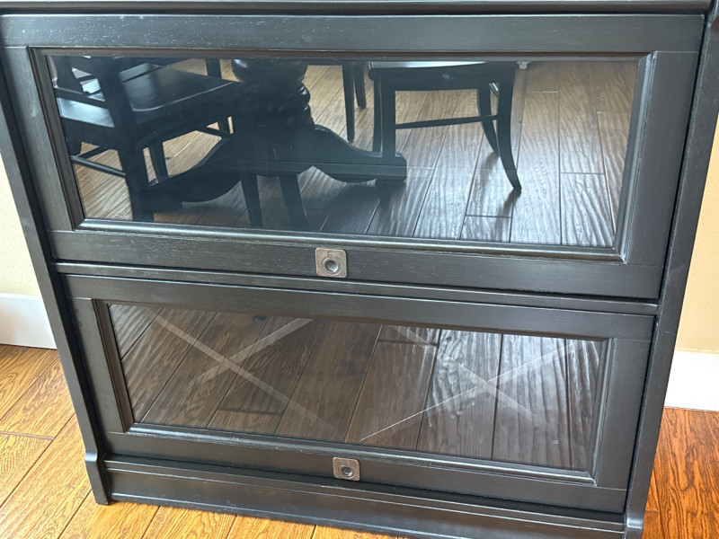 Stylish and functional black wood barrister-style bookcase featuring two glass-front cabinet sections with lift-up doors. This versatile piece doubles as a display cabinet and wine storage unit, with a built-in X-style wine rack in the lower section. Crafted with a classic design, it offers ample storage for books, collectibles, glassware, or bottles. The glass panels allow for easy viewing while keeping contents protected. One piece. **MUST BRING TOOLS AND SUPPORT TO HELP LOAD. EASY LOAD LOCATION. ONE STEP**