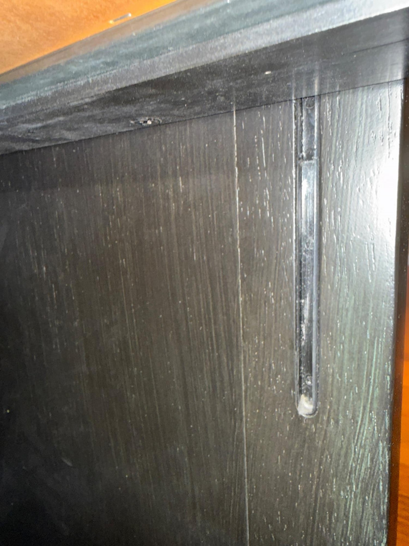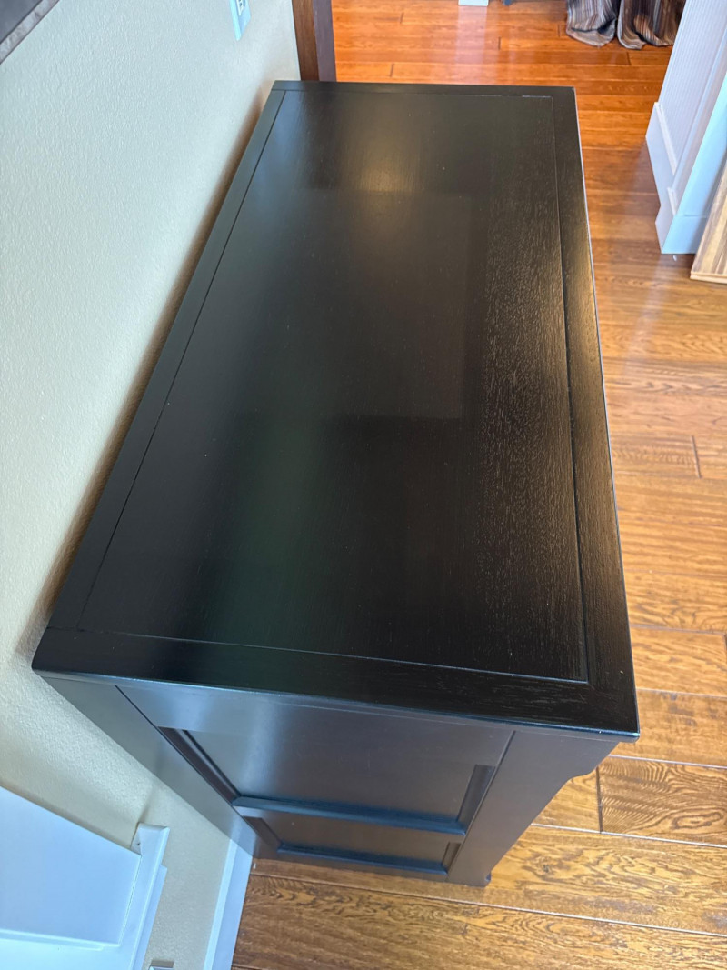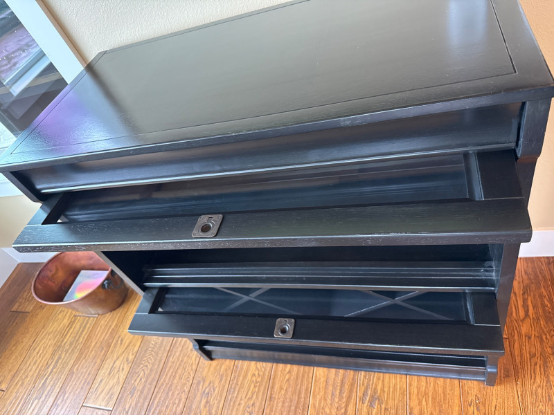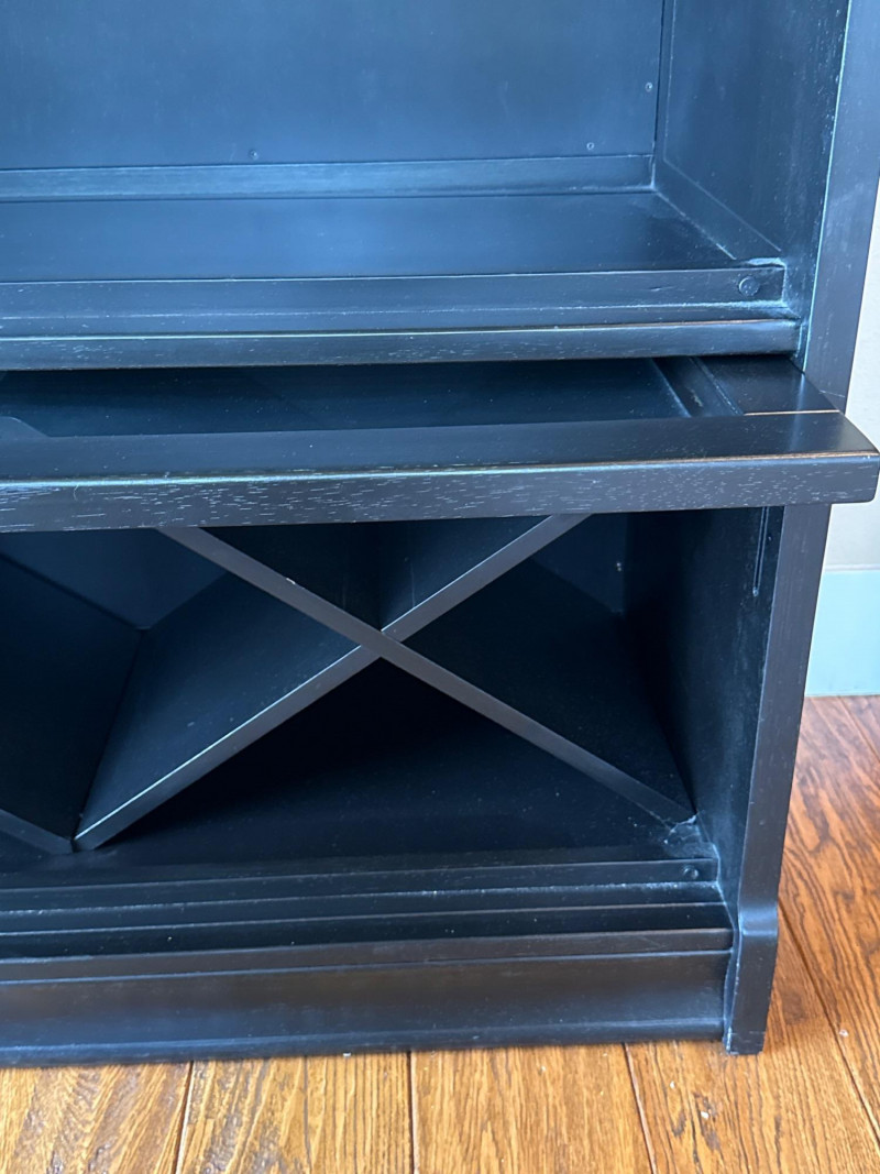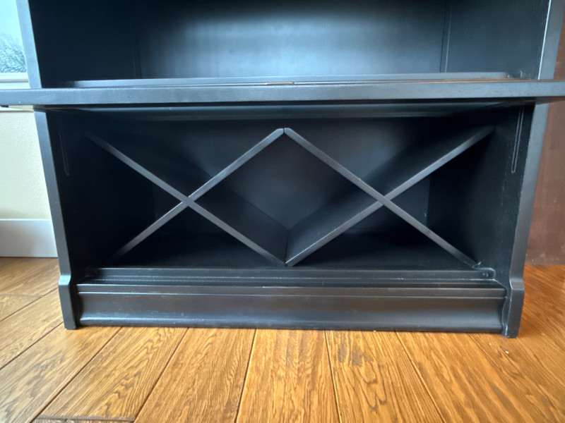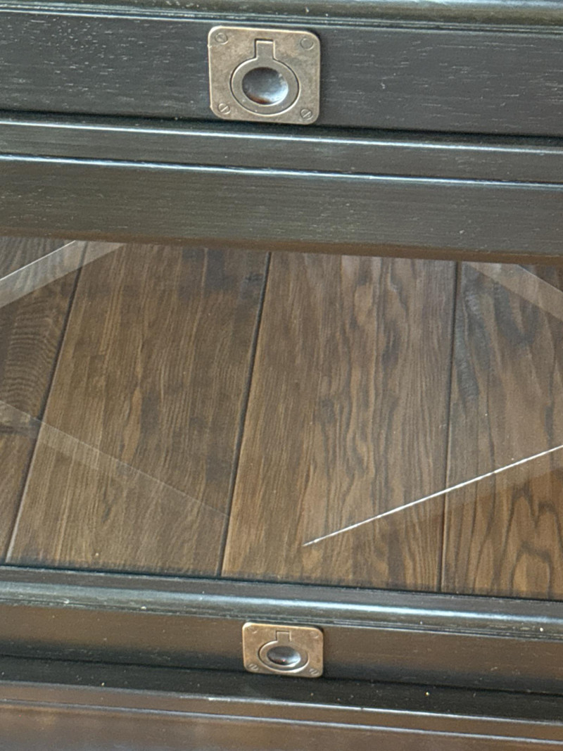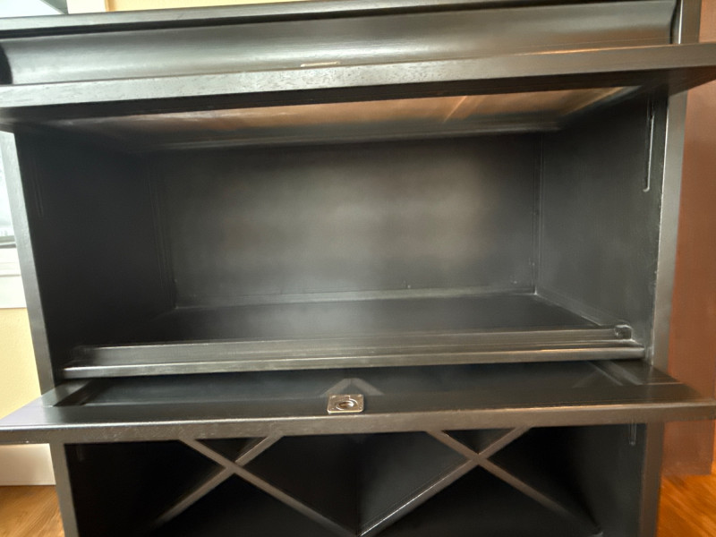 Stylish and functional black wood barrister-style bookcase featuring two glass-front cabinet sections with lift-up doors. This versatile piece doubles as a display cabinet and wine storage unit, with a built-in X-style wine rack in the lower section. Crafted with a classic design, it offers ample storage for books, collectibles, glassware, or bottles. The glass panels allow for easy viewing while keeping contents protected. One piece. **MUST BRING TOOLS AND SUPPORT TO HELP LOAD. EASY LOAD LOCATION. ONE STEP**