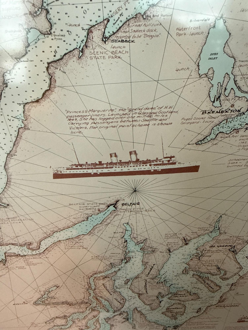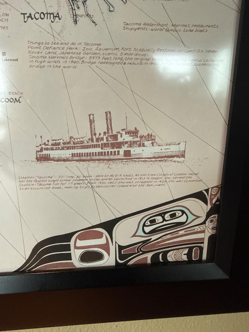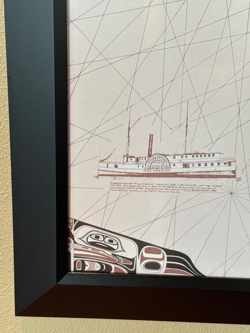 Framed decorative map featuring Puget Sound and the San Juan Islands, designed in a vintage nautical chart style. Includes detailed coastal outlines, maritime routes, and illustrated ships, giving it a classic Pacific Northwest maritime feel. Printed in soft neutral tones with light blue water accents, housed in a black frame under glass. Ideal for coastal décor, office display, or collectors of map and nautical-themed artwork.
