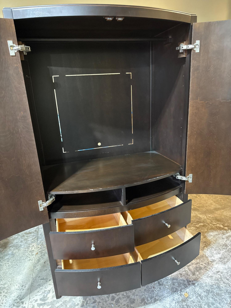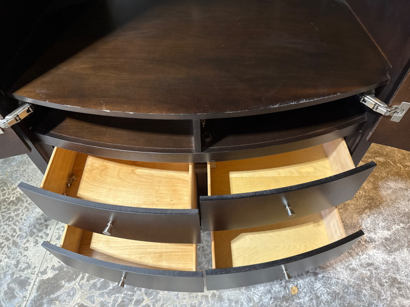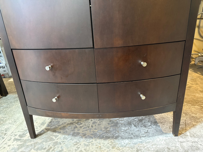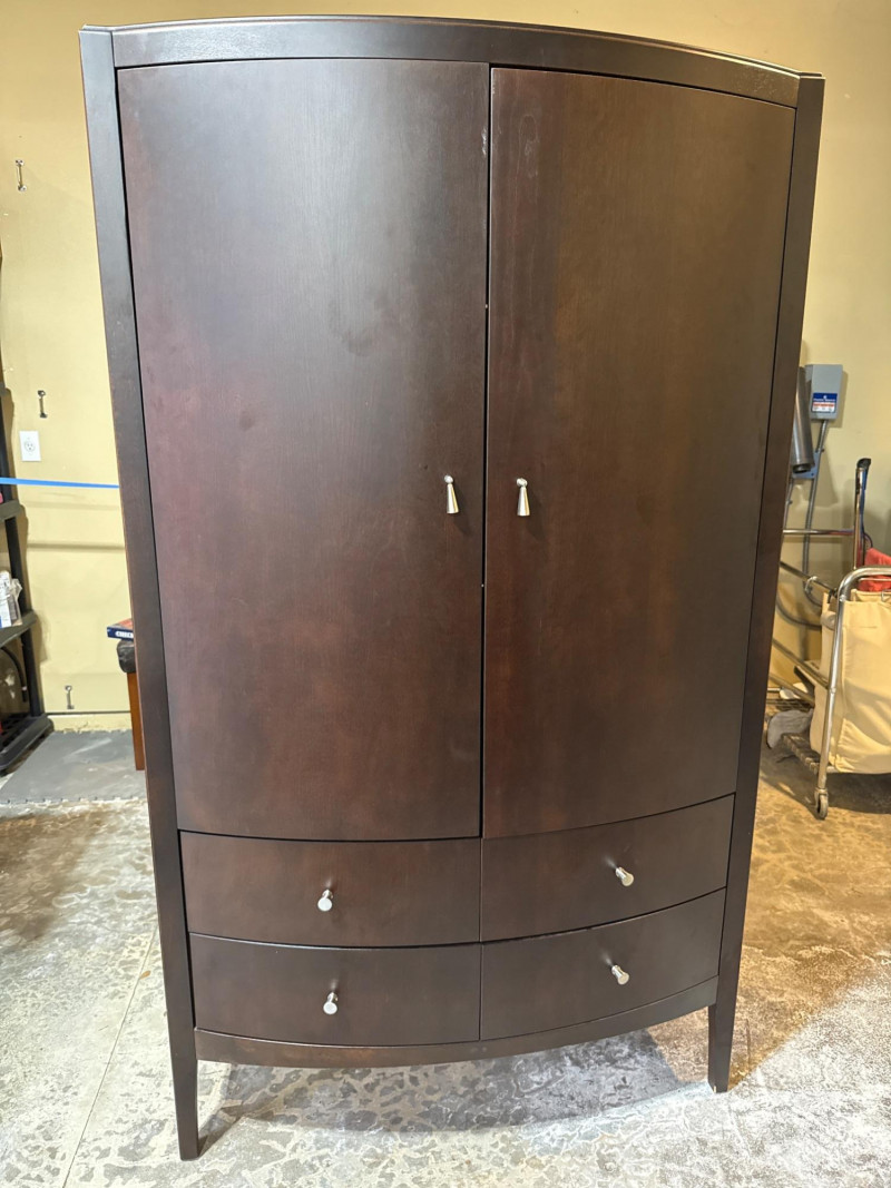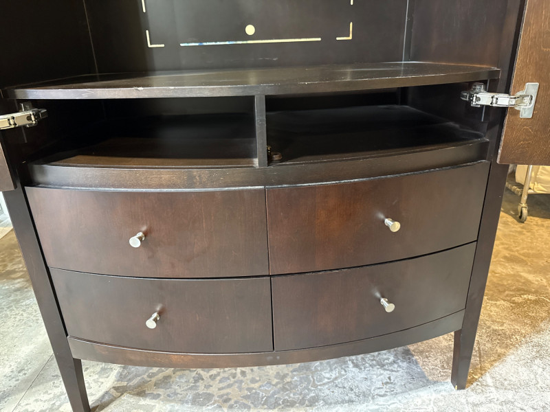 Classic Bombay armoire featuring a rich dark wood finish and signature curved front design. Includes two cabinet doors with interior shelving and cable management cutout, plus four lower drawers for additional storage. Finished with elegant silver-tone hardware and tapered legs, offering both style and functionality. Some light wear/tear consistent with use.