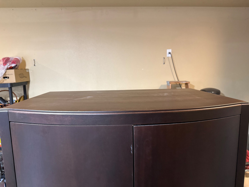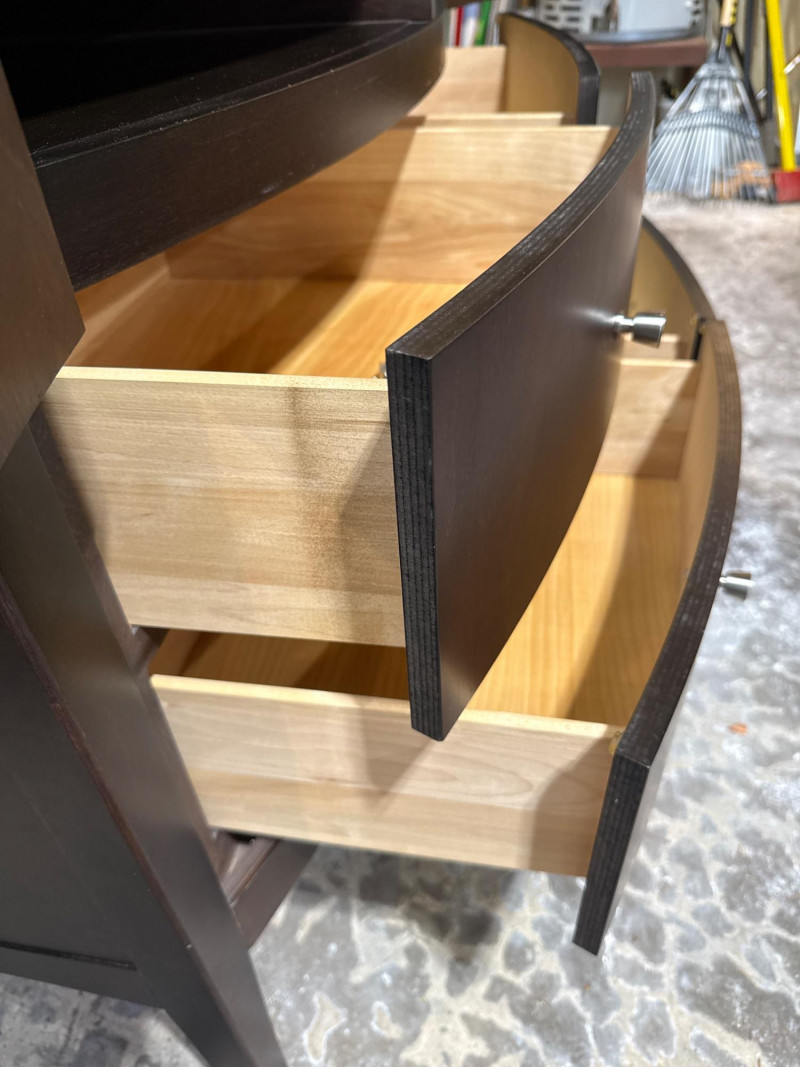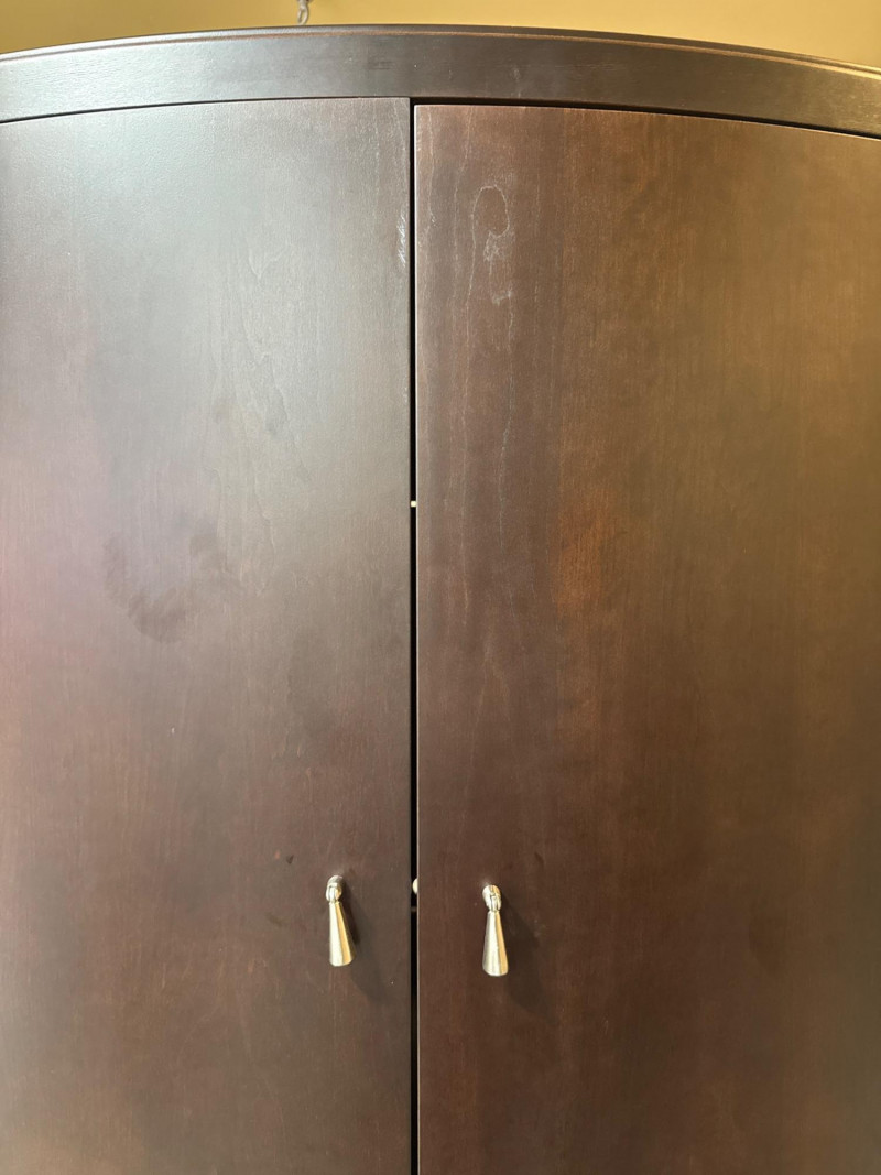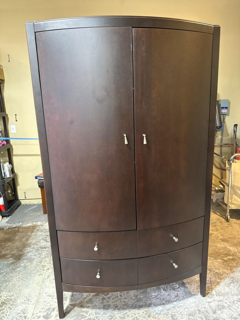 Classic Bombay armoire featuring a rich dark wood finish and signature curved front design. Includes two cabinet doors with interior shelving and cable management cutout, plus four lower drawers for additional storage. Finished with elegant silver-tone hardware and tapered legs, offering both style and functionality. Some light wear/tear consistent with use.