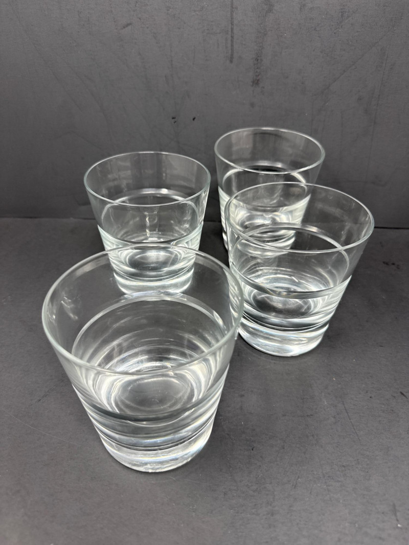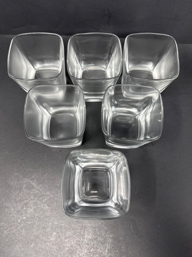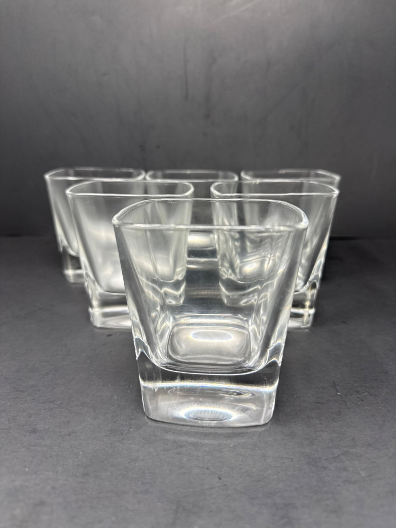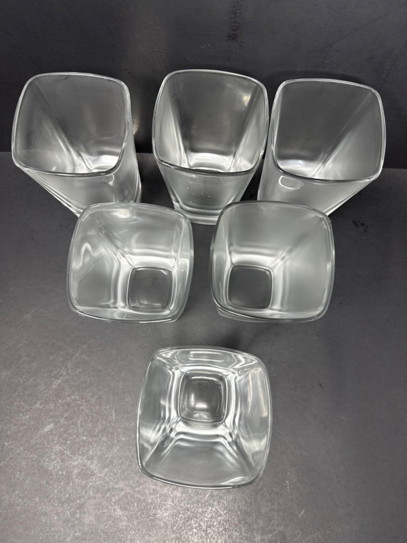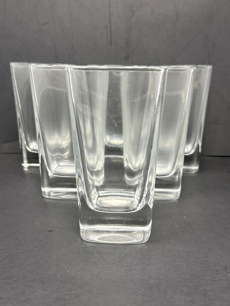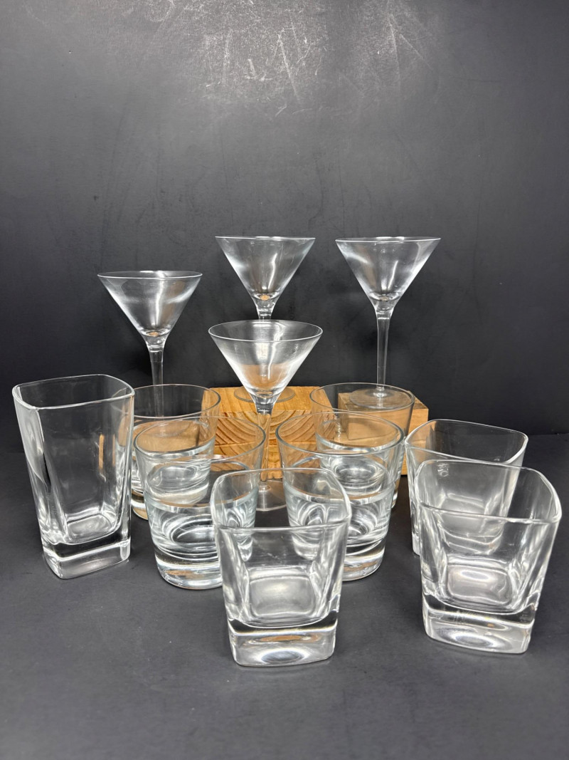 Stylish and versatile barware set perfect for entertaining or upgrading your home bar. This collection includes a mix of classic and modern glassware along with essential bar tools, all in great condition. The set features elegant martini glasses, square and round highball glasses, and Crate & Barrel Callaway double old-fashioned glasses—ideal for serving cocktails, whiskey, or everyday beverages. Also included are two metal stoppers, a stainless steel martini shaker, and a wood and glass serving tray for easy presentation. Dimensions: