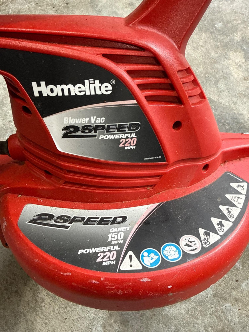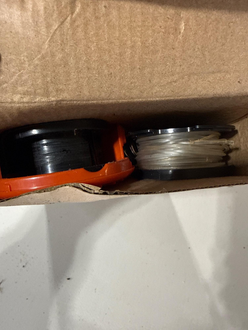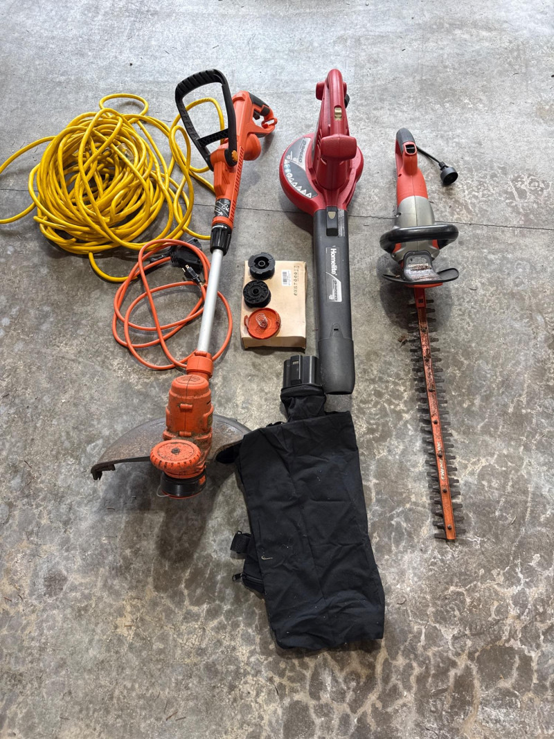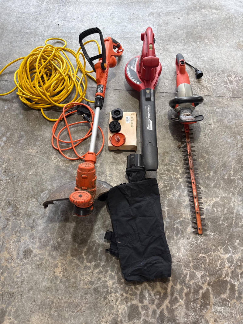 Black and Decker Electric String Trimmer, lightweight, corded string trimmer. Powered up. Includes several new and one used coil. One box of new coils. A yellow extension cord with a section that is taped. Approximately 50-100ft. Shorter orange cord. Approximately 5ft. Homelite Leaf Blower/Vacuum