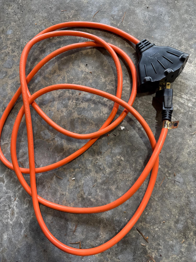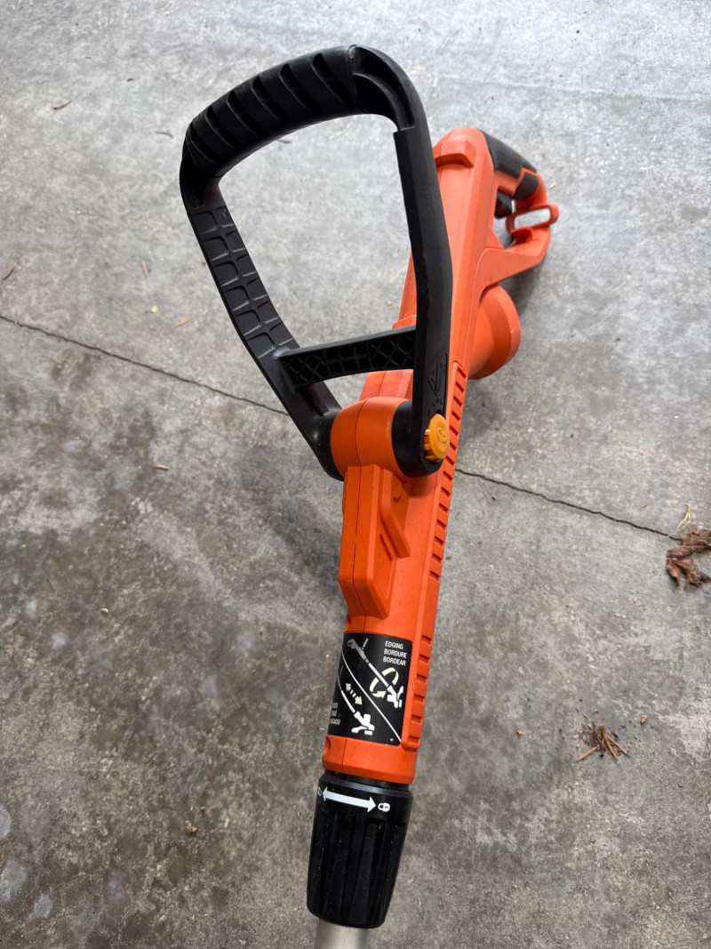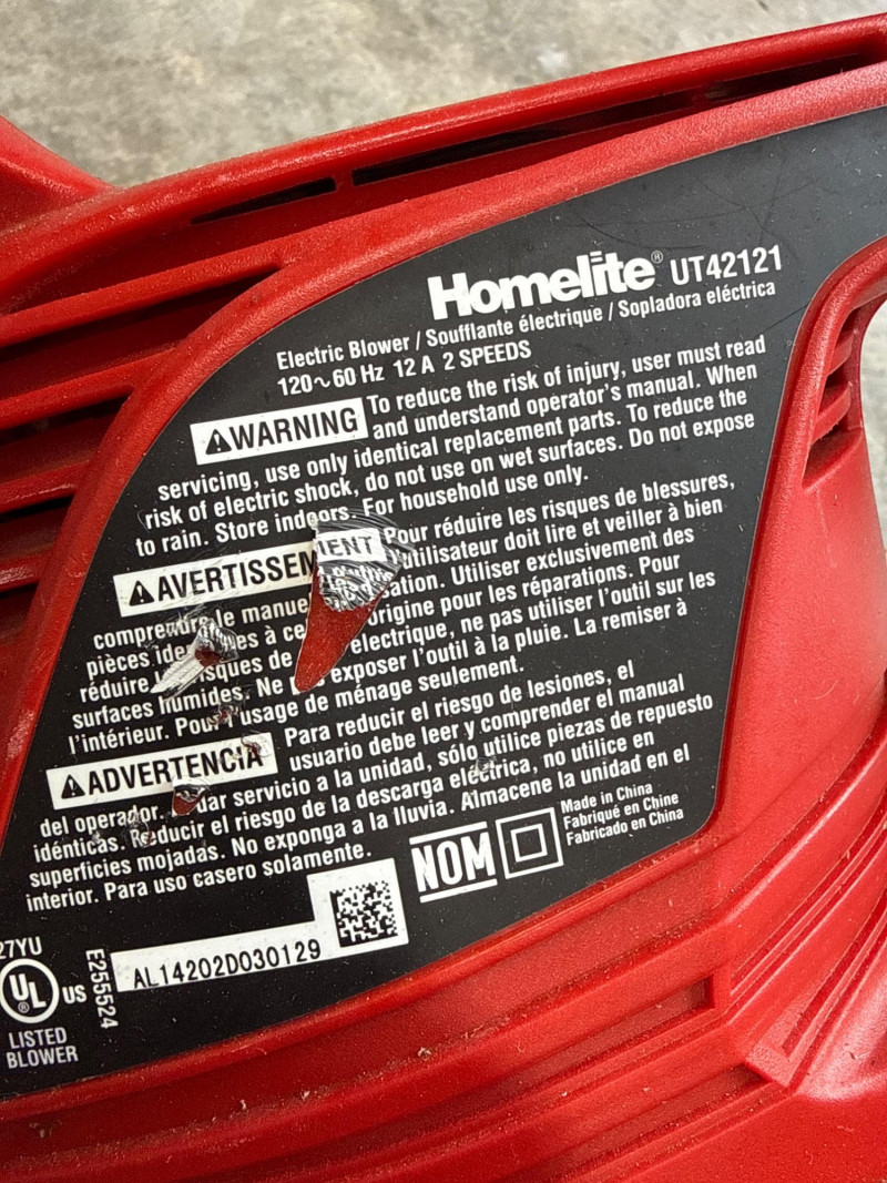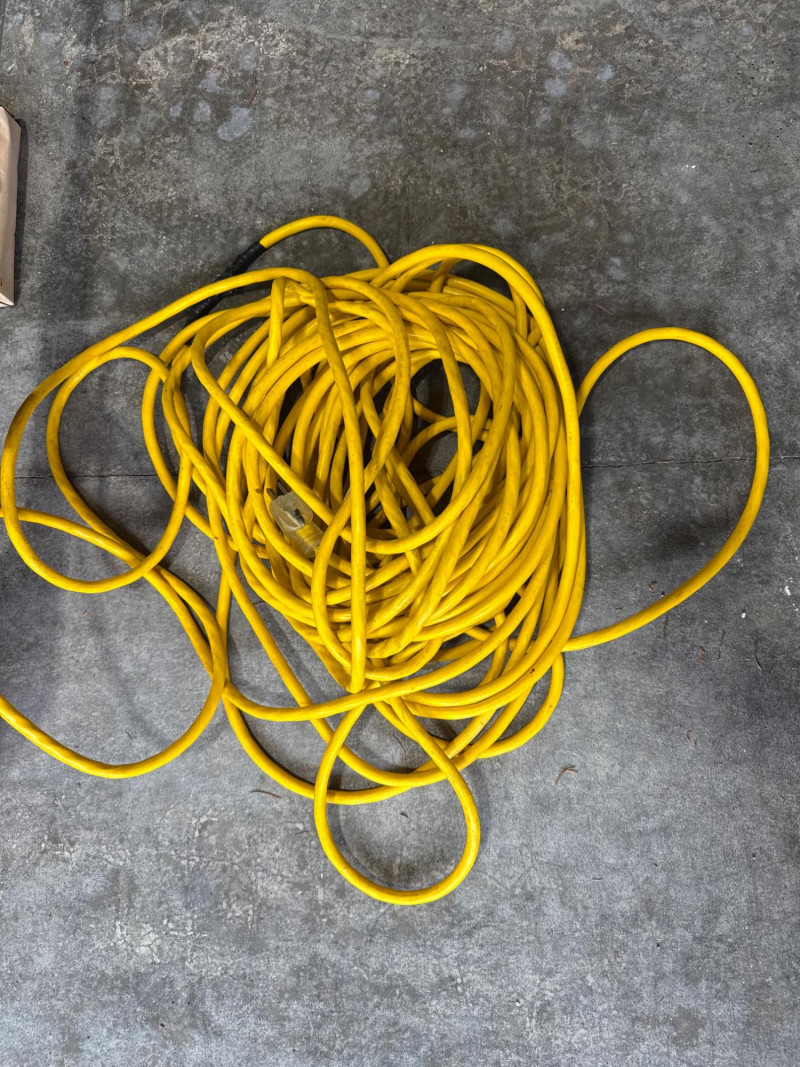 Black and Decker Electric String Trimmer, lightweight, corded string trimmer. Powered up. Includes several new and one used coil. One box of new coils. A yellow extension cord with a section that is taped. Approximately 50-100ft. Shorter orange cord. Approximately 5ft. Homelite Leaf Blower/Vacuum