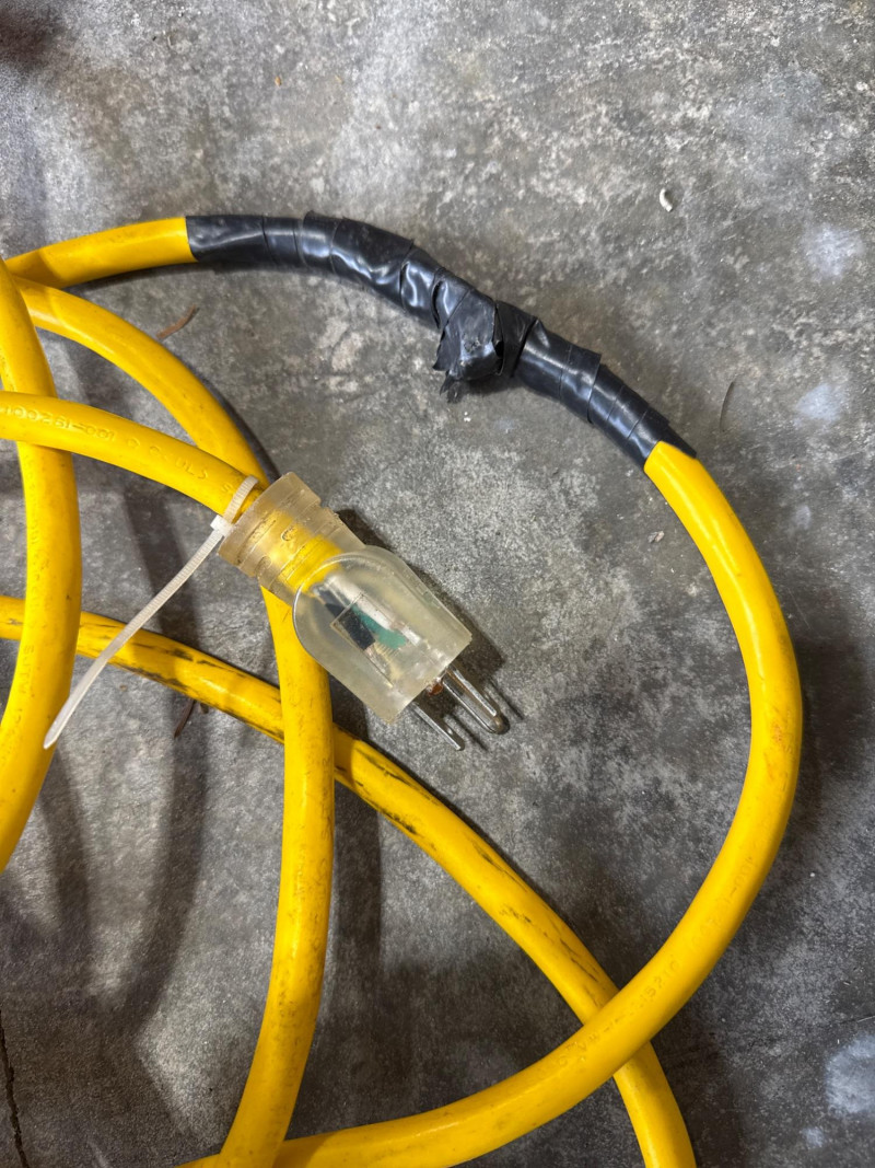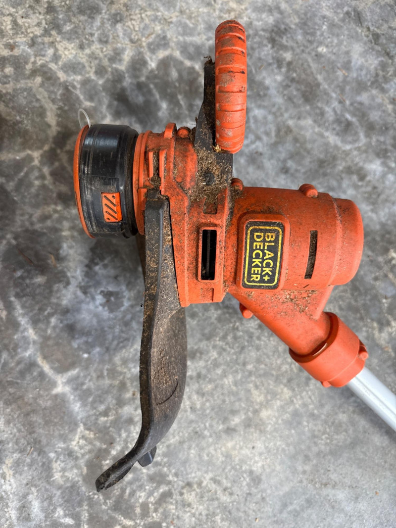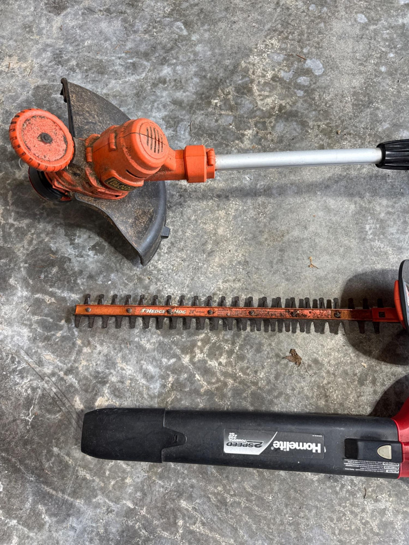Two black spool caps (likely replacement parts for the string trimmer). All tools powered up and cords tested.