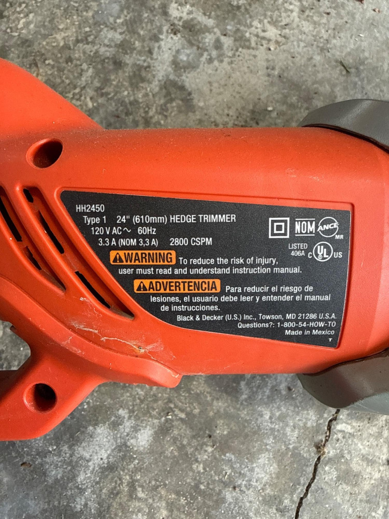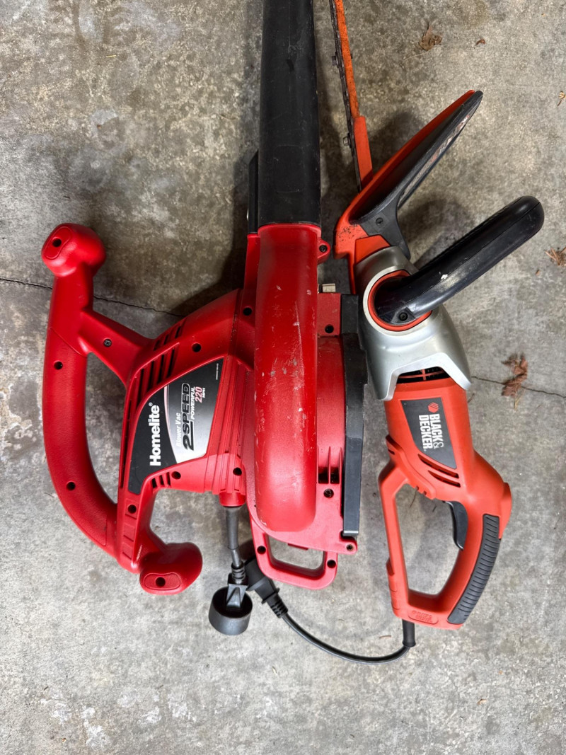 A combination leaf blower and vacuum unit with a red motor housing and gray handle. A black collection bag is attached. Black and Decker Hedge Hog trimmer. Designed for trimming shrubs and hedges. 24in blade length. Perfect for small projects or those needing lighter tools. Small Accessories