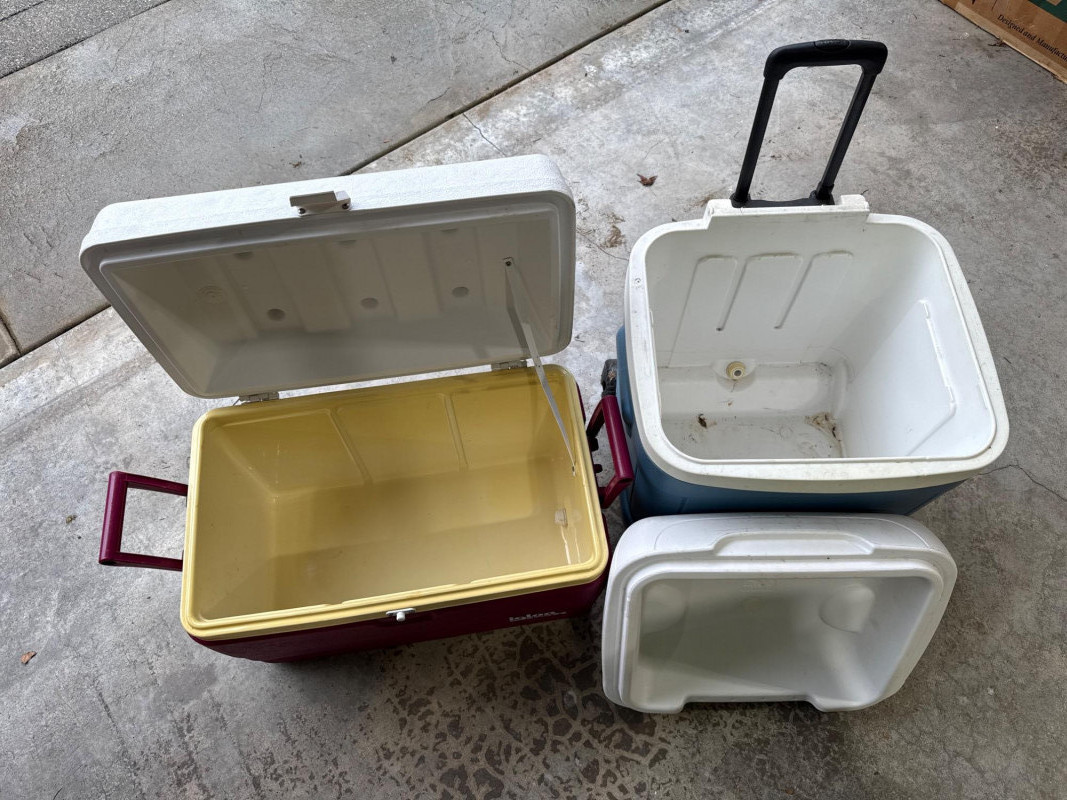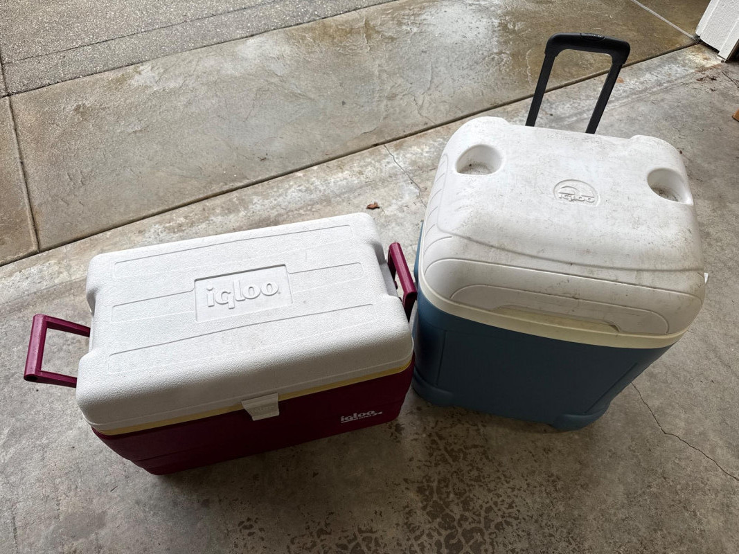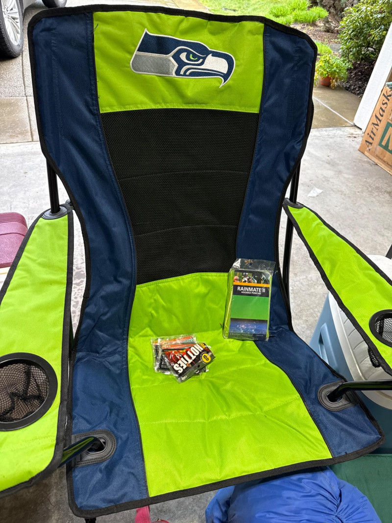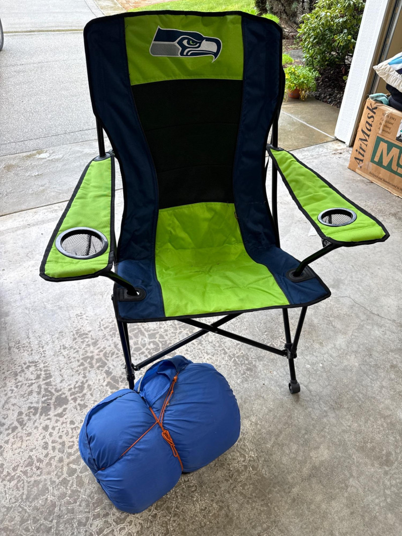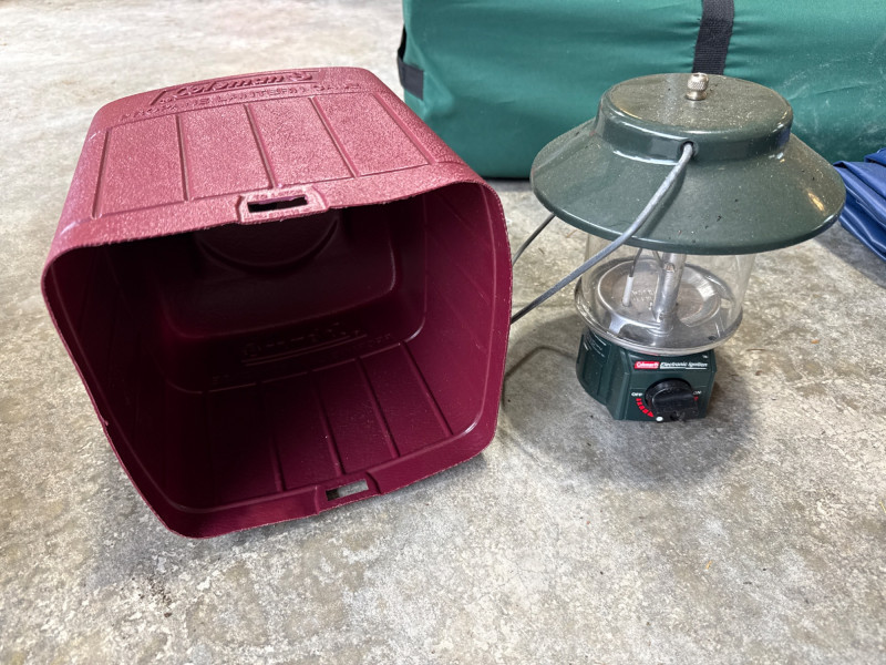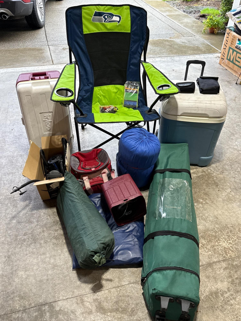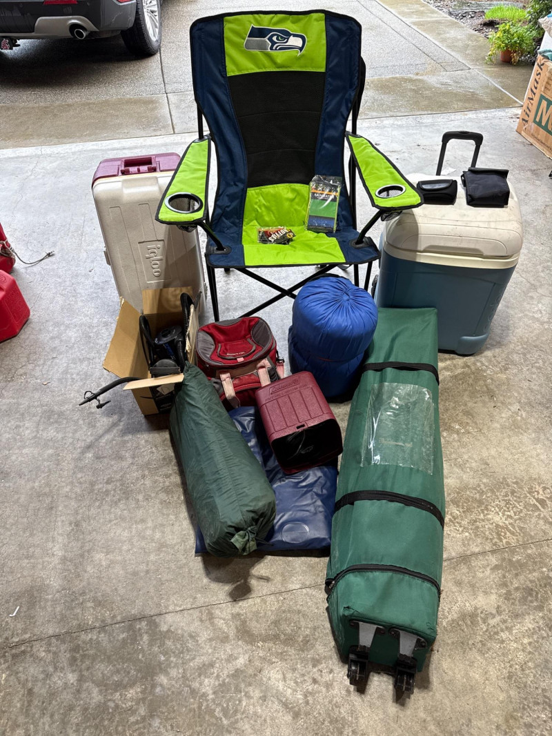 Large camp lot. Large Seahawks folding camp chair. One expandable shelter in bag. One sleeping bag and inflatable air mattress with air pump. 3 person Dome tent. Cooler day pack. Two igloo chest coolers and assorted accessories. Shelter in bag was not tested. Tent was not tested. Propane lamp with plastic cover Sold as is and appear in good condition.