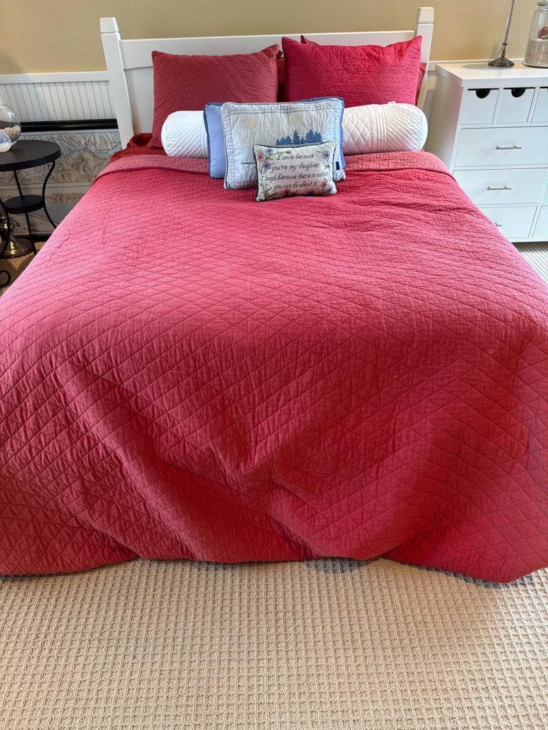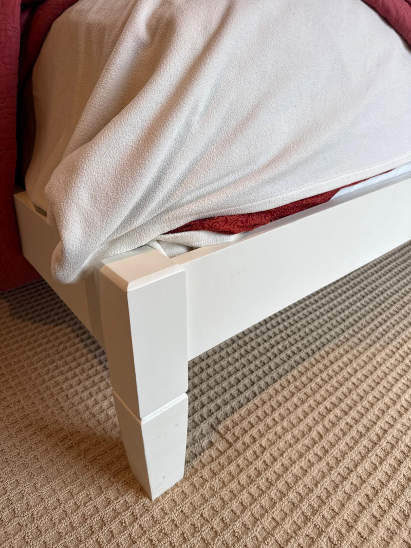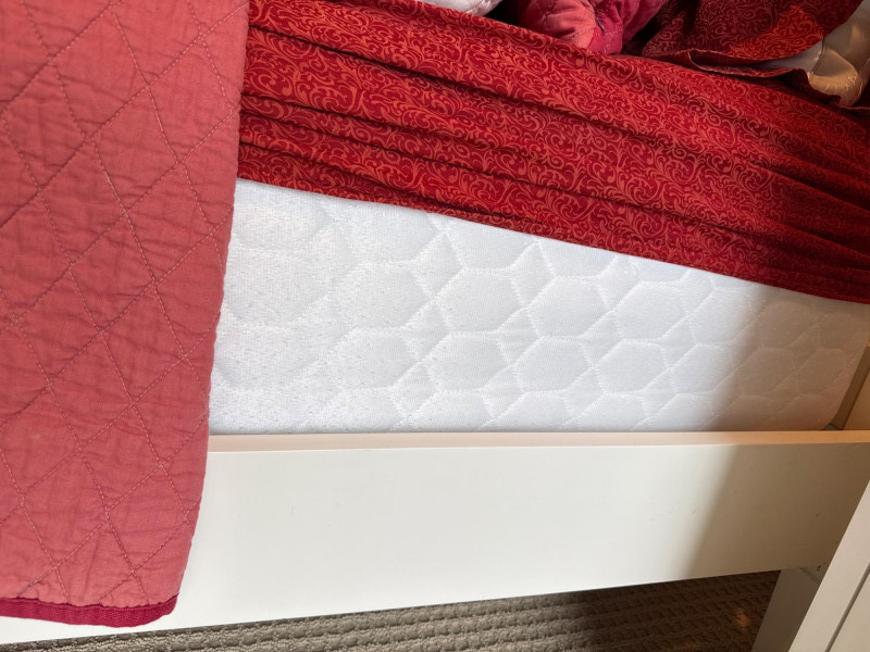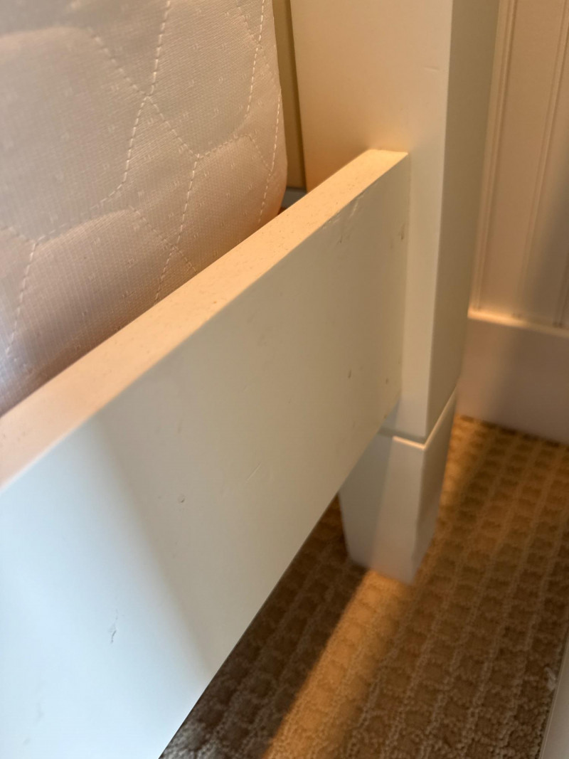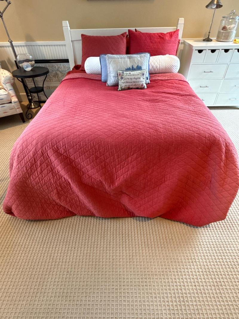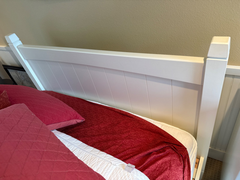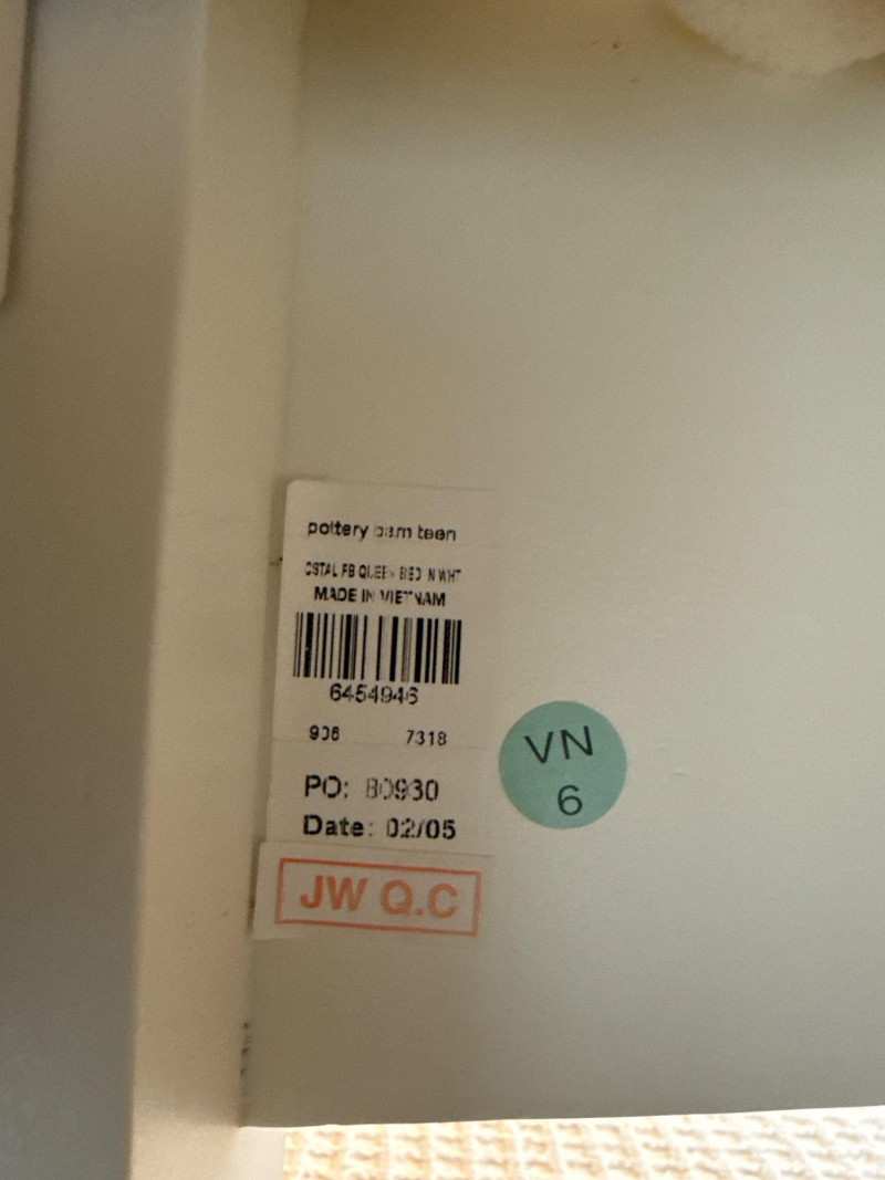 Pottery Barn teen bed in white. Very good condition. Bedding and mattresses included. Was in a guest room with minimal use. Decorative pillows included. Slat board support with boxspring. Label says queen bed. **MUST BRING TOOLS AND SUPPORT TO LOAD. EASY LOAD LOCATION WITH ONLY ONE STEP**