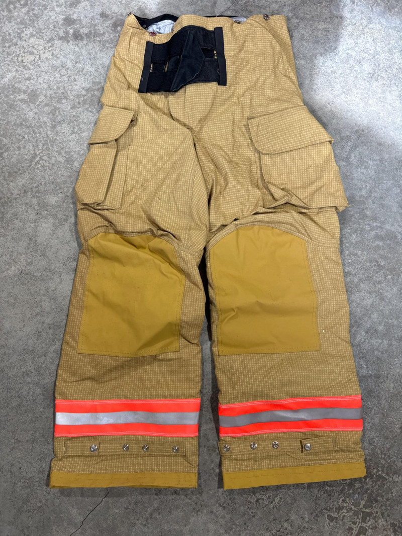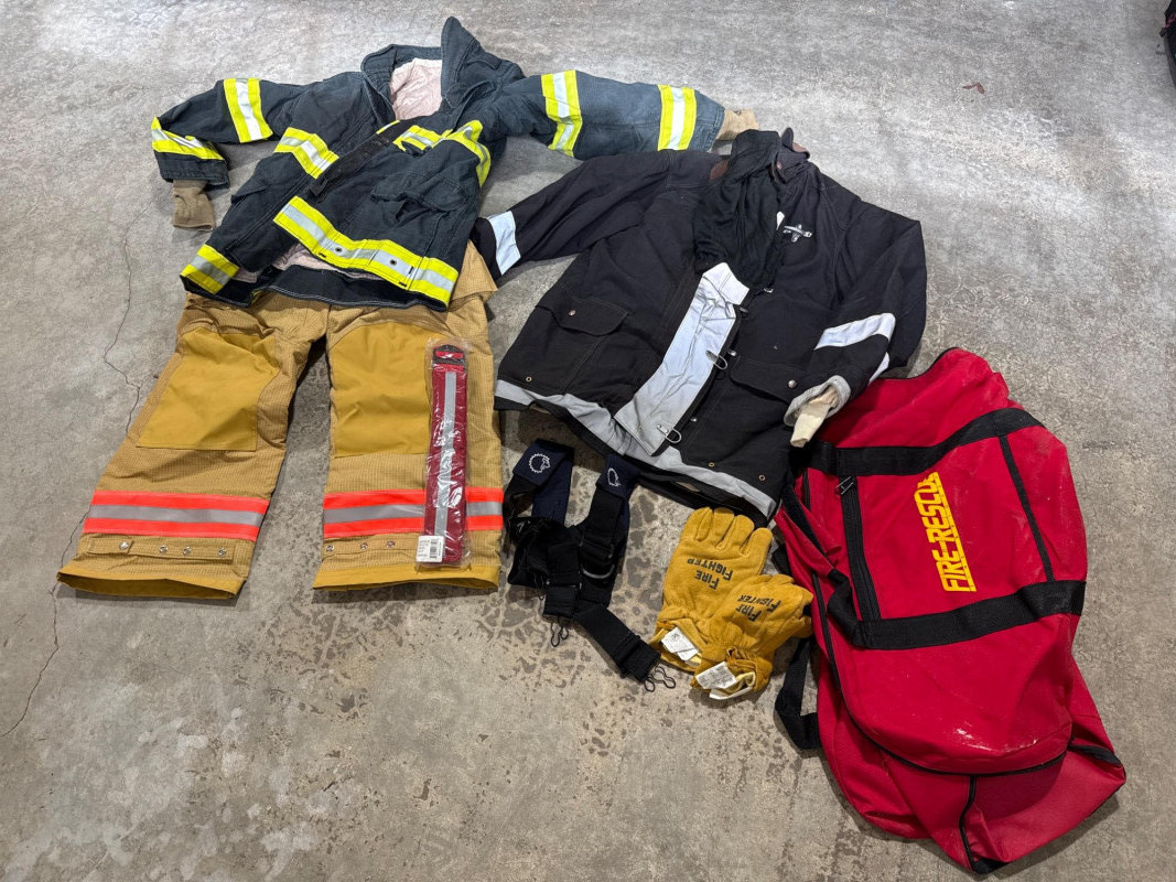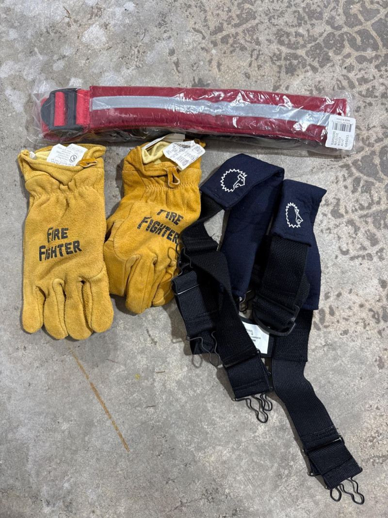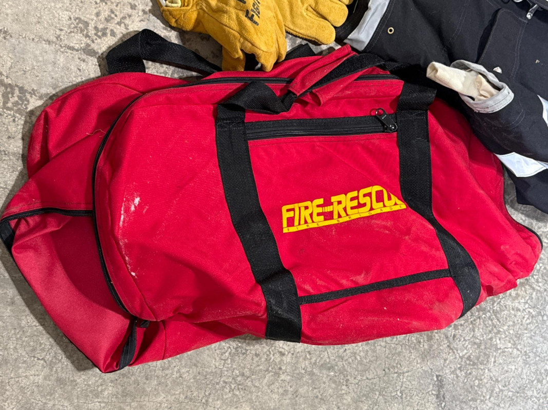 Lion Apparel-Janesville Firefighting gear all in one lot. See pics for labels and sizes. Some items new are hardly new. The setup includes tan firefighter bunker pants with bright orange reflective stripes. Pair of sturdy yellow suede gloves, and a red harness or belt. Black head cover. A large red duffel bag labeled “RESCUE”. Two structural firefighting turnout coats, likely designed for interior fire attack rather than wildland use.