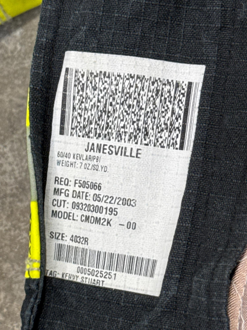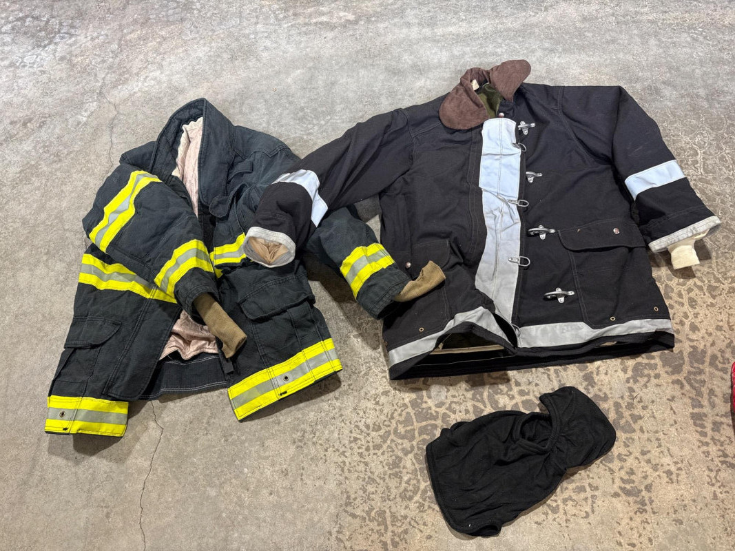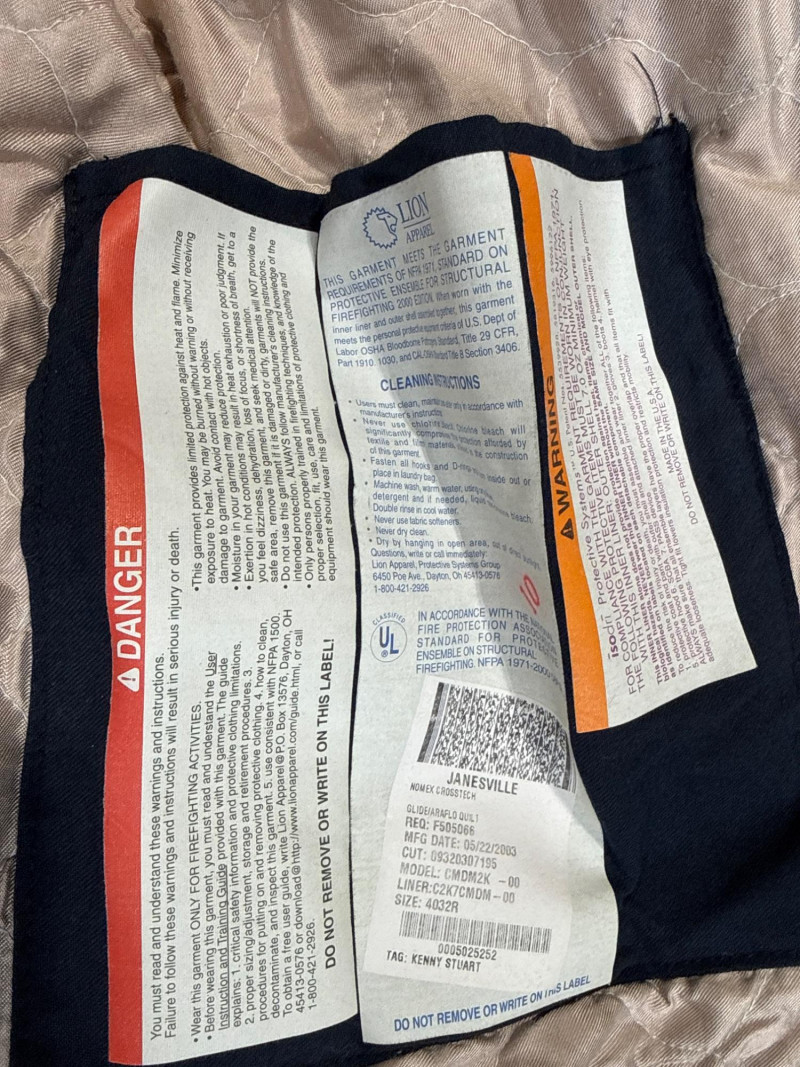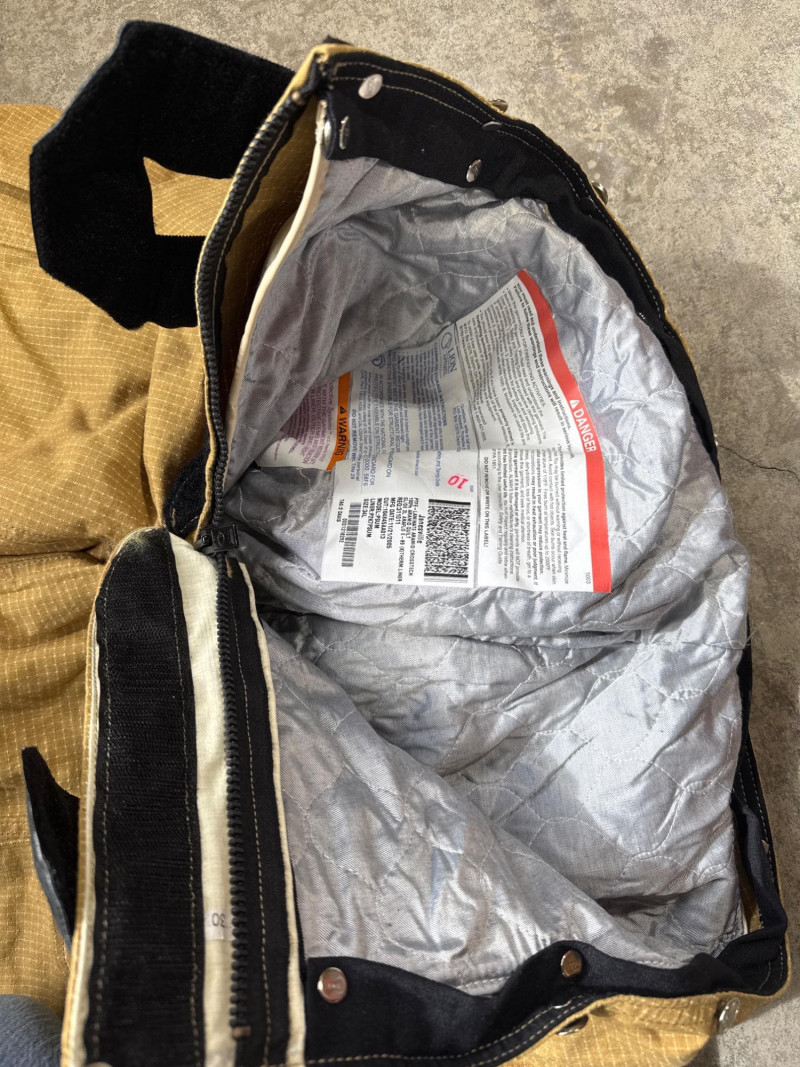 Lion Apparel-Janesville Firefighting gear all in one lot. See pics for labels and sizes. Some items new are hardly new. The setup includes tan firefighter bunker pants with bright orange reflective stripes. Pair of sturdy yellow suede gloves, and a red harness or belt. Black head cover. A large red duffel bag labeled “RESCUE”. Two structural firefighting turnout coats, likely designed for interior fire attack rather than wildland use.