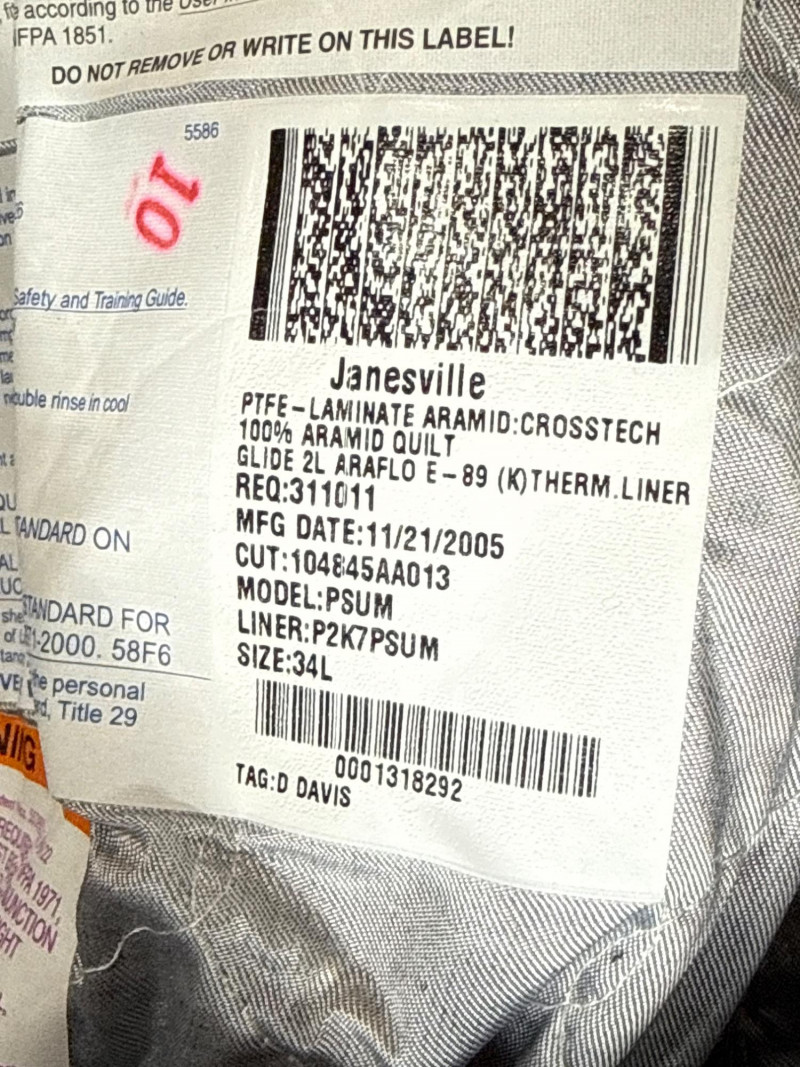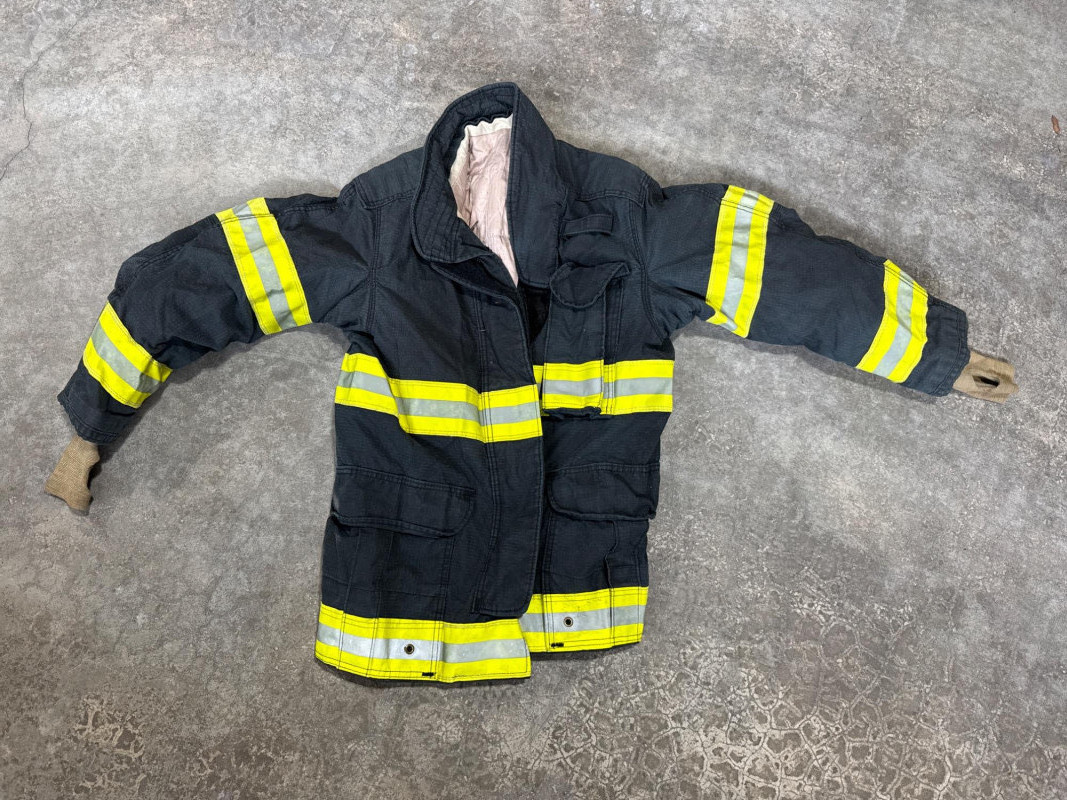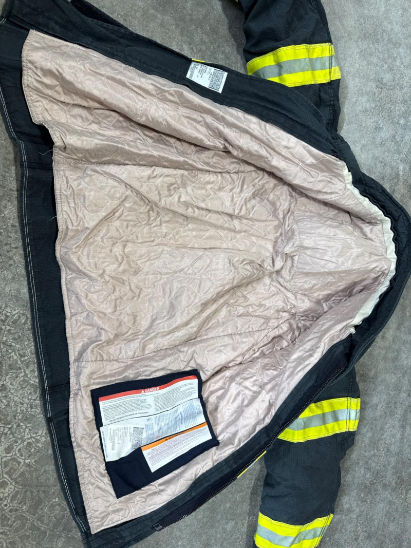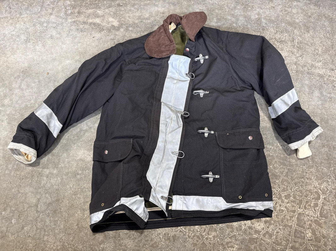 The collar material looks like a heat‑resistant leather or aramid blend. Essential firefighter protective equipment is no longer up to code. Sold for collectors, display, training, film prop or personal use.