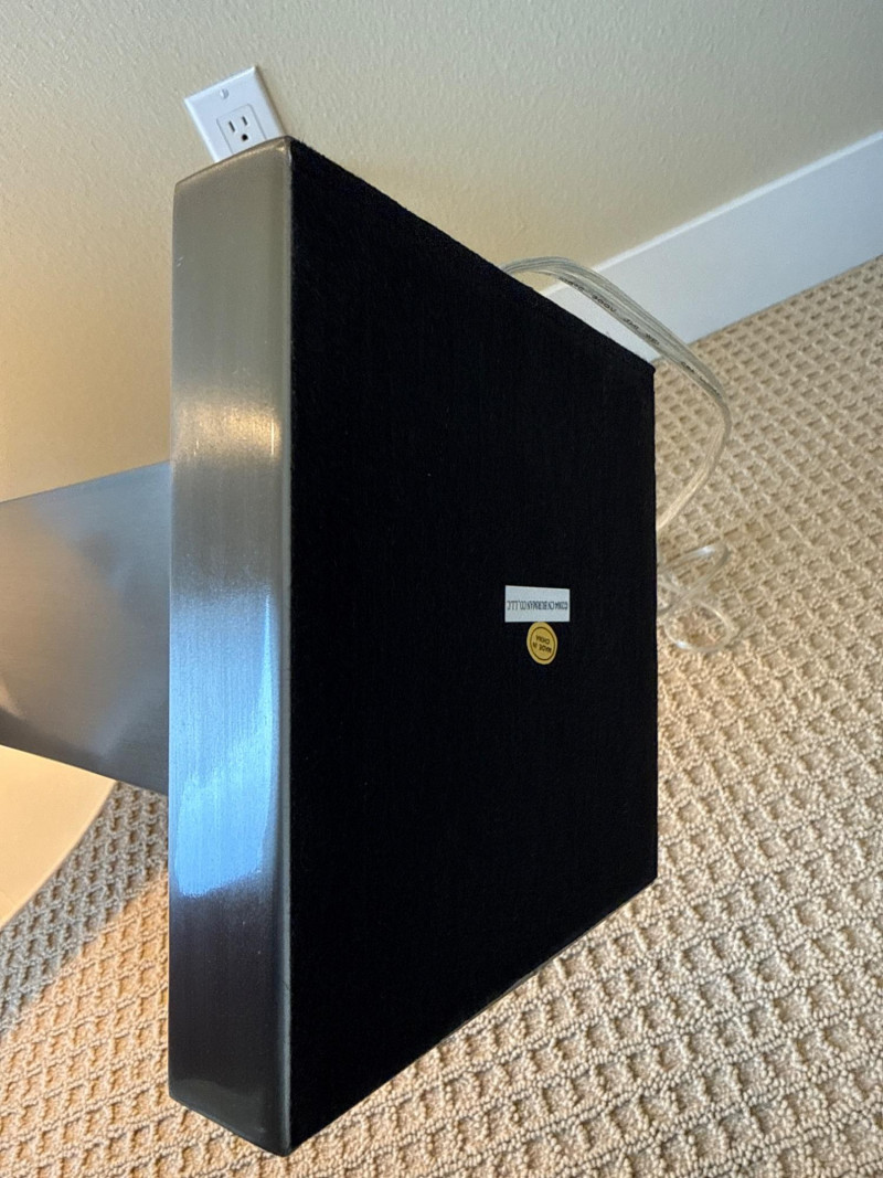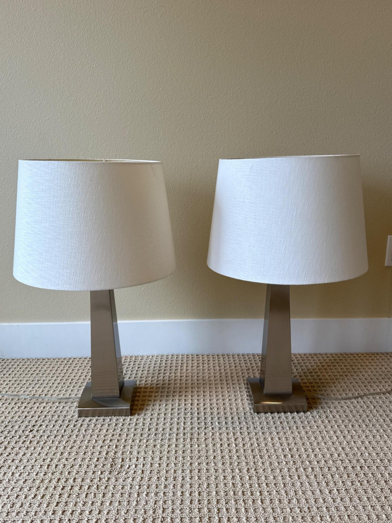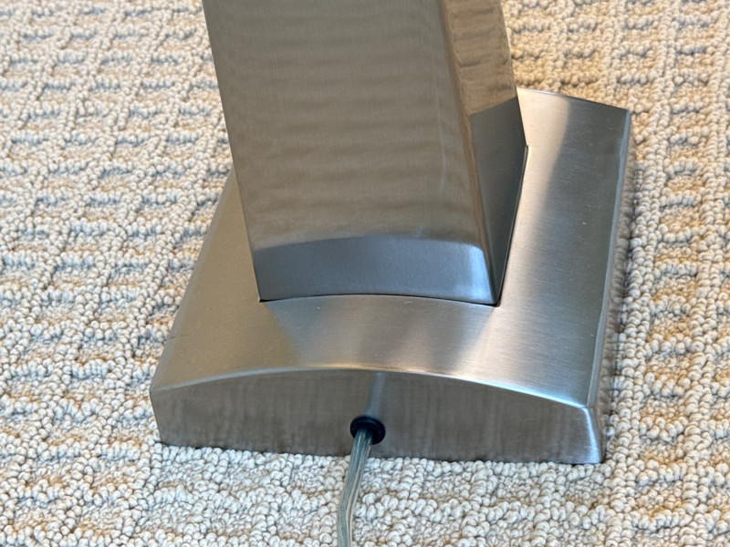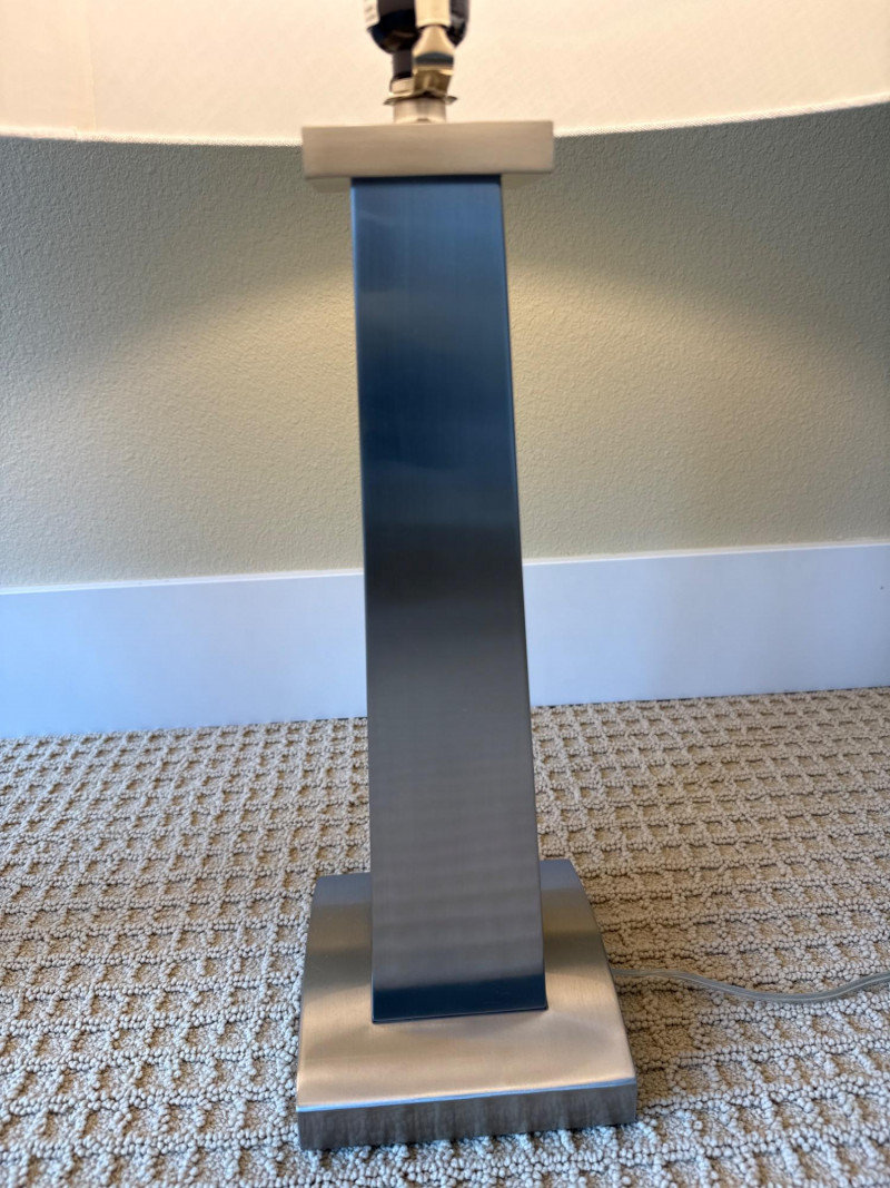 CN. Burman and Co, table lamps. Circa 2000. Base: A rectangular, brushed‑metal base with clean, straight edges. It has a contemporary, minimalist look.