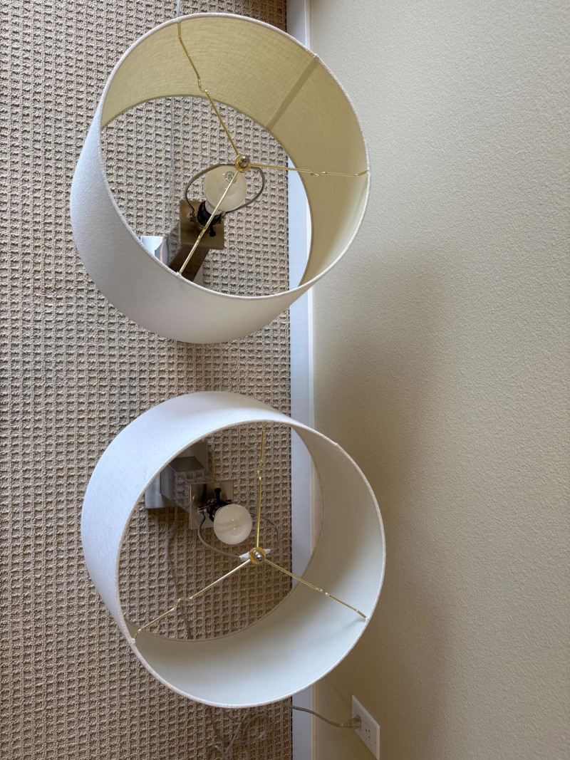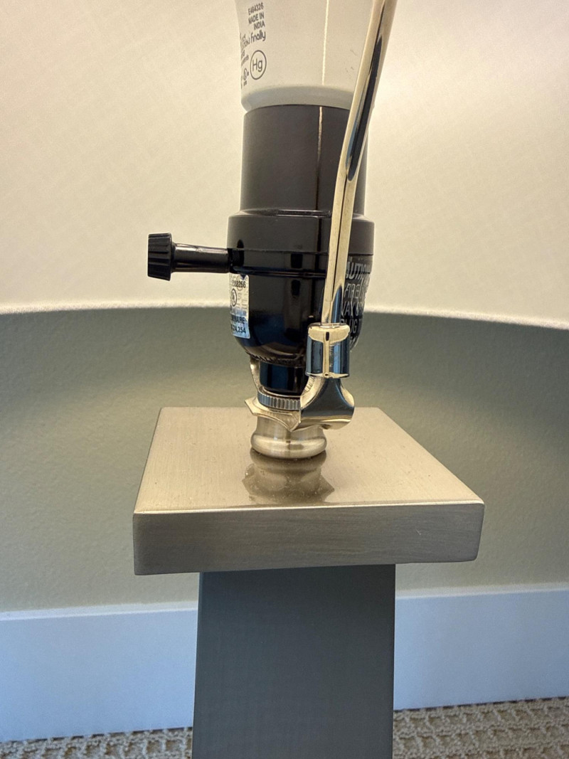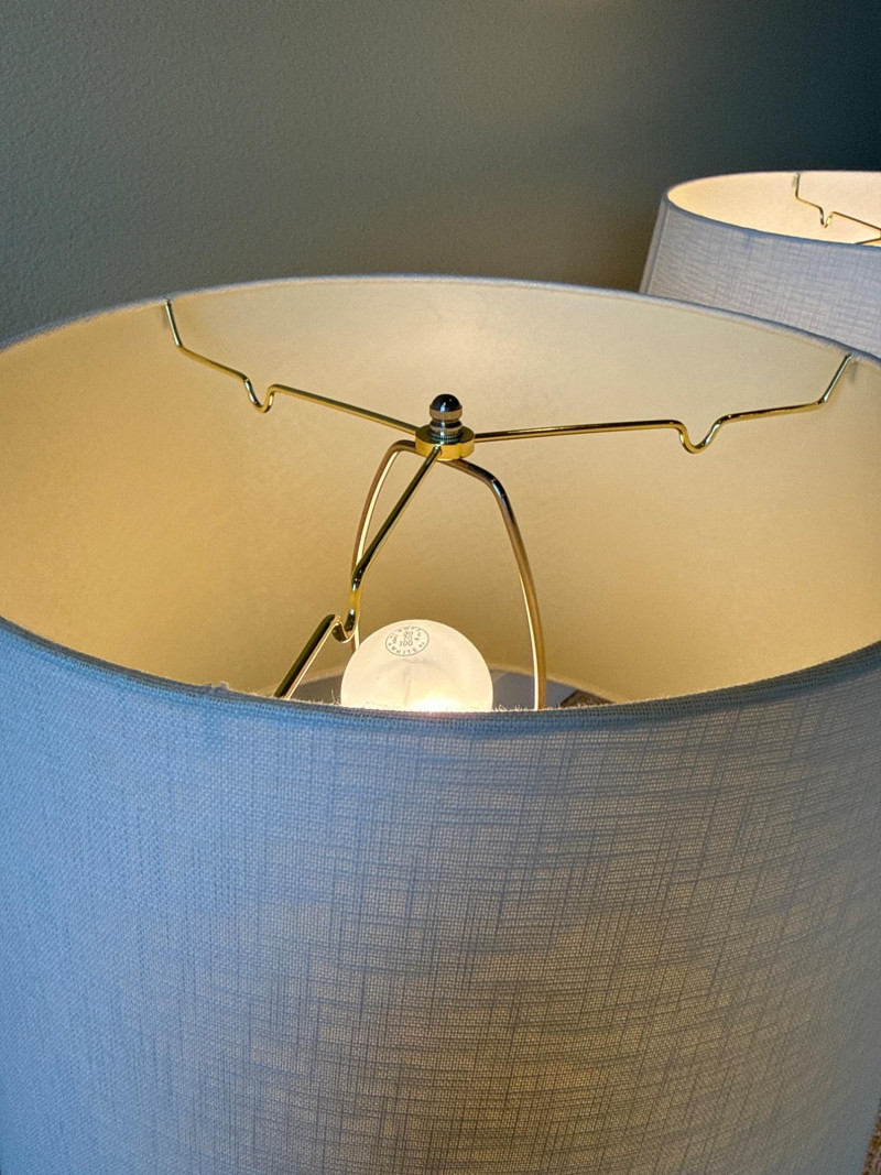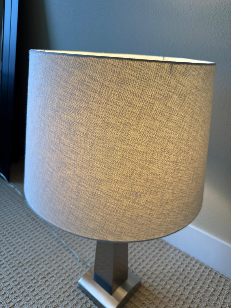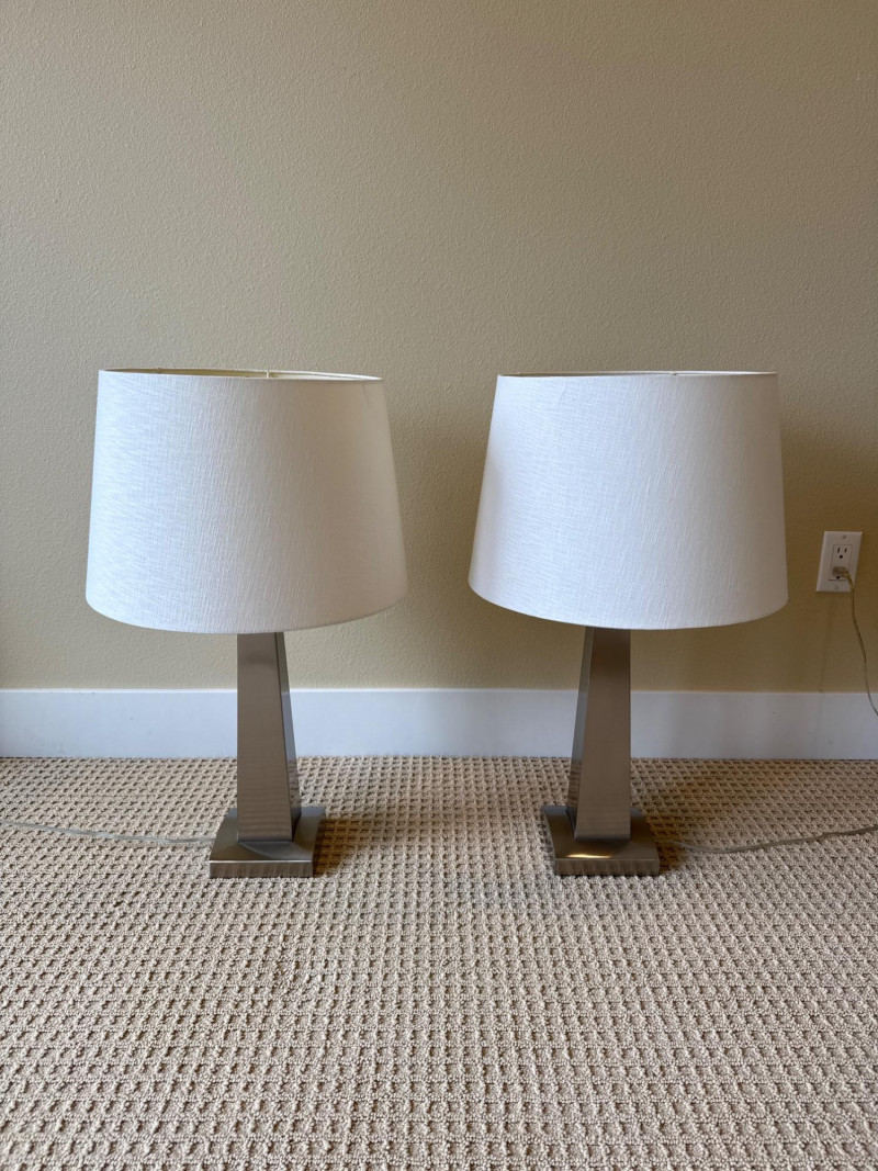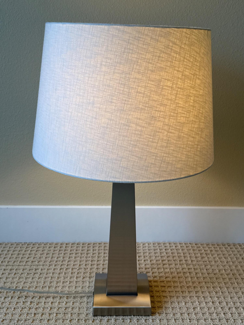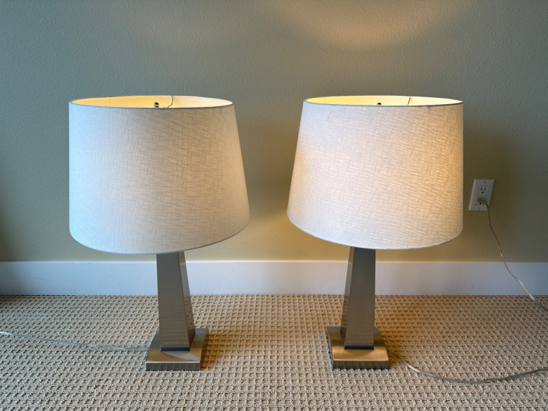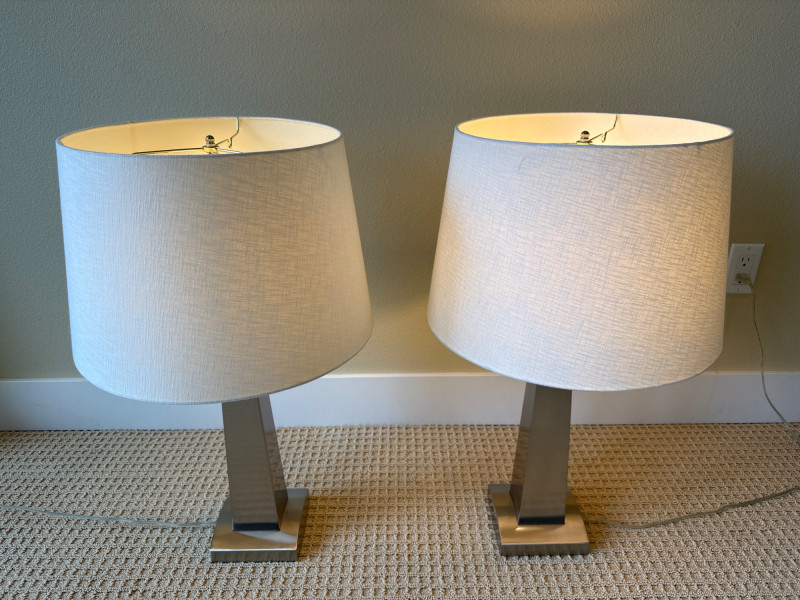 Shade: A wide, cylindrical lampshade made of light-colored fabric—likely beige or off‑white. The fabric texture is visible, giving it a soft, warm appearance. Both powered up and had more than one setting option. Dimensions below include shade. Base 6 inch wide 6 inch long 28 inch tall.