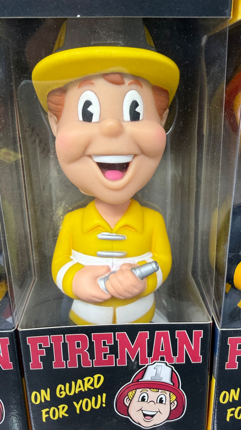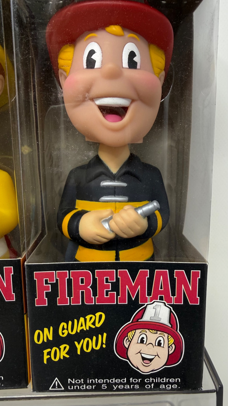A cheerful, cartoon‑style firefighter in a bright yellow uniform and helmet. Packaging features bold red and yellow graphics with retro comic‑inspired artwork.