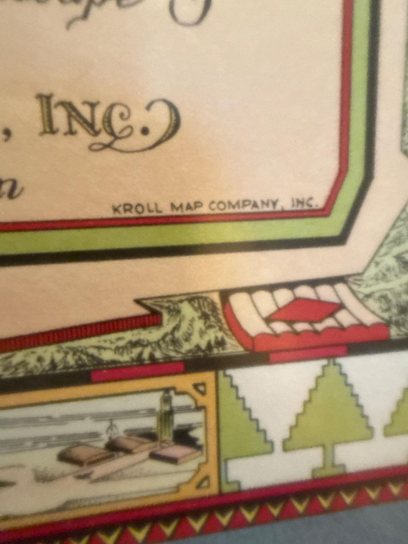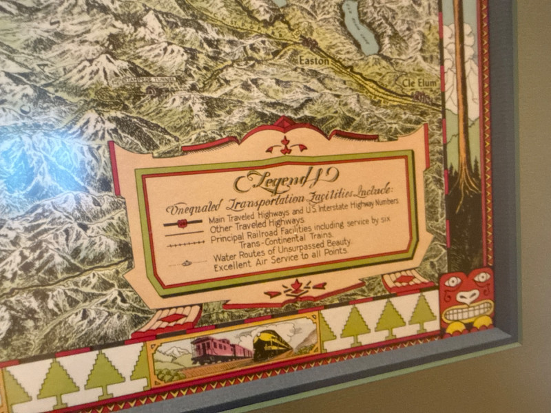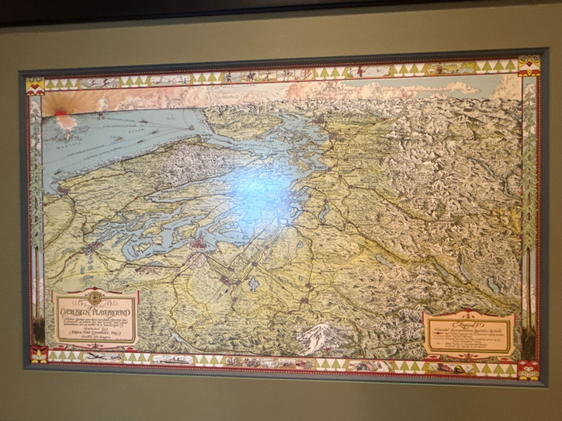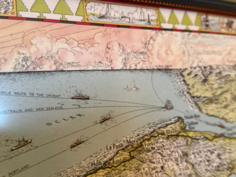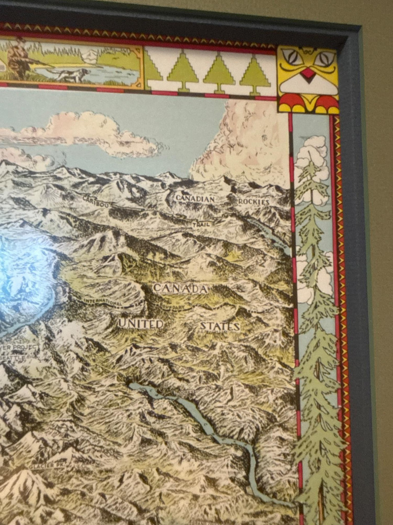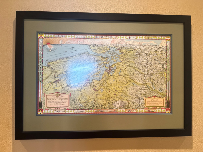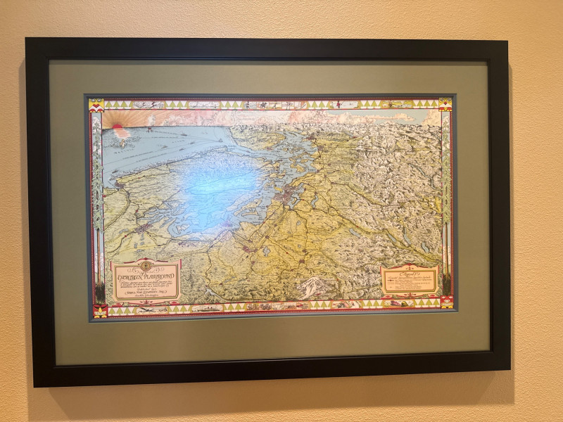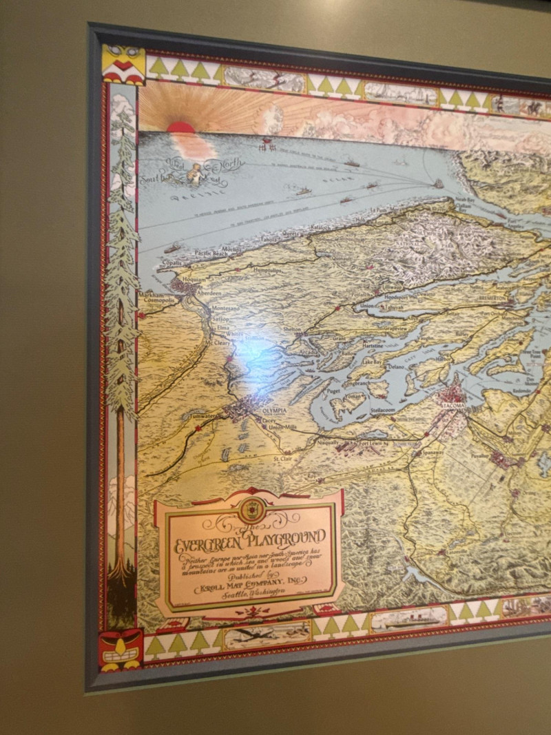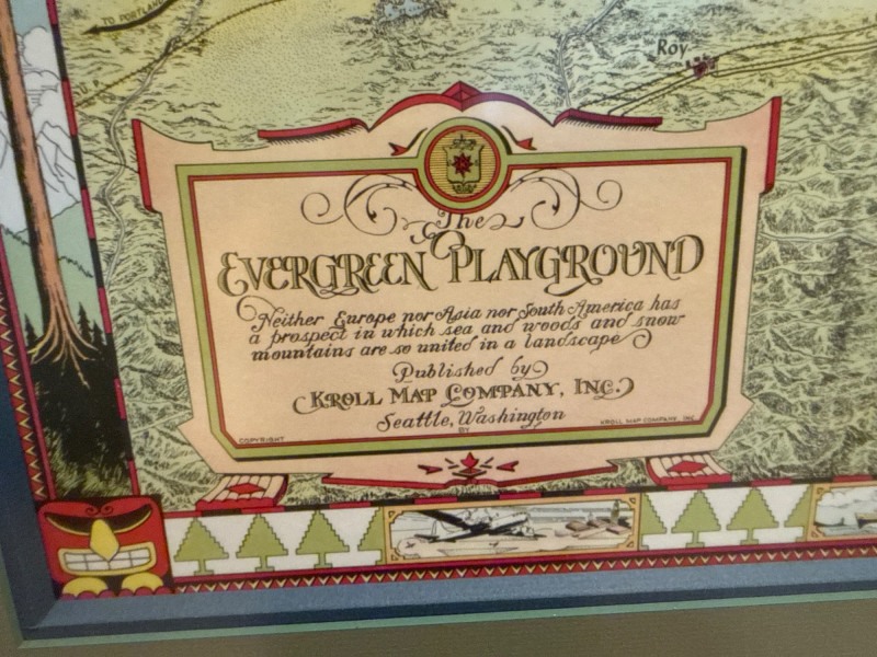 A framed antique style map, showcasing the mountains and waterways of most of Washington state. Kroll Map Co. Titled: "Evergreen Playground" The map is illustrated in a classical cartographic style, with finely detailed rivers, settlements, and territorial borders. Decorative elements frame the map, including ornate red and gold embellishments that give it an elegant, vintage appearance. The overall look evokes early European mapmaking and historical geography. **There is so much detail and character in this map that reflects the PNW culture and geography.