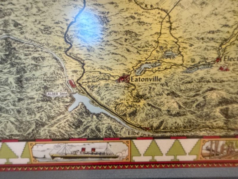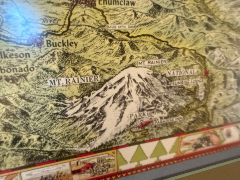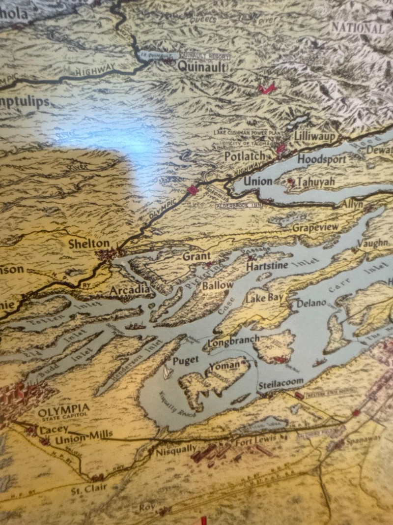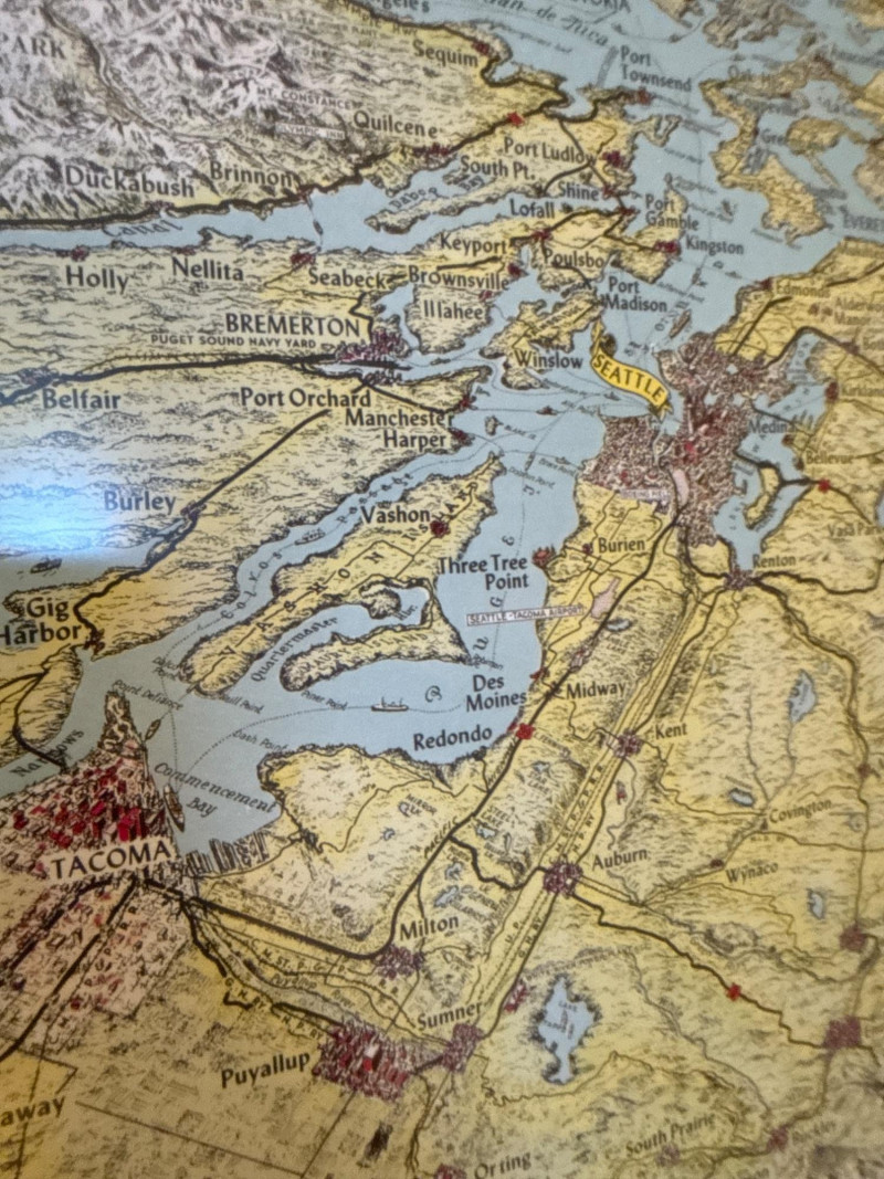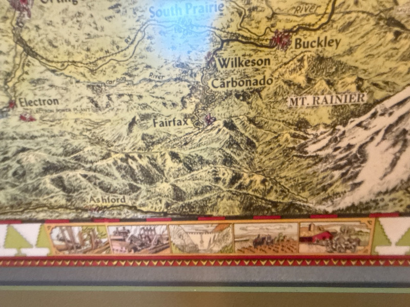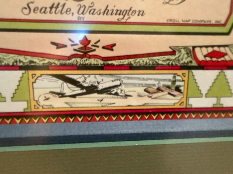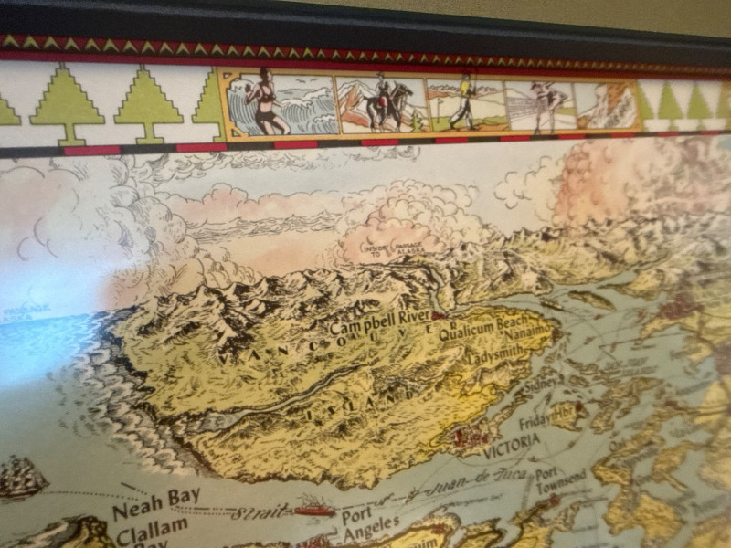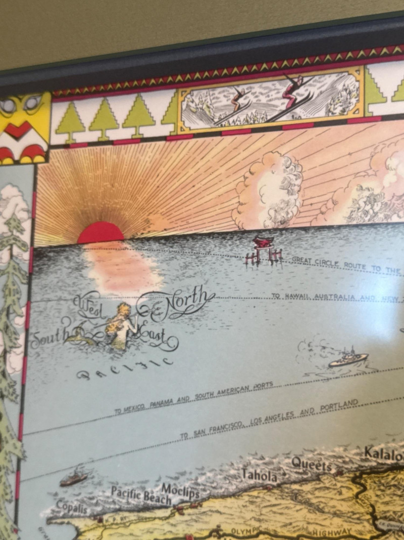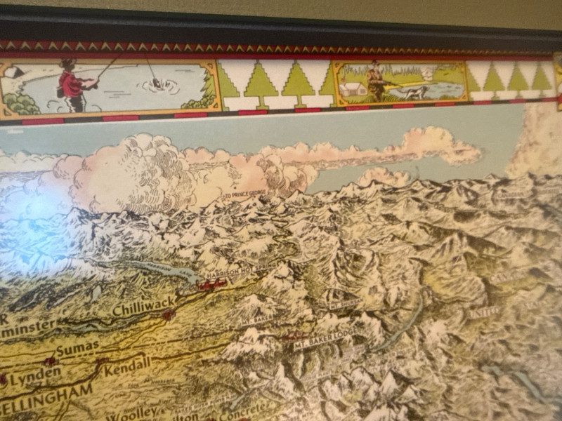 A framed antique style map, showcasing the mountains and waterways of most of Washington state. Kroll Map Co. Titled: "Evergreen Playground" The map is illustrated in a classical cartographic style, with finely detailed rivers, settlements, and territorial borders. Decorative elements frame the map, including ornate red and gold embellishments that give it an elegant, vintage appearance. The overall look evokes early European mapmaking and historical geography. **There is so much detail and character in this map that reflects the PNW culture and geography.