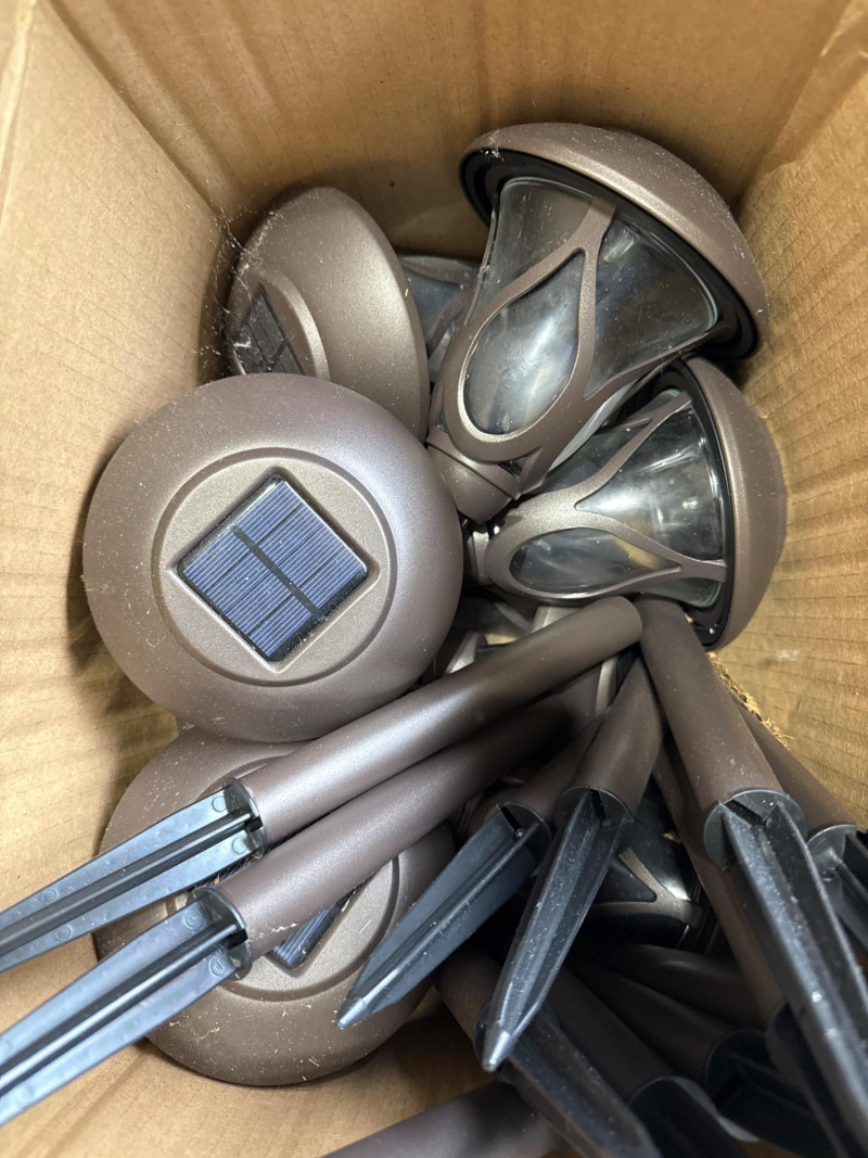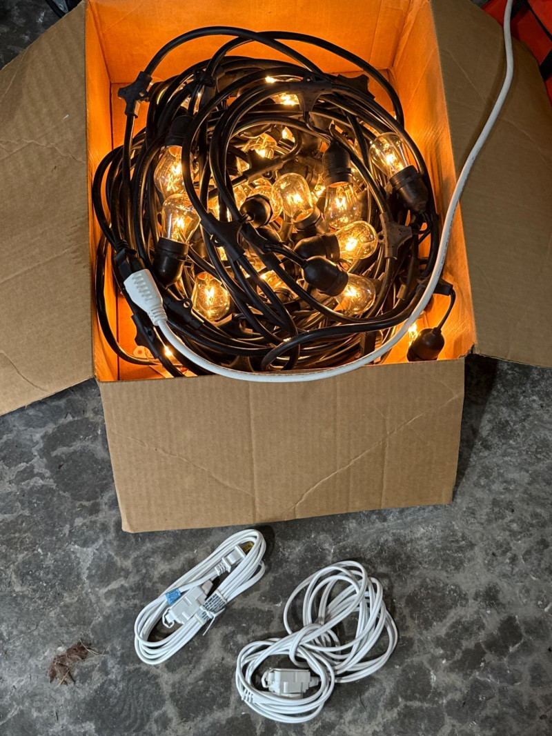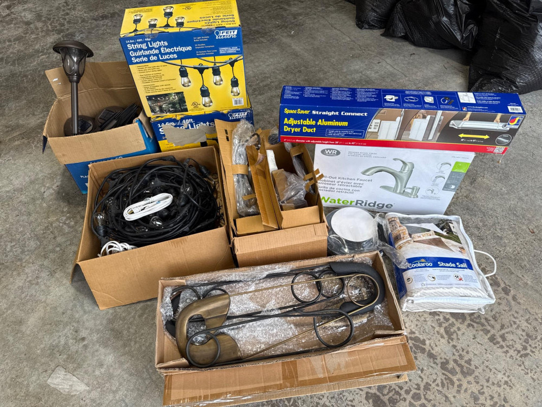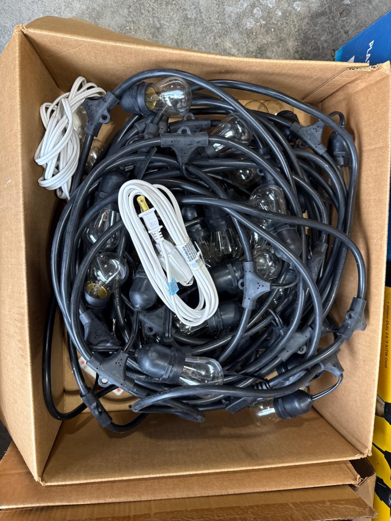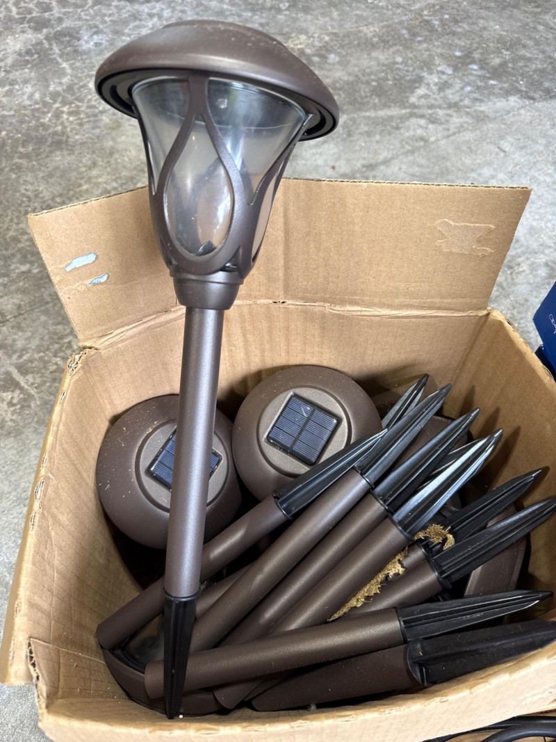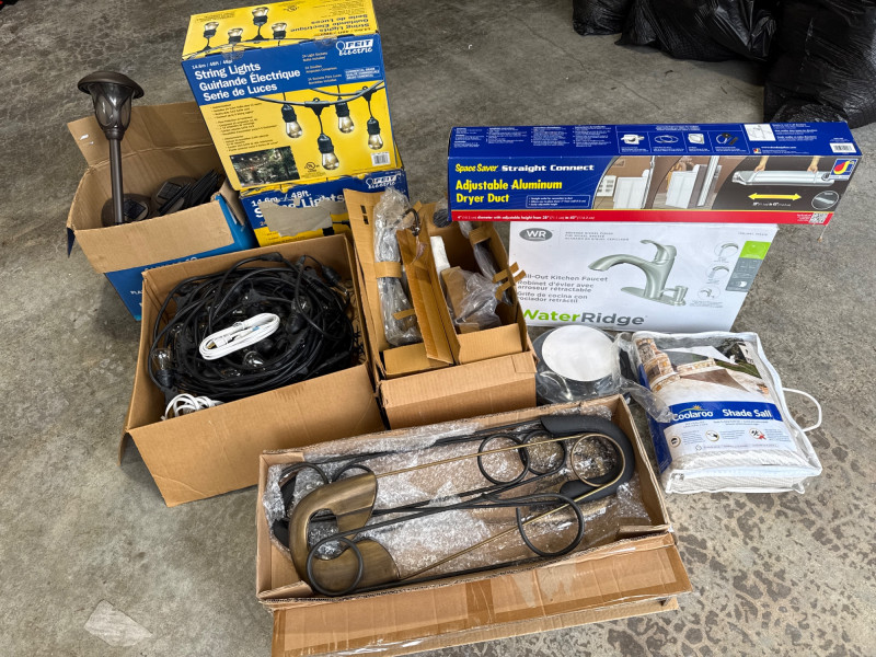 Brass/Bronze Light Fixtures: Multiple string light sets with glass bulbs. Heavy rubber casing. One new box. The open box was tested and worked. White Electrical rope lights in a sealed package. Aluminum decorative clothes pins. Multiple colors and sizes. Large size. Box of solar garden lights. Clean and do not look used. Coolaroo shade sail-NIB NOB-Dryer vent hose. Miscellaneous items. Please view pics for details. There is a lot here.