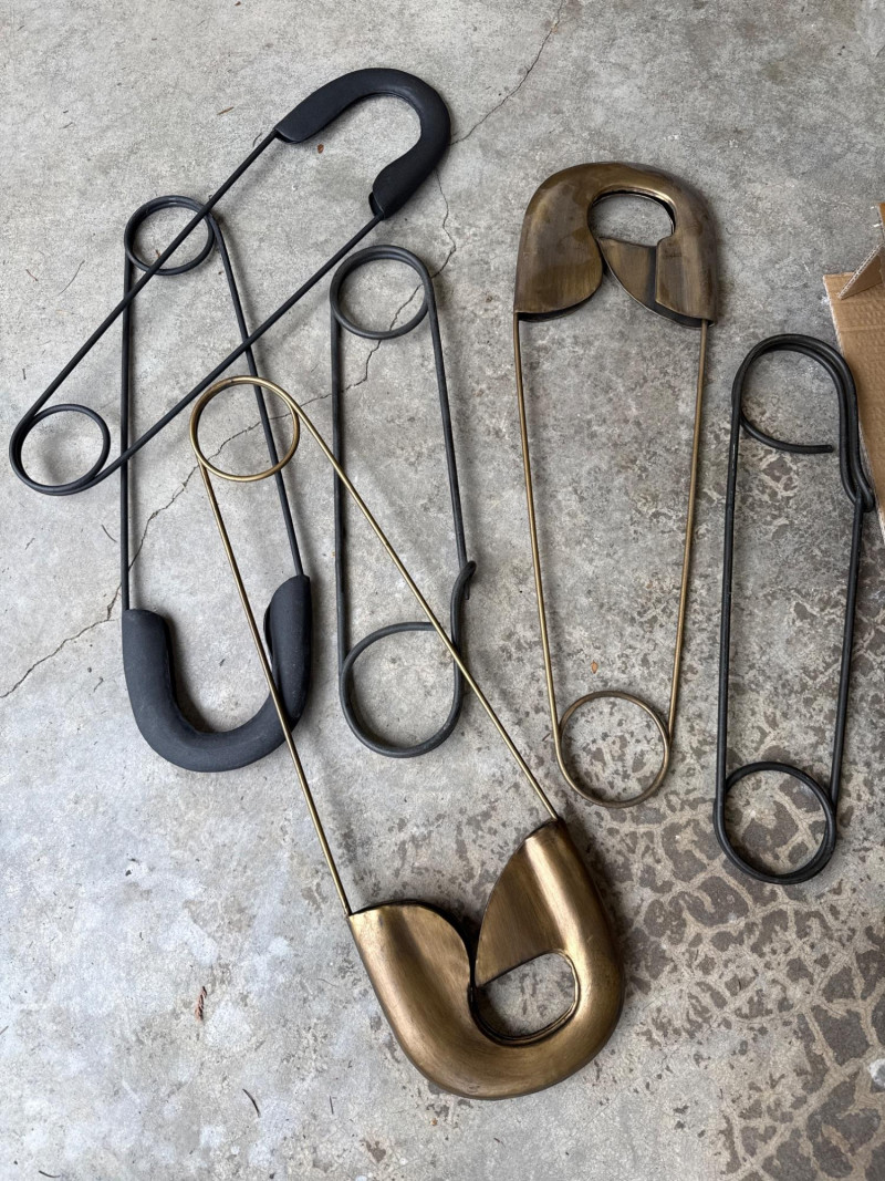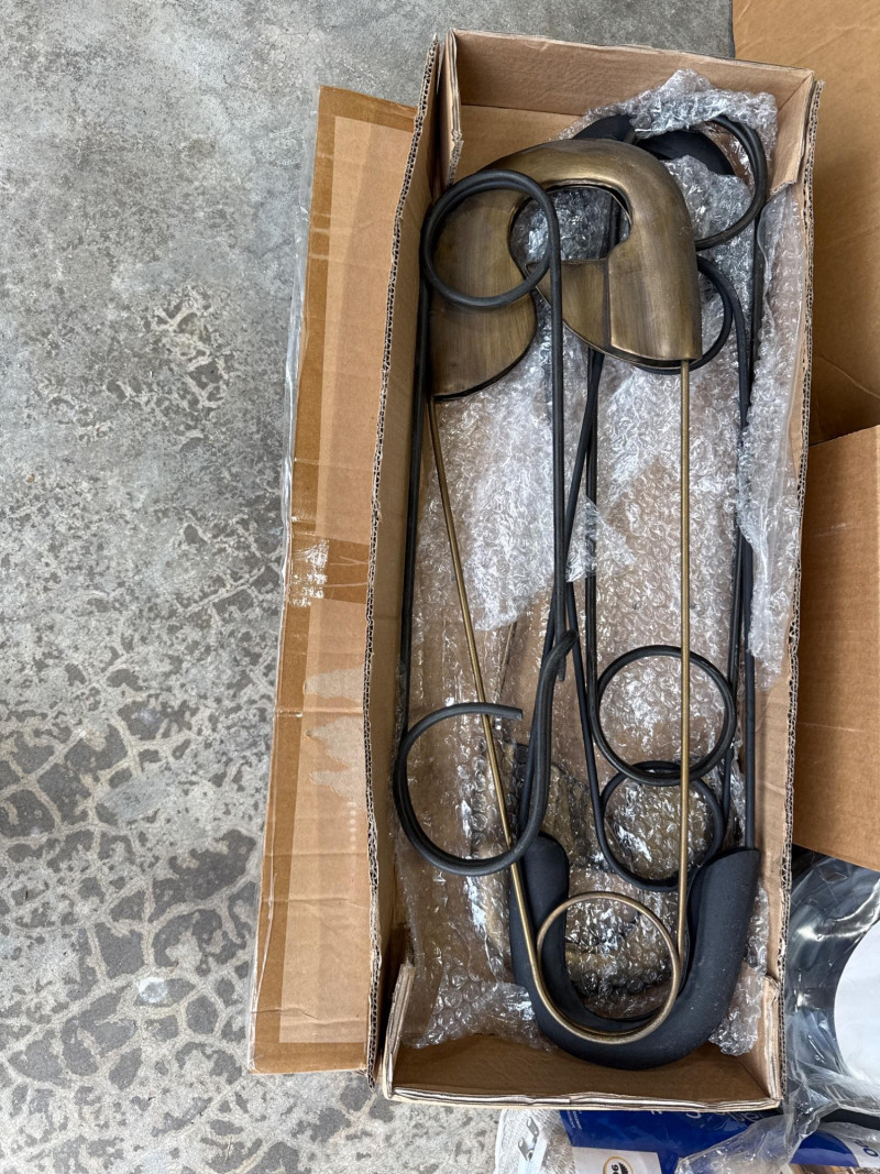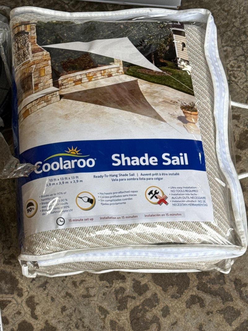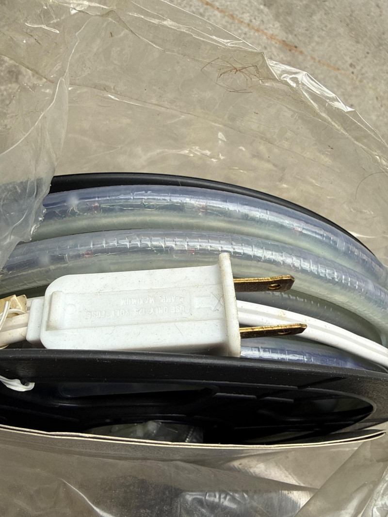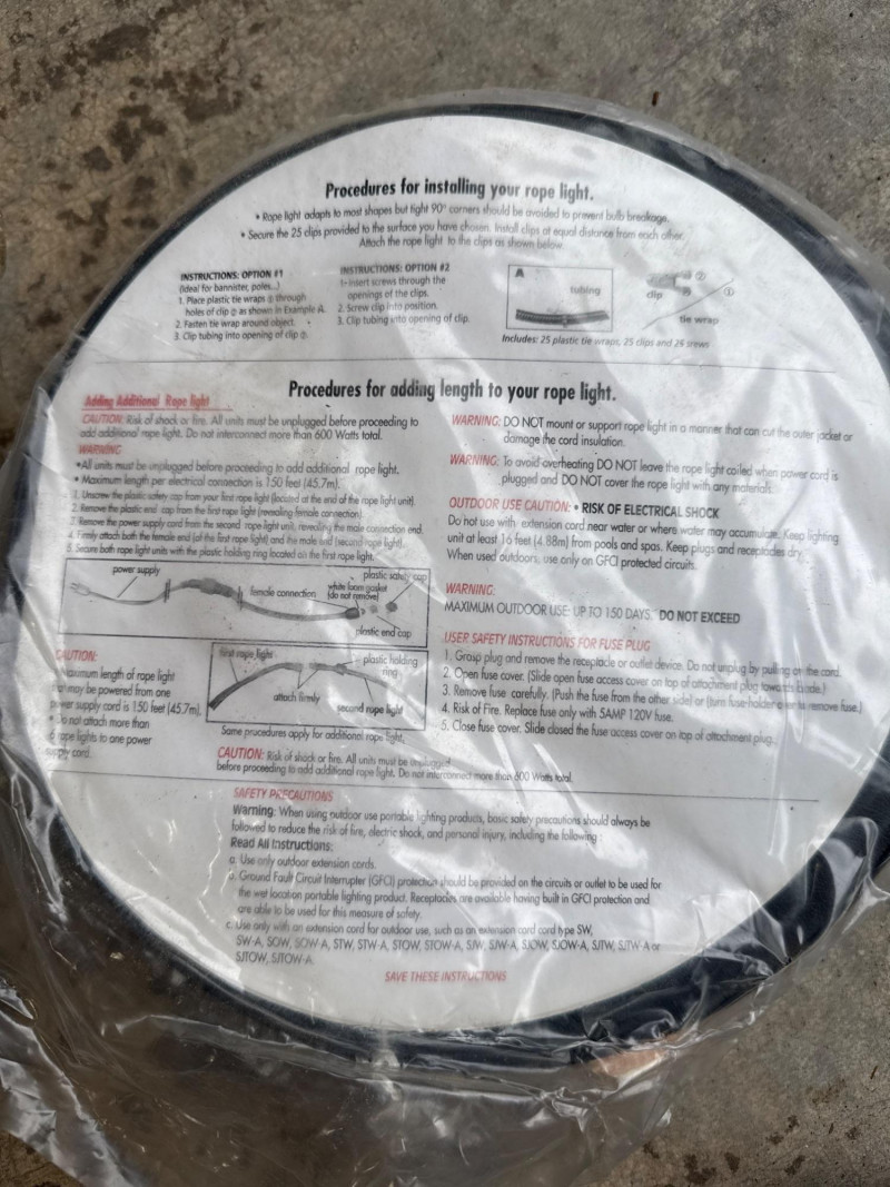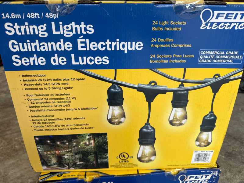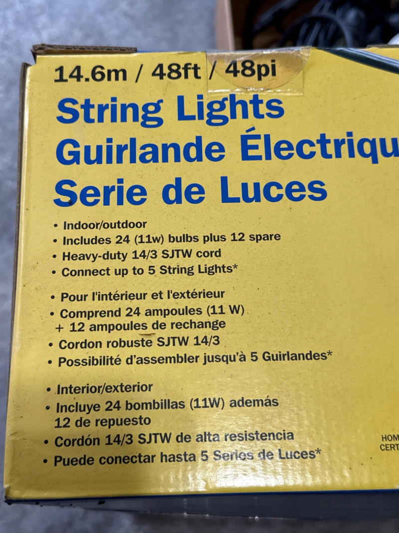Brass/Bronze Light Fixtures: Multiple string light sets with glass bulbs. Heavy rubber casing. One new box. The open box was tested and worked. White Electrical rope lights in a sealed package. Aluminum decorative clothes pins. Multiple colors and sizes. Large size. Box of solar garden lights. Clean and do not look used. Coolaroo shade sail-NIB NOB-Dryer vent hose. Miscellaneous items. Please view pics for details. There is a lot here.