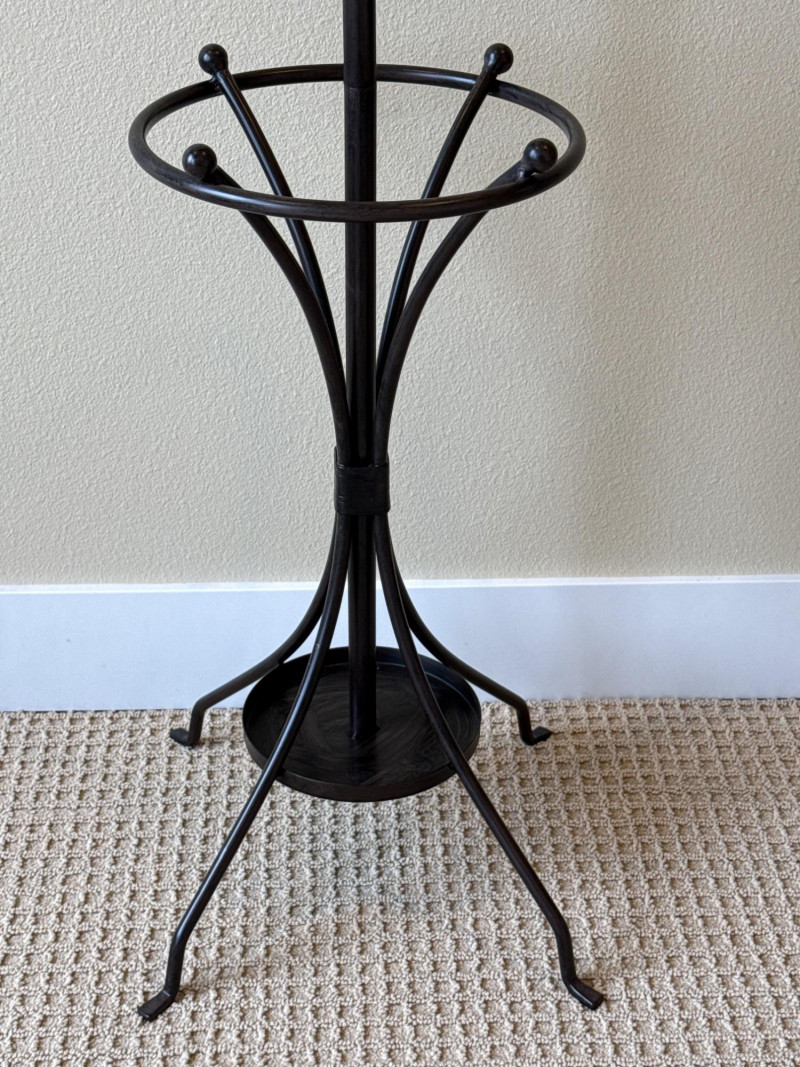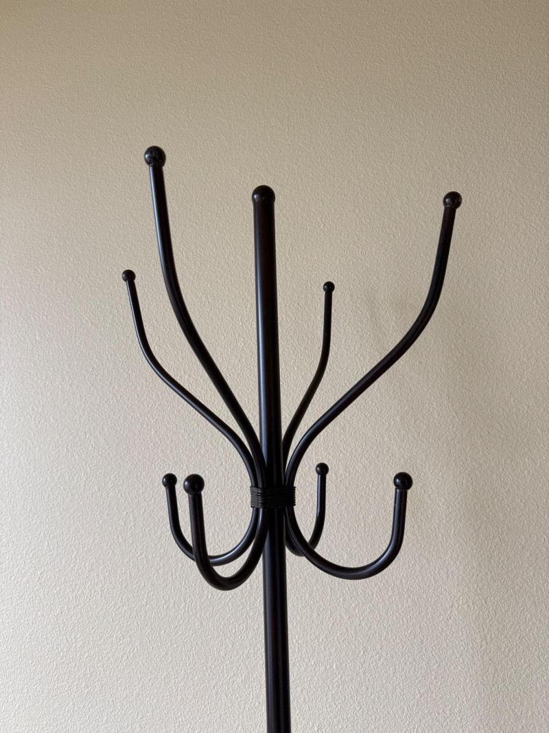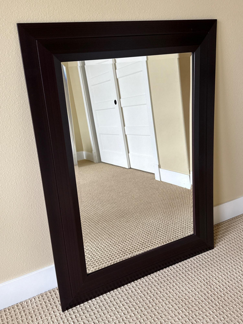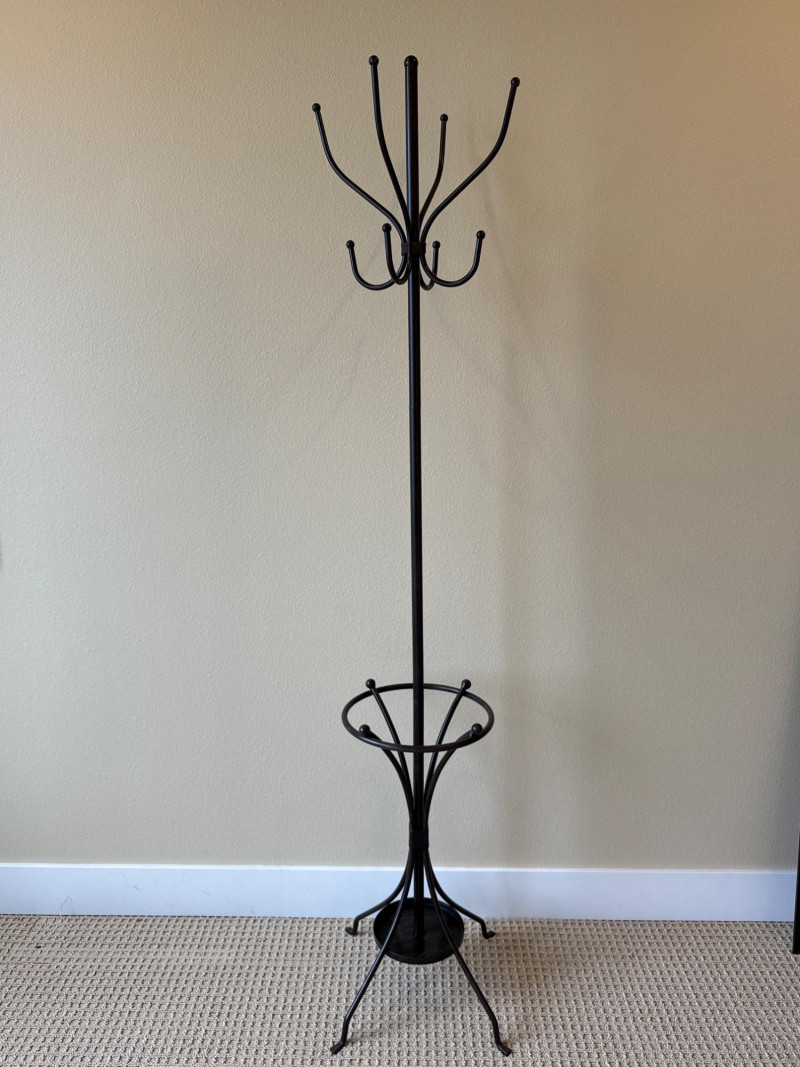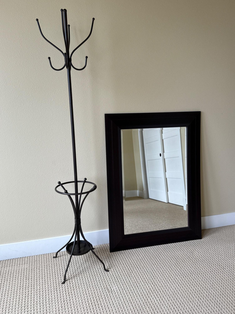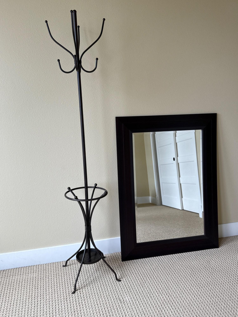 Two classic pieces for any home, office or shop. Both are in great condition. A black metal coat rack in a modern, minimalist design. Dimensions are 14 inches wide, 74 in tall Large rectangular mirror with a dark wooden frame. Its heavy and has mounting hardware on back. Mirror dimensions are 35in wide, 47in long.